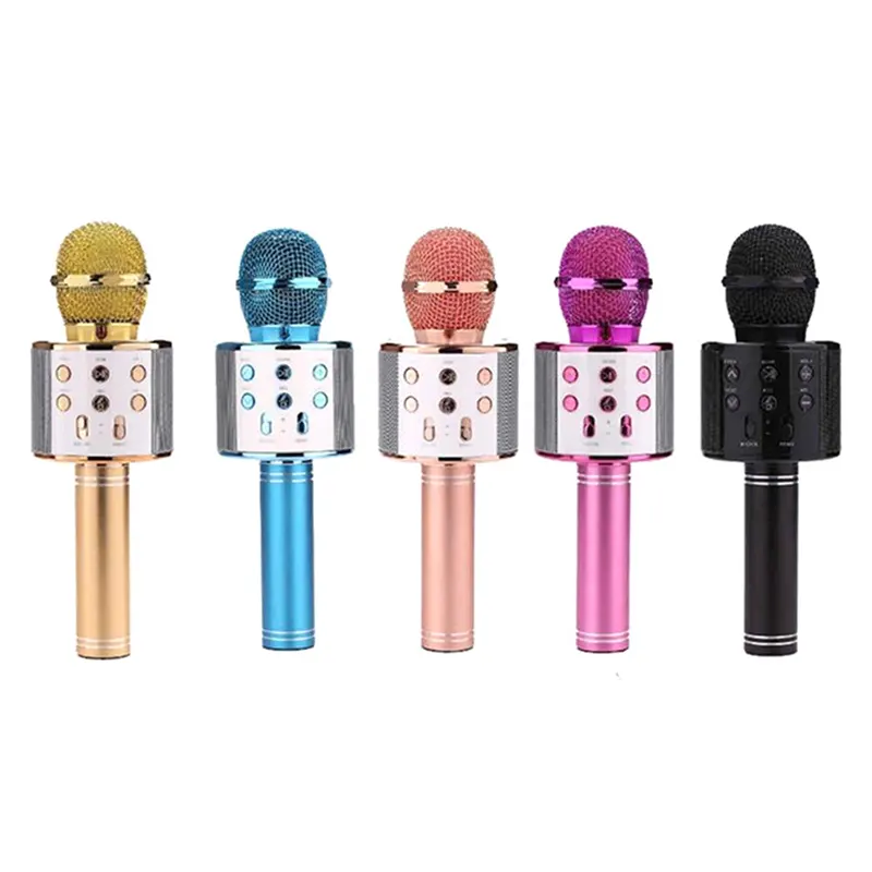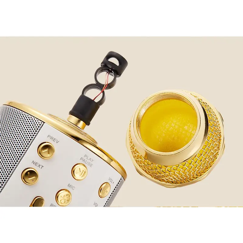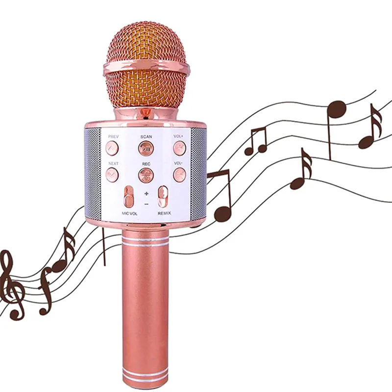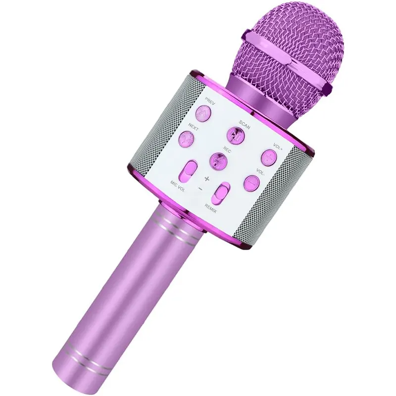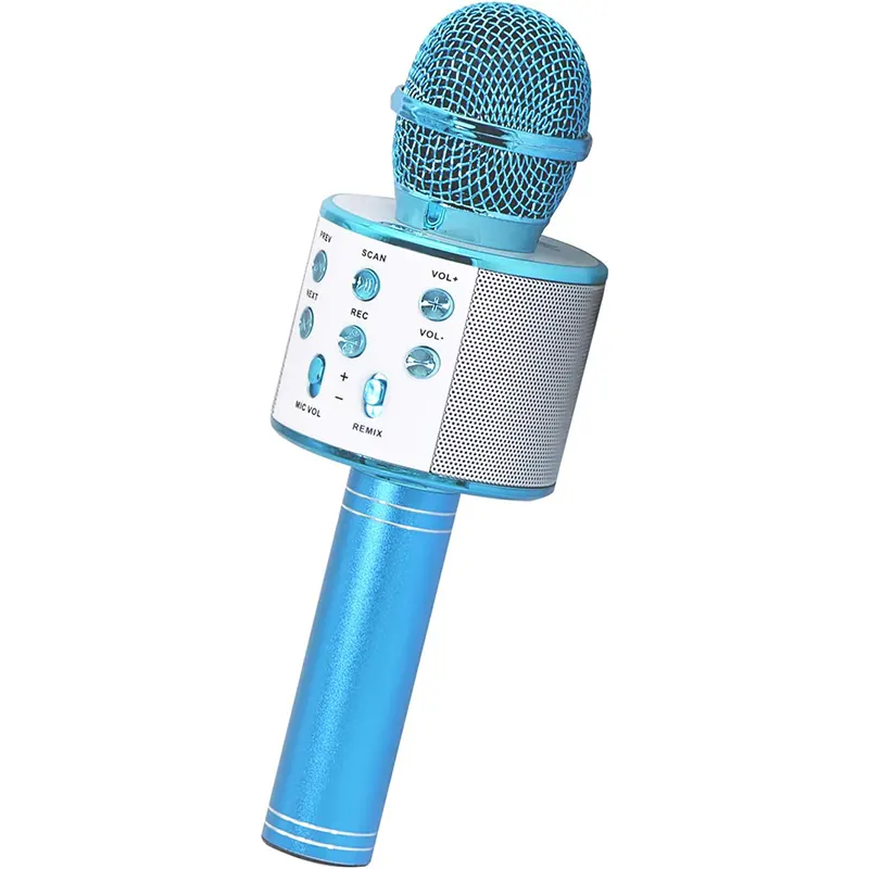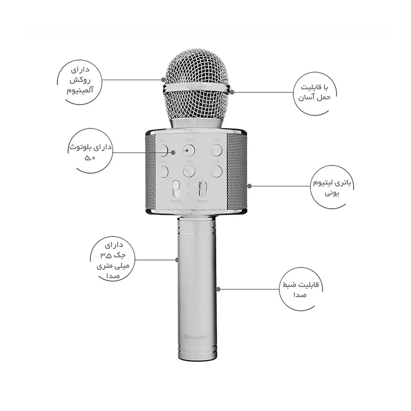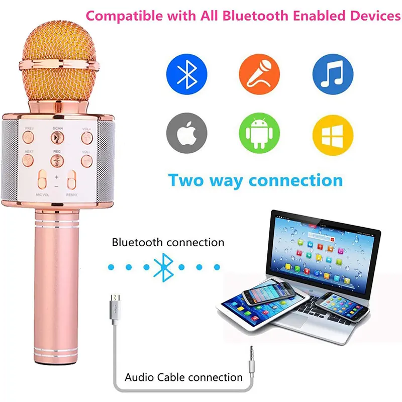 میکروفون اسباب بازی بلوتوثی اسپیکر دار کد WS858 یک میکروفون بسیار جالب و سرگرم کننده است که از طریق سیم ( کابل AUX ) و یا از طریق بلوتوث به سایر ستگاه ها مانند موبایل و کامپیوتر متصل می شود. در ساخت میکروفون از پلاستیک مرغوب ABS و روکش آلمینیومی استفاده شده است که علاوه بر زیبایی، استحکام بالایی به آن بخشیده است. برای پخش فایلهای صوتی خود از طریق اسپیکر چندین راه وجود دارد که بهترین آن اتصال بیسیم از طریق بلوتوث (دستگاههای اندرویدی و ios) است. همچنین از طریق درگاه USB، شیار کارت حافظه و کابل AUX نیز قادر هستید تا آهنگهای خود را با کیفیت بالا پخش کنید.