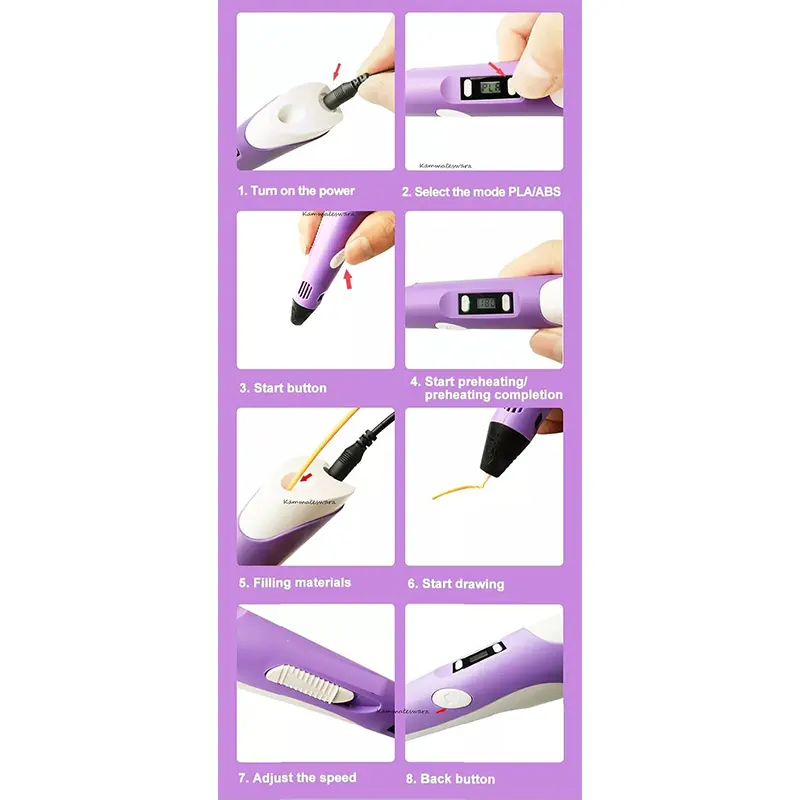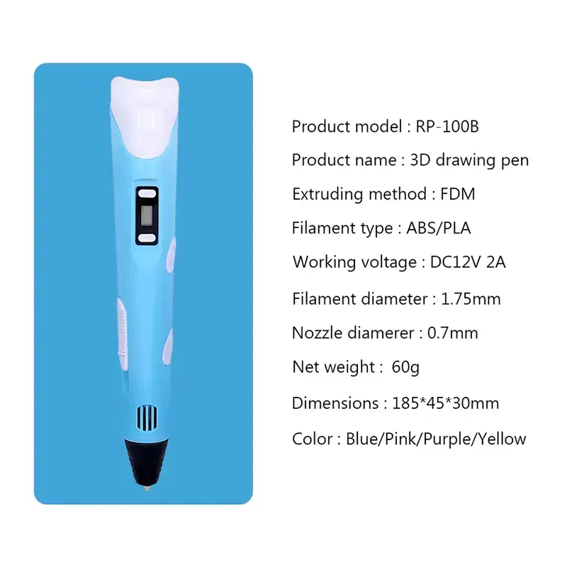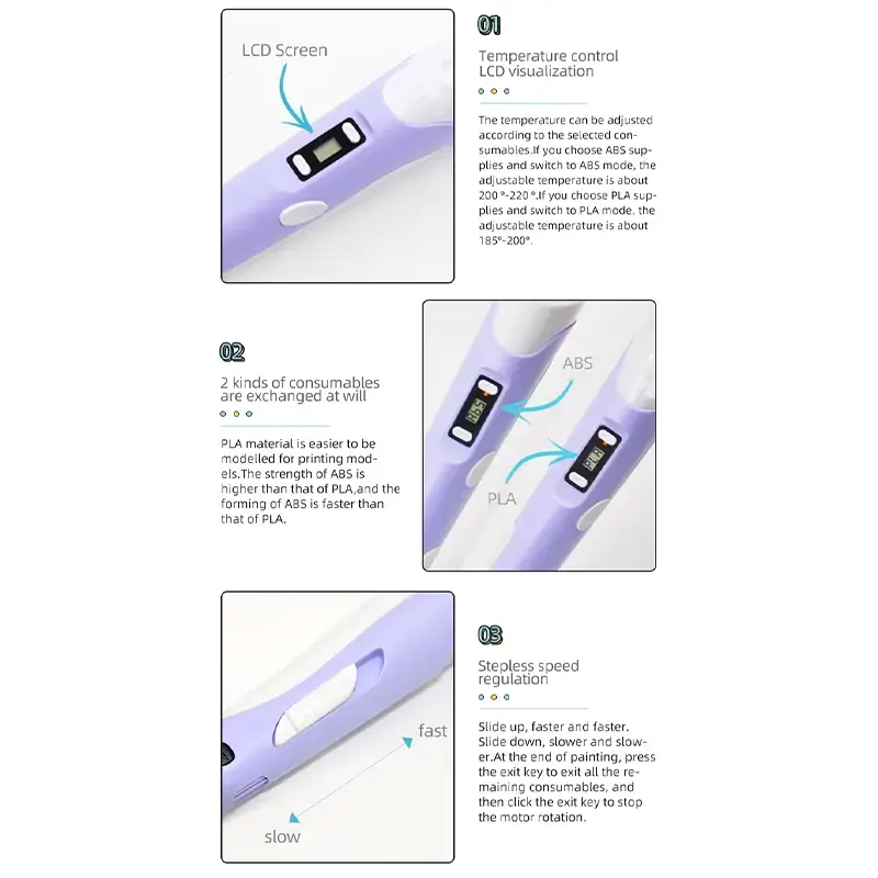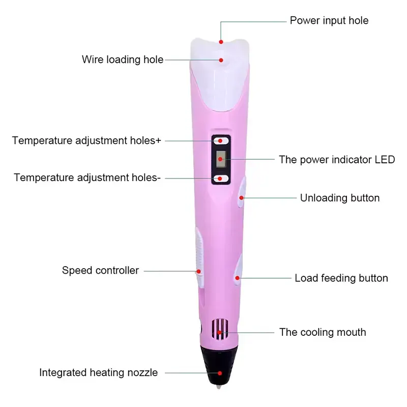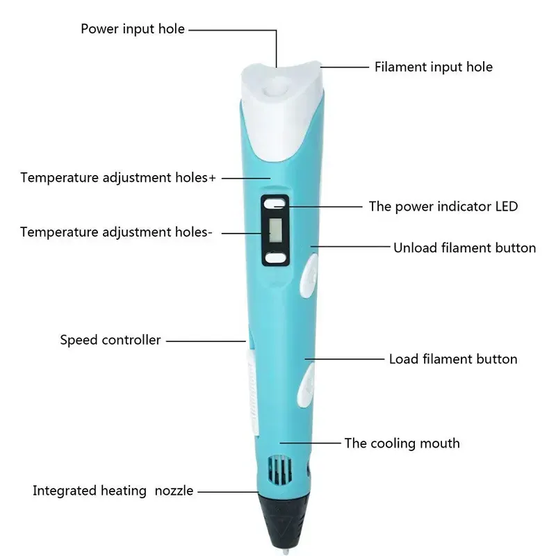 قلم طراحی سه بعدی با فیلامنتهای رنگی که از مواد ارگانیک PLA، یا پلاستیک ABS ساخته شدند، کار میکند. این قلم حرارتی دارای محافظ حرارتی می باشد و برای کودکان در سنین 9 سال و بالاتر ایمن است، این مجموعه شامل قلم طراحی و 3 فیلامنت رنگی 2 متری، کابل شارژ USB، دفترچه راهنما و پایه نگهدارنده است؛ جنس فیلامنت ها از مواد آلی مانند ذرت یا نیشکر میباشد که کاملا غیر سمی است و هنگام بازی بوی نامطبوعی از آن منتشر نمی شود. قلم طراحی سه بعدی همچنین دارای قابلیت تنظیم دما و سرعت خروج مواد است که به همین دلیل میتوانید به طور کامل روی ساخت و طراحی سازه سه بعدی خود کنترل کامل داشته باشید.