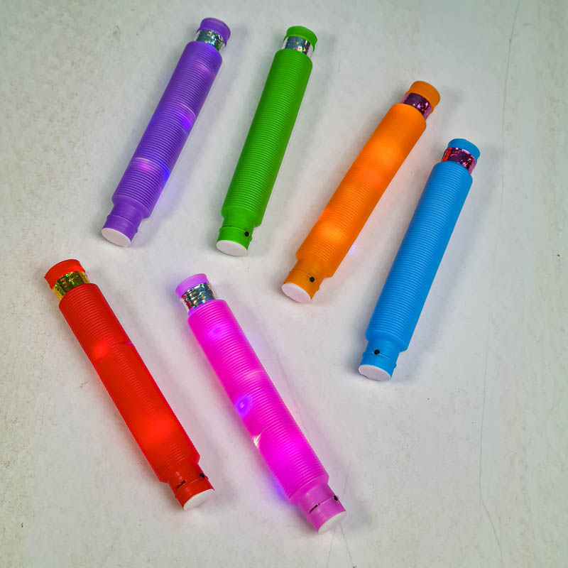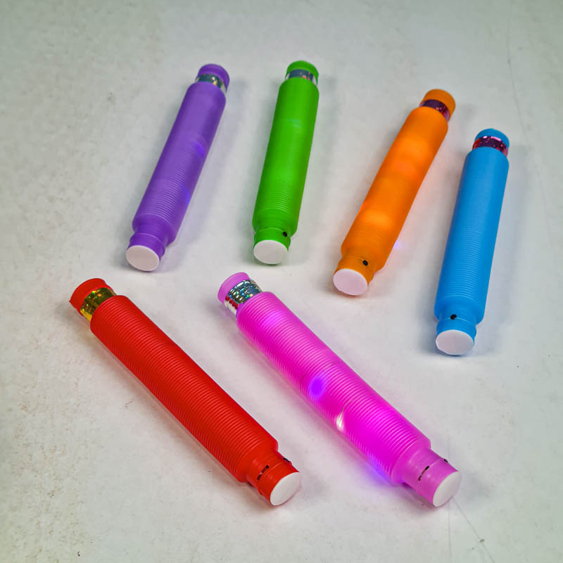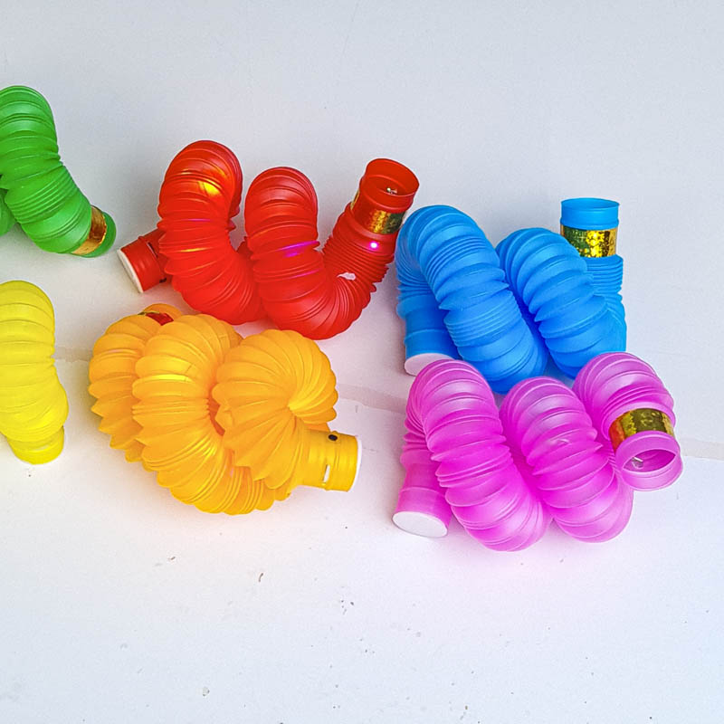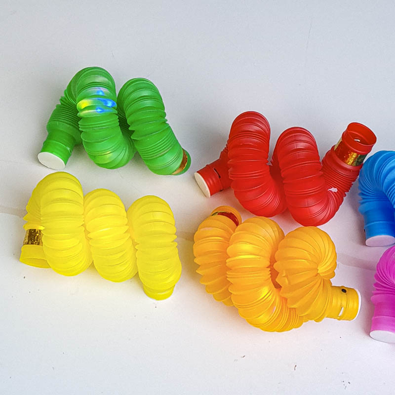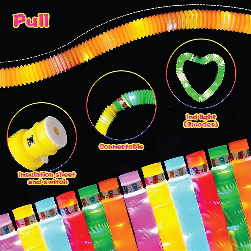 لوله های فنری حسی چراغدار یک وسیله کاهنده استرس است. لوله های حسی یک بازی پایان باز نام گذاری شده است زیرا بی نهایت بازی میتوان با استفاده از خلاقیت طراحی و اجرا کرد. اولین و ابتدایی ترین کاربرد این وسیله تقویت عضلات و حس شنوایی کودک میباشد و بعد از آن میتوان با اتصال این لوله های رنگی فنری بازی های مختلفی طراحی کرد. این محصول در حالت بسته 18.5 سانت طول و در حالت باز شده 62 سانت میباشد