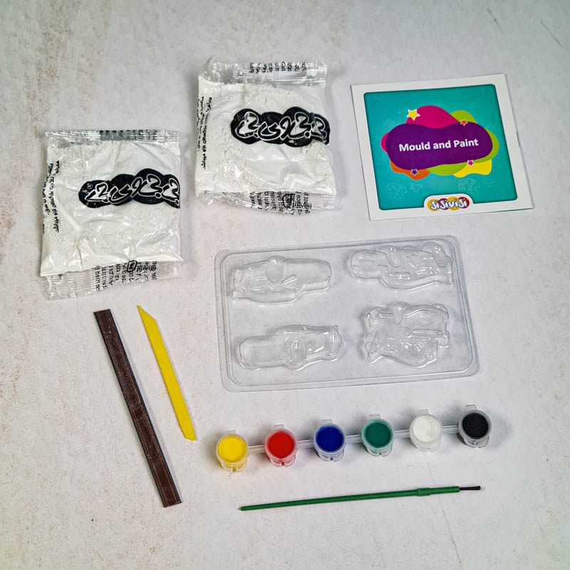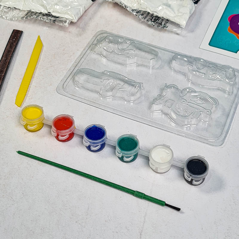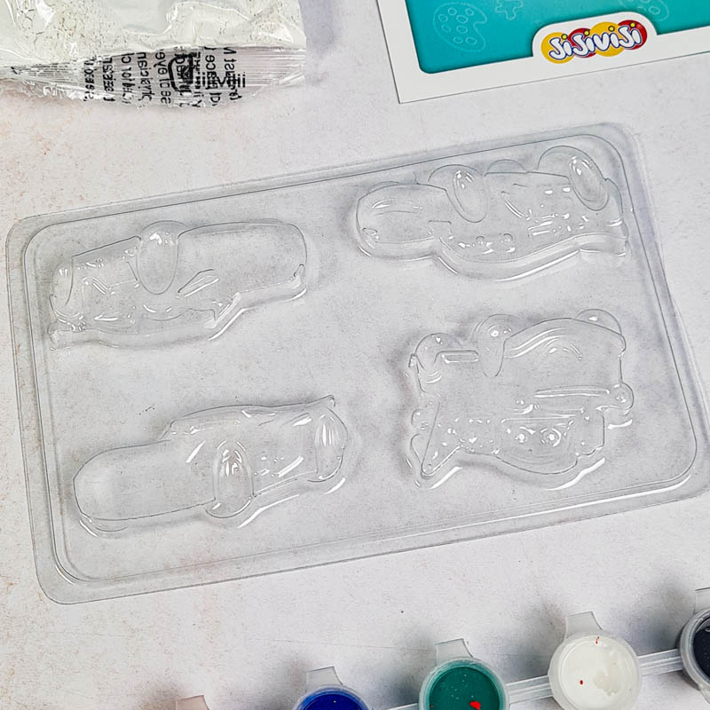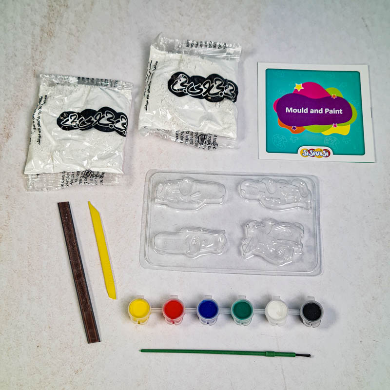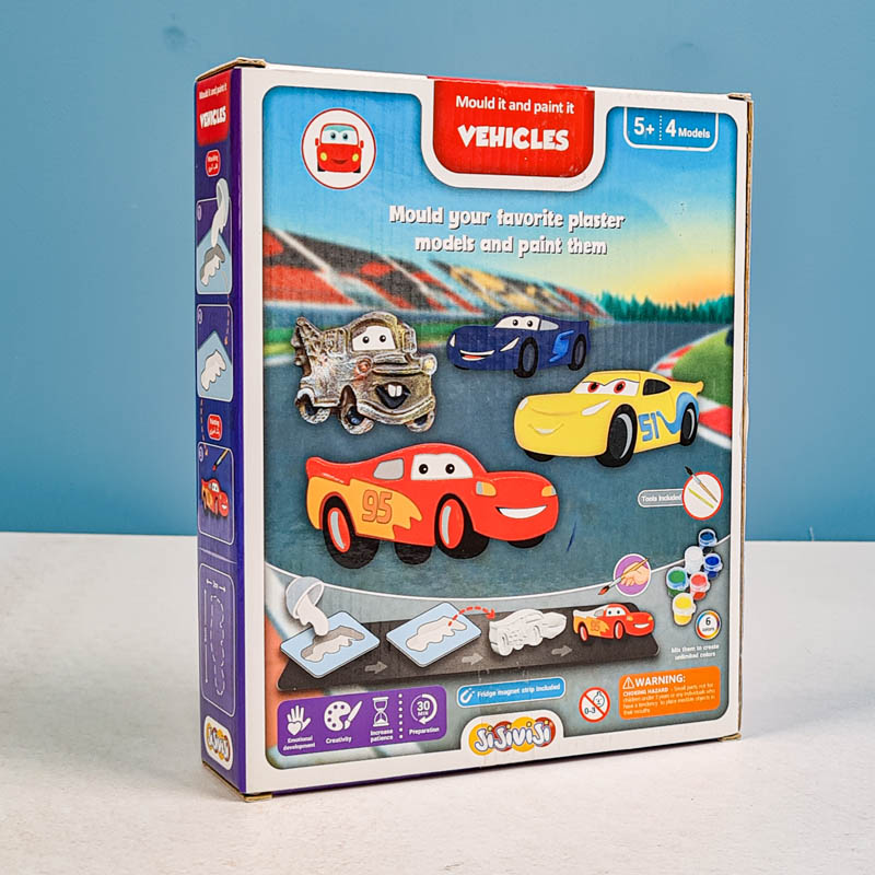 کیت قالب گیری و رنگ آمیزی ماشین ها برای کودکان بالای 5 سال ایده آل است. با این اسباب بازی ساختنی ماشین های مسسابقه بسازید و آن را به در یخچال و... بچسبانید. این ست شامل رنگ 6 عددی، قلم مو، 2 بسته پودر گچ، مگنت، کاردک و کاغذ راهنما است.