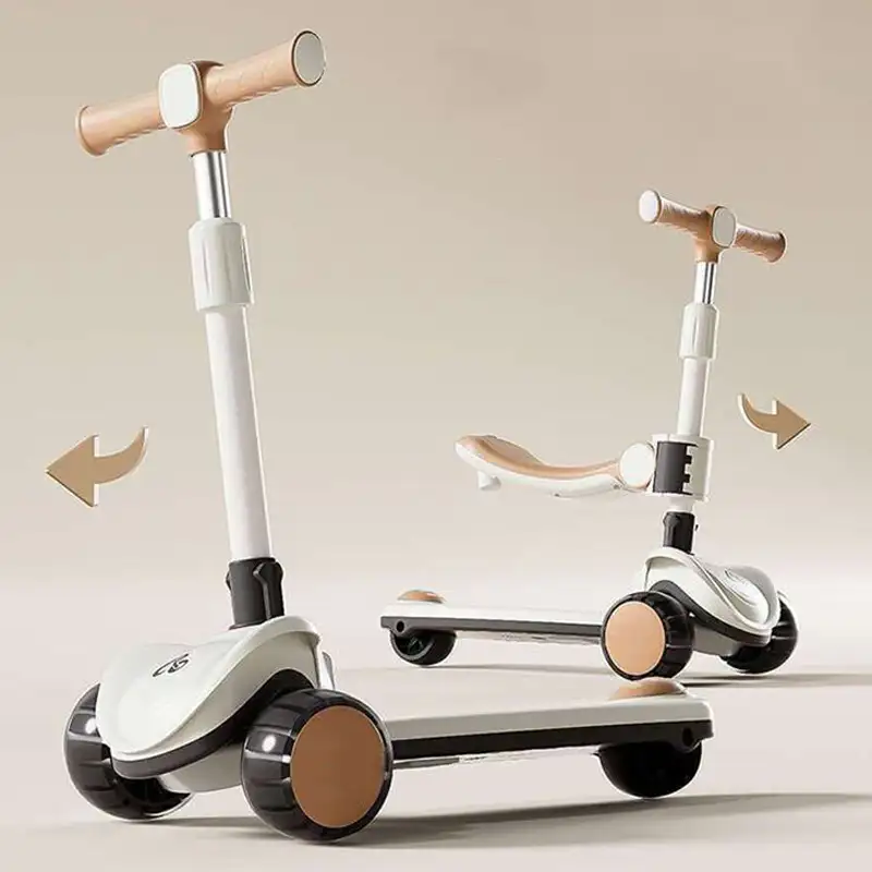 اسکوتر کودک تاشو نشیمن دار قهوه ای با داشتن نشیمن برای ایستادن یا نشستن کودکان 2 تا 6 سال مناسب است. دارای 3 چرخ برای حفظ تعادل کامل کودک یک اسباب بازی دخترانه و اسباب بازی پسرانه هیجان انگیز است. اسکوتر کودک تاشو نشیمن دار توسط مؤسسه استانداردها تأیید شده است که مناسب برای یادگیری کودکان است. دستهاسکوتر قابلیت تنظیم ارتفاع دارند. این اسکوتر دارای چراغ LED در چرخها می باشد. استفاده از این اسکوتر کودک بسیار آسان است. با توجه به مواد بادوام و دستههای قابل تنظیم ارتفاع، کودک شما میتواند برای مدت زمان طولانی از این اسکوتر کودک استفاده کنند. اسکوتر کودک تاشو یک اسکوتر کودک است که همراه با کودک شما رشد خواهد کرد. دسته این اسکوتر قابلیت تنظیم ارتفاع در 3 حالت دارد و تا 50 کیلوگرم در حالت اسکوتر و 25 کیلوگرم در حالت نشیمن تحمل وزن دارد. این اسکوتر دارای 3 چرخ است و برای حرکت به چپ و راست، کافیست دسته ی اسکوتر را همان طور که قرار دارد، به سمت چپ و راست فشار دهید و دیگر نیاز نیست دسته اسکوتر را حول محور نیم دایره ای بچرخانید. اسکوتر بچه گانه بر روی چرخ عقب خود یک ترمز نیز دارد. این مدل دارای تایرهای بزرگ و پایدار به همراه LED، ترمز چرخ عقب، پایه ضد لغزش و دستگیره های لاستیکی نرم است.