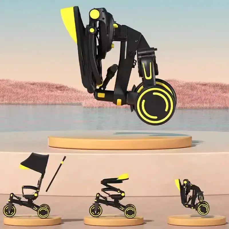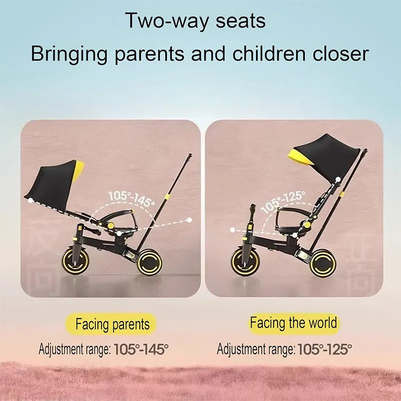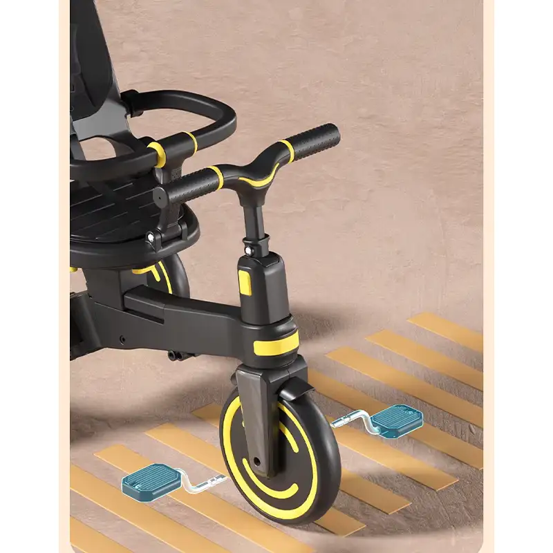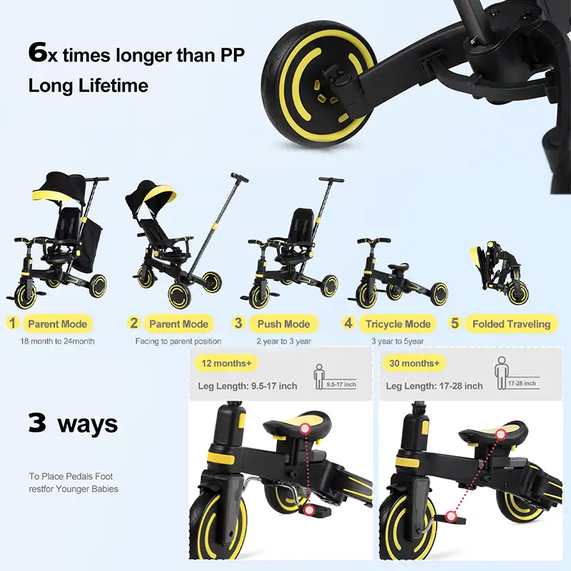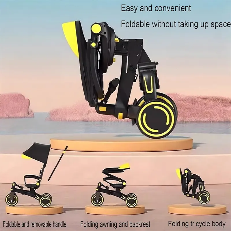 سه چرخه کودک جدید تنها با یک کلیک در چند ثانیه تا می شود و باز می شود و میتوان از آن در صندوق عقب ماشین و در کابین هواپیما قرار داد. این سه چرخه مسافرتی به عنوان کالسکه کودک نیز جایگزین مناسبی خواهد بود و تا 30 کیلوگرم تحمل وزن دارد. همانطور که میدانید با رکاب زدن عضلات کودک تقویت میشود. همچنین با خارج کردن پدال سه چرخه (زمانی که کودک توانایی کنترل سه چرخه را به تنهایی نداشته باشد) میتواند کنترل کامل سه چر را به دست بگیرید و با حرکت دسته کنترل سه چرخه را هدایت کنید. سه چرخه کودک قابلیت تنظیم پشتی صندلی را دارد و همچنین به دلیل داشتن کمربند با مهار 5 نقطه ای ایمنی کودک را حفظ میکند. این سه چرخه دارای یک جا پایی میانی است که هر زمان کودک احساس خستگی کرد پای خود را روی آن قرار دهد. سه چرخه کودک از پلیمرهای تقویتشده با الیاف درجه یک، چرخهای نرم بادوام، پروفیلهای فولادی ضد زنگ و دستههای چوبی، برای دوام طراحی شده است.