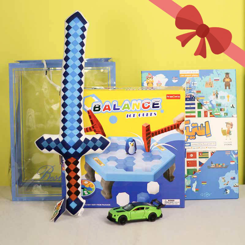 هدیه روز کودک بچه ها یادت نره! سعی کردیم که انتخاب رو براتون راحت کنیم و چند تا هدیه کاربردی و جذاب و با قیمت و پیشنهاد ویژه براتون آماده کنیم. این پک هدیه ویژه پسرانه سری 2 شامل ماکت ماشین عقب کش، بازی فکری پینگو بالانس، شمشیر پولیشی ماینکرفت، استیپیک نقشه جهان می باشد که در یک باکس هدیه زیبا برای شما ارسال می شود. یک کارت تبریک روز کودک هم در این باکس قرار میگرد. رنگ باکس و ماشین ممکن است متفاوت باشد.