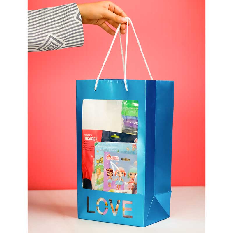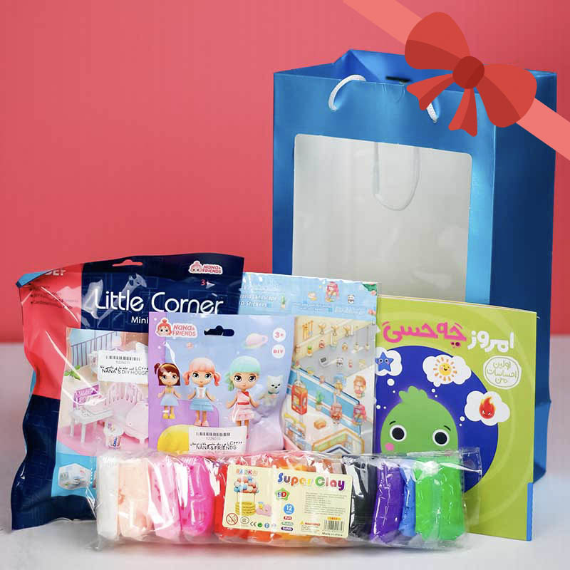 هدیه روز کودک بچه ها یادت نره! سعی کردیم که انتخاب رو براتون راحت کنیم و چند تا هدیه کاربردی و جذاب و با قیمت و پیشنهاد ویژه براتون آماده کنیم. این پک هدیه ویژه دخترانه سری 1 شامل عروسک شانسی نانا و دوستان، کیت خانه سازی شانسی نانا و دوستان، خمیر بازی 12 عددی کلی، استیکر سه بعدی و کتاب کودک می باشد که در یک باکس هدیه زیبا برای شما ارسال می شود. یک کارت تبریک روز کودک هم در این باکس قرار میگرد. رنگ باکس و طرح استیکر و کتاب ممکن است متفاوت باشد.