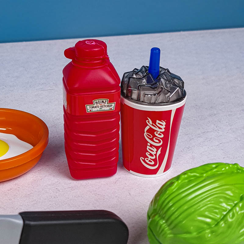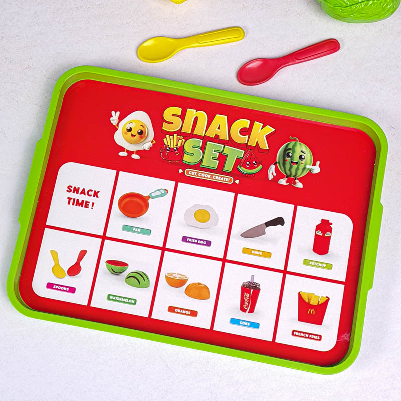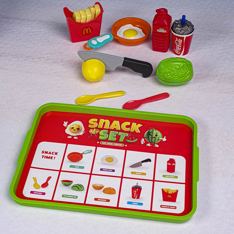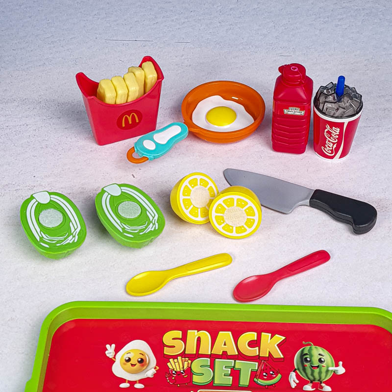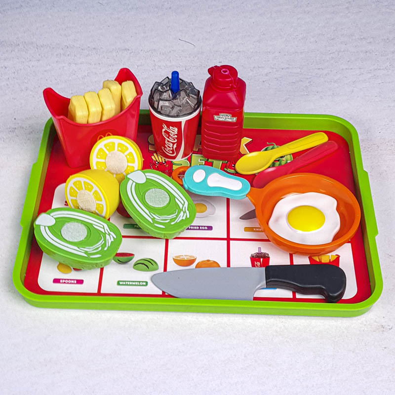 - این ست شامل سینی، سیب زمینی سرخ شده، نوشابه، سس کچاپ، ماهیتابه، نیمرو، هندوانه، پرتقال، چاقو، قاشق