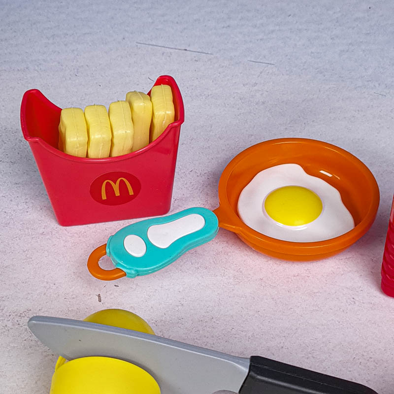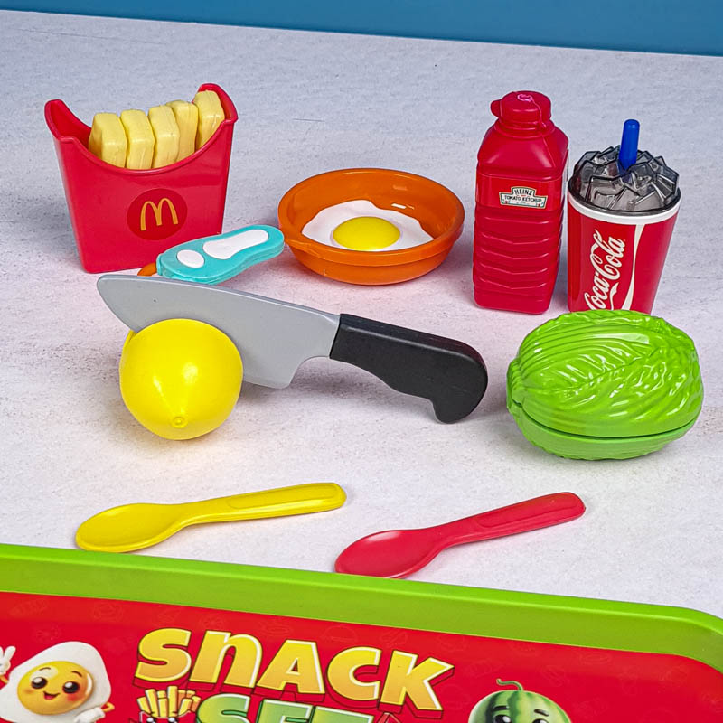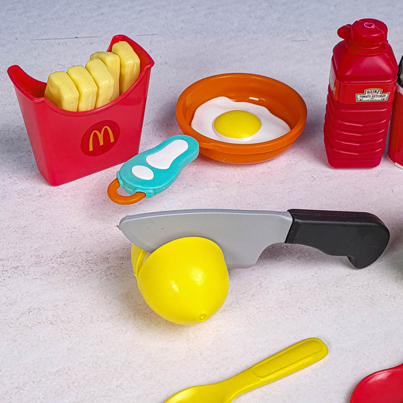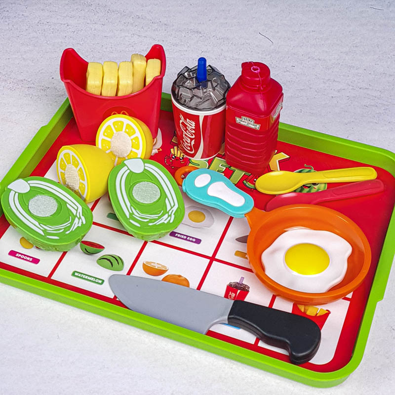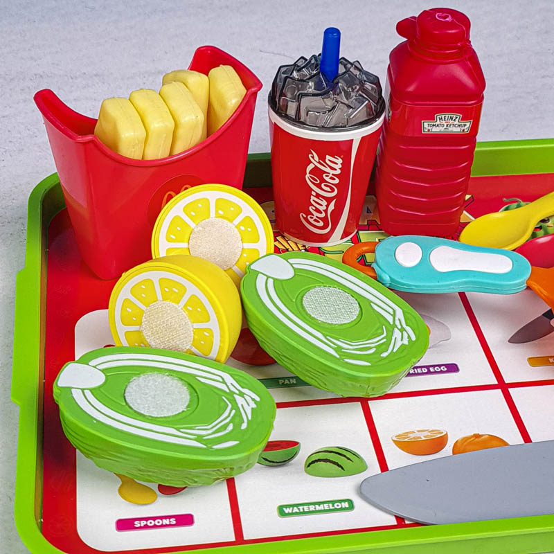 اسباب بازی ست برش فست فود! با استفاده از چاقوی پلاستیکی همراه محصول میوه ها را تکه تکه کنید و در سینی قرار دهید. این ست شامل 19 تکه سینی، سیب زمینی سرخ شده، نوشابه، سس کچاپ، ماهیتابه، نیمرو، هندوانه، پرتقال، چاقو، قاشق میباشد و مناسب کودکان بالای 3 سالست.
