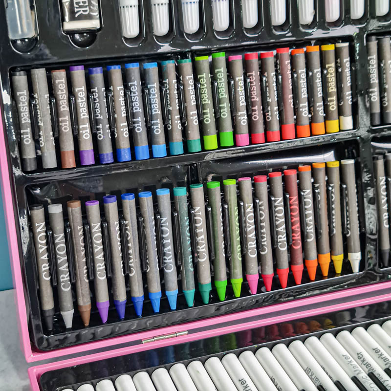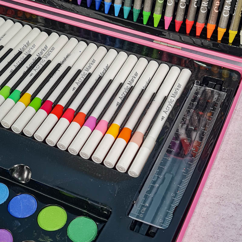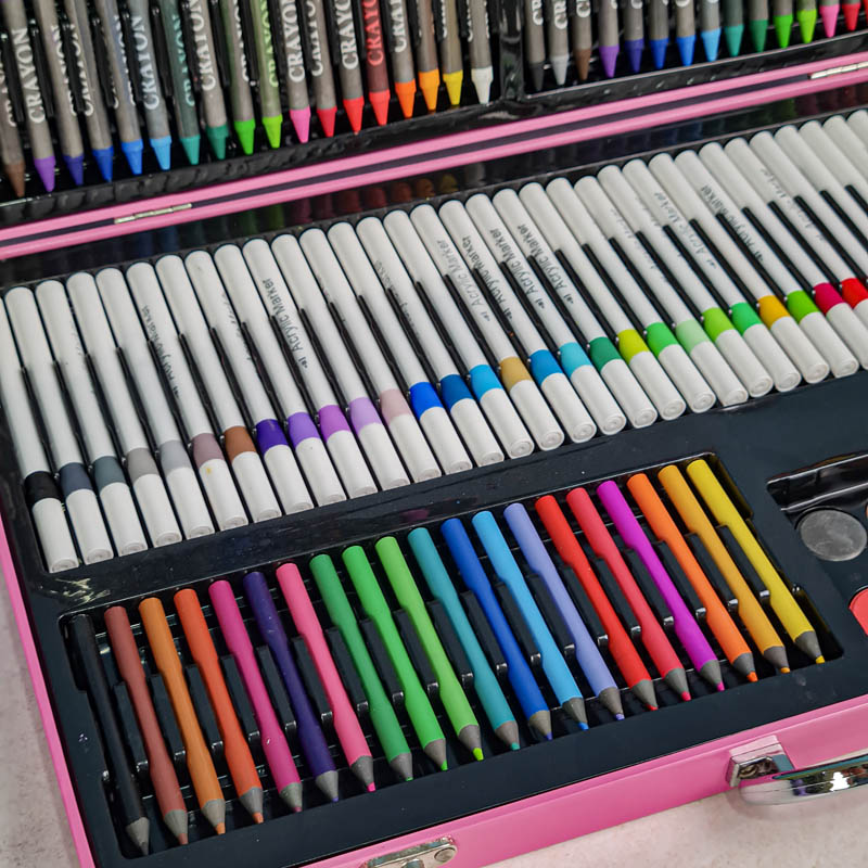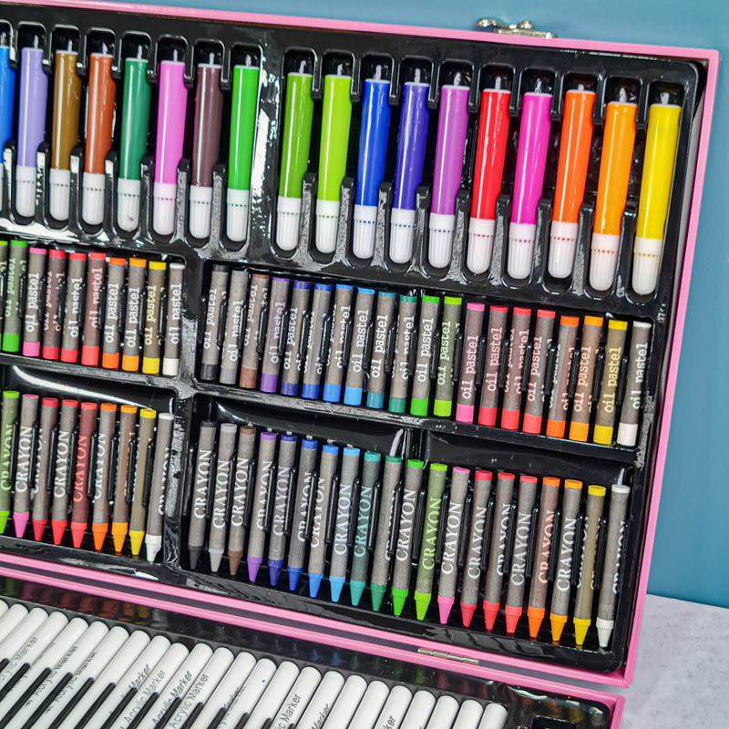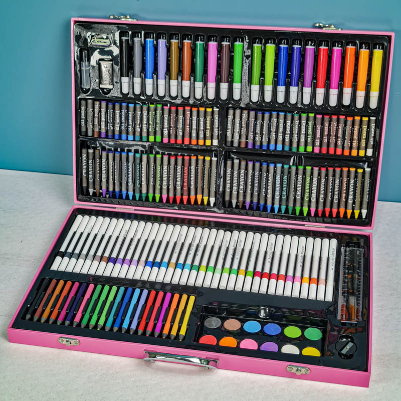 ست نقاشی 180 تکه شامل: 20 عدد مداد رنگی، 12 عدد آبرنگ، 36 عدد ماژیک آکریلیک، 80 مداد شمعی،20 عدد ماژیک، مداد تراش، مداد، قلم مو، پاک کن، چسب، کلیپس می باشد.