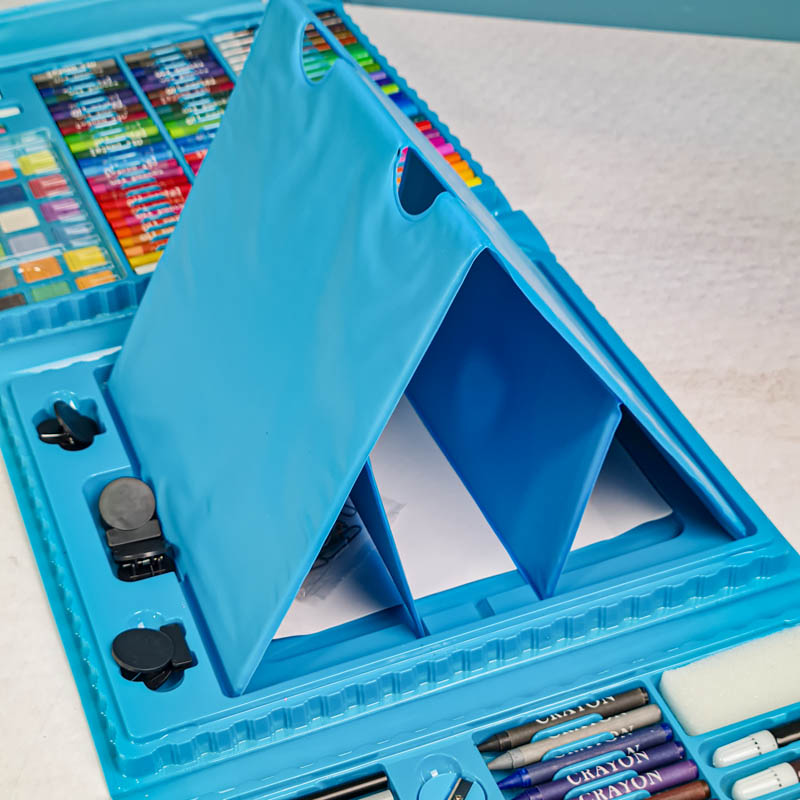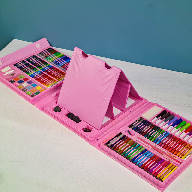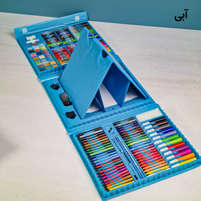 کیف ست نقاشی 208 تکه آلبومی، یک محصول همه فن حریف است. به کودک شما کمک می کند تا بتواند تمامی ابزار نقاشی و رنگ آمیزی را یک جا در اختیار داشته باشد. این کیف هنری به صورت 180 در جه باز میشود و در دو طرف ابزار نقاشی به صورت جداگانه دارد. در وسط این ست نقاشی استندی بری قرار گرفتن کاغذ و نقاشی کشیدن وجود دارد. ابعاد این کیف نقاشی به حمل آسانش توسط کودک شما کمک می کند. کیف نقاشی از جنس نایلونی محکم و فشرده ای تشکیل شده است که اصلا خرب نمیشود و دارای چسب می باشد که مانع از باز شدن درب کیف و بیرون ریختن لوازم می شود. یک هدیه بی نظیر و جذاب به دانش آموزان و هنرمندان است.