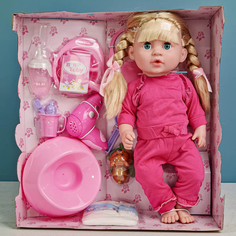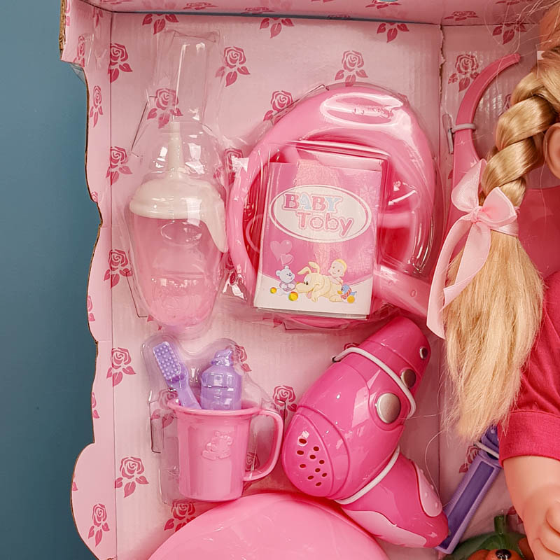 - عروسک دخترانه با پیراهن، لیوان، سشوار، مسواک و خمیر دندان،ظرف غذا، قاشق، گارشو، شیشه شیر، پوشک، پیشبند و....