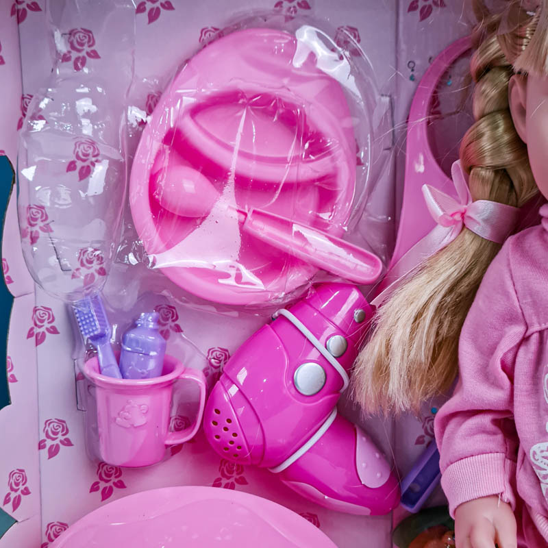 - عروسک دخترانه با پیراهن، لیوان، سشوار، مسواک و خمیر دندان،ظرف غذا، قاشق، گارشو، شیشه شیر، پوشک، پیشبند و....