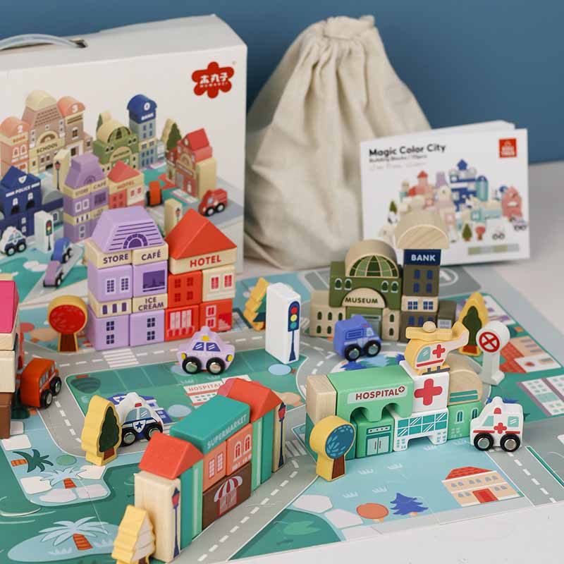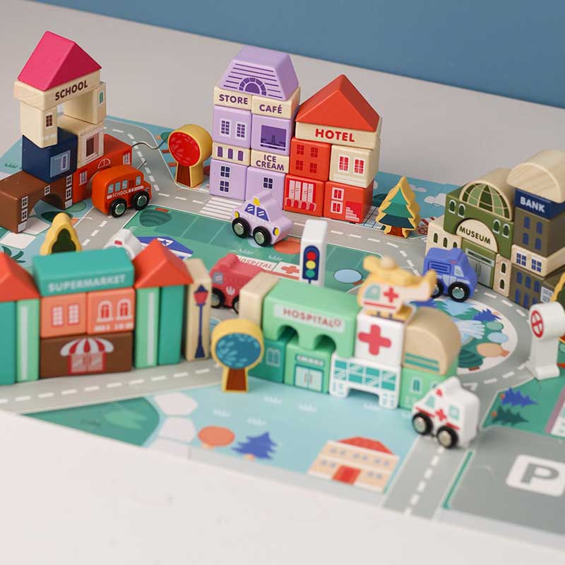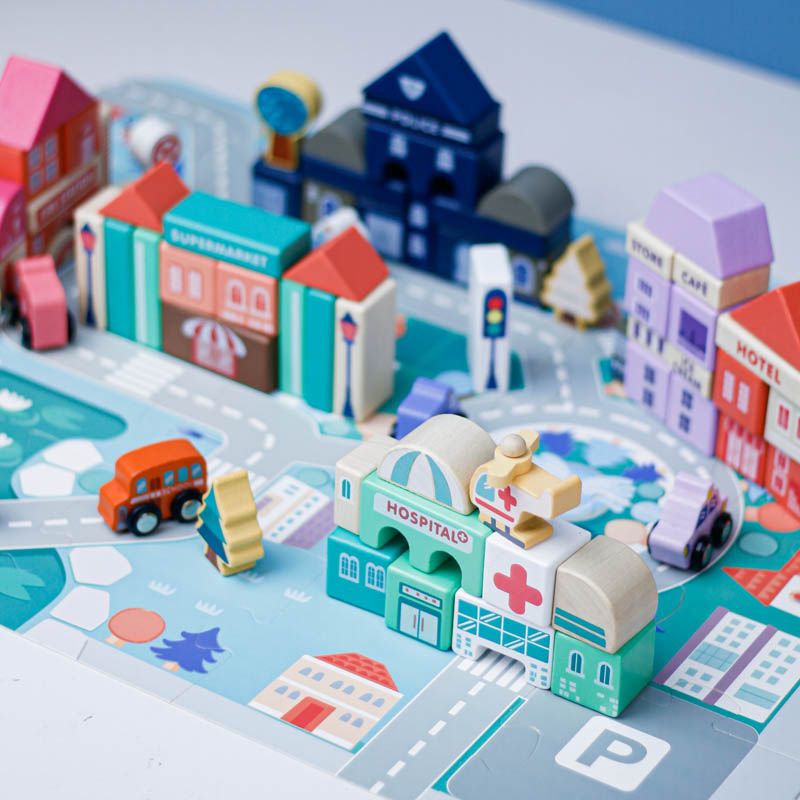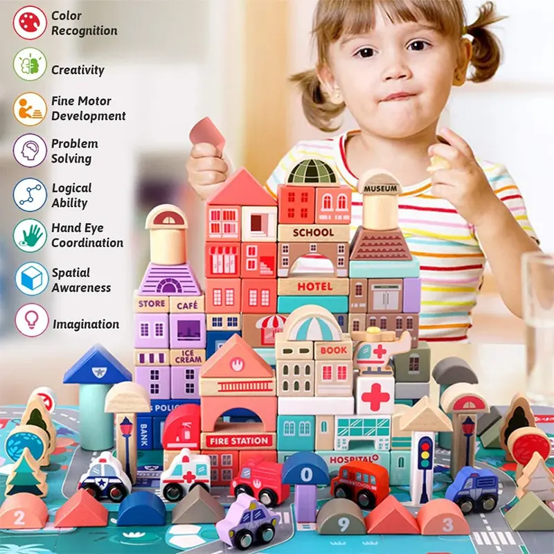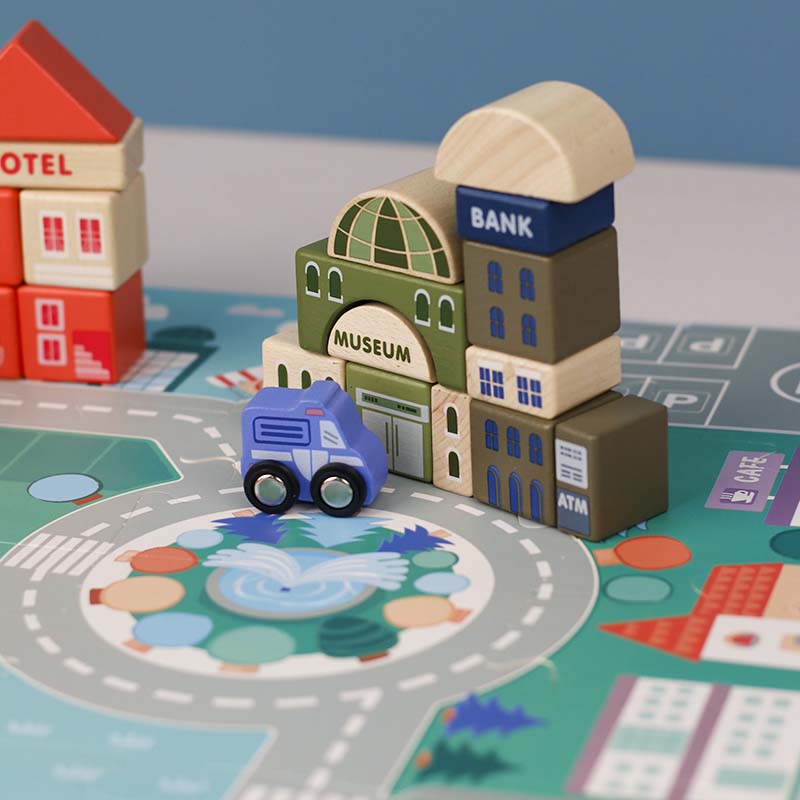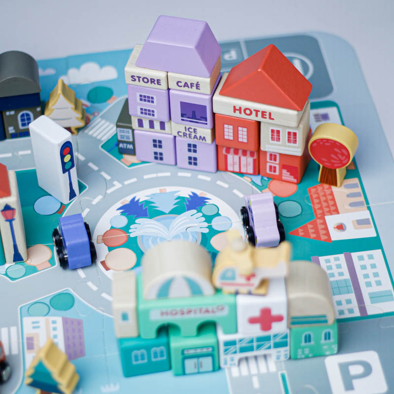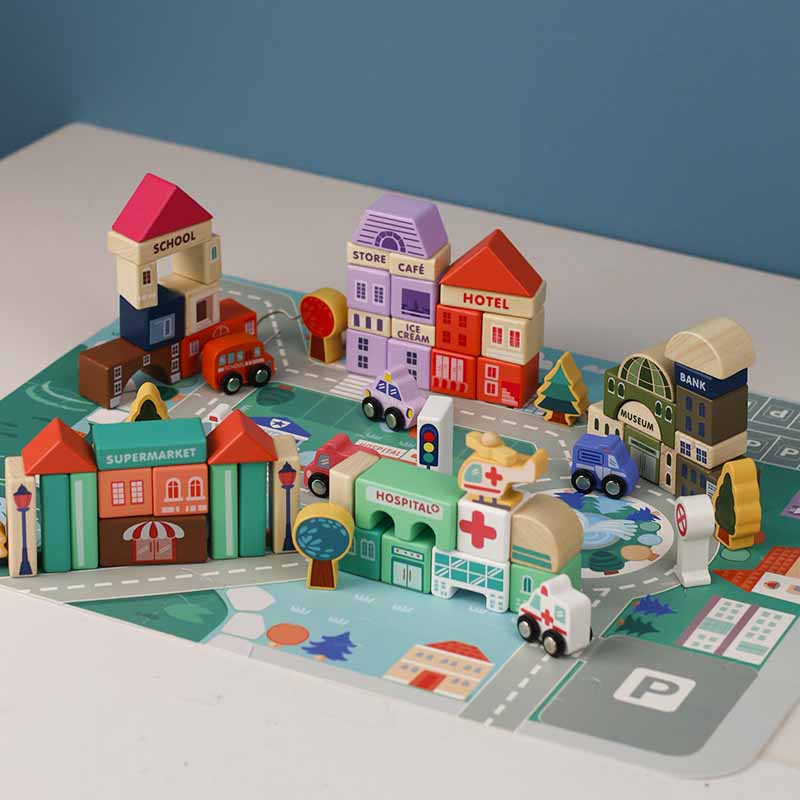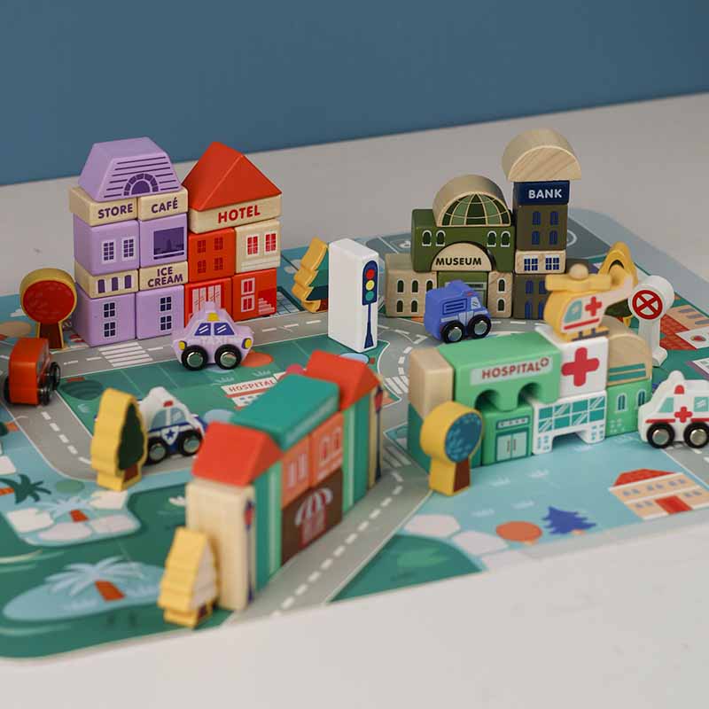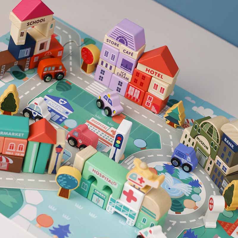 مجموعه بلوک های چوبی ساختنی به کودکان کمک می کند تا یک شهر عالی بسازند. یک صفحه پازلی در این مجموعه وجود دارد که کودک میتواند ساختمان ها را روی آن بسازد و وانمود کند که در یکی از ماشین ها یا وسایل نقلیه برای گردش و تفریح یا برای انجام کار مهم روزانه در شهر رفت و آمد میکند؛ با گذشتن از مدرسه، به بستنی فروشی رسیدید، خودتون رو به یک بستنی مهمان کنید، سپس به سوپرمارکت بروید و برای استراحت به هتل برگردید. یک اسباب بازی عالی برای داستان سرایی، نقش بازی، افزایش خلاقیت، مهارت های دست ورزی، هماهنگی دست و چشم، مهارت های حرکتی ظریف، مهارت های حل مسئله، تشخیص شکل و رنگ کودک است.