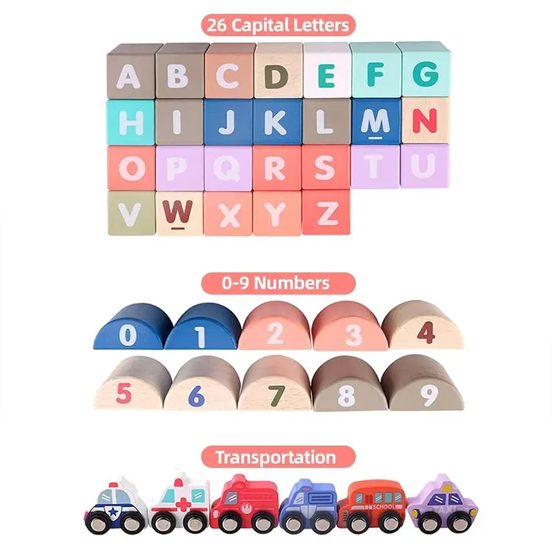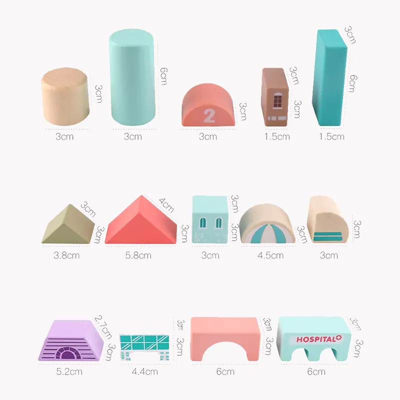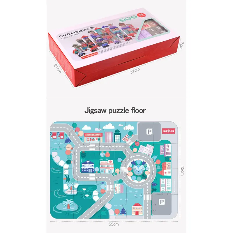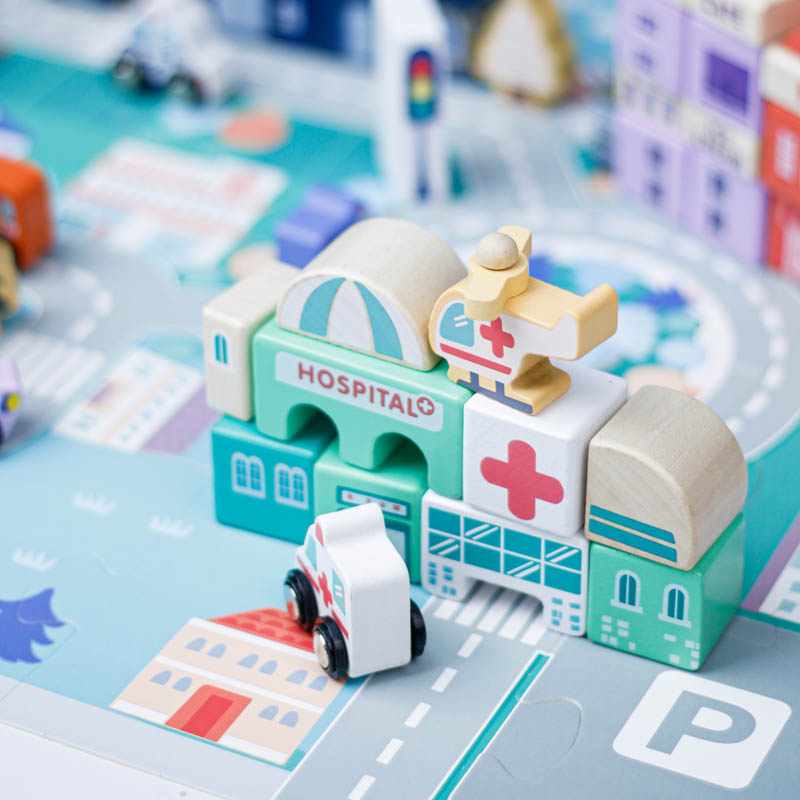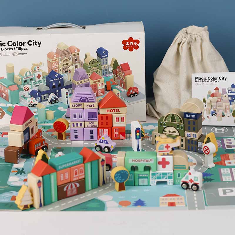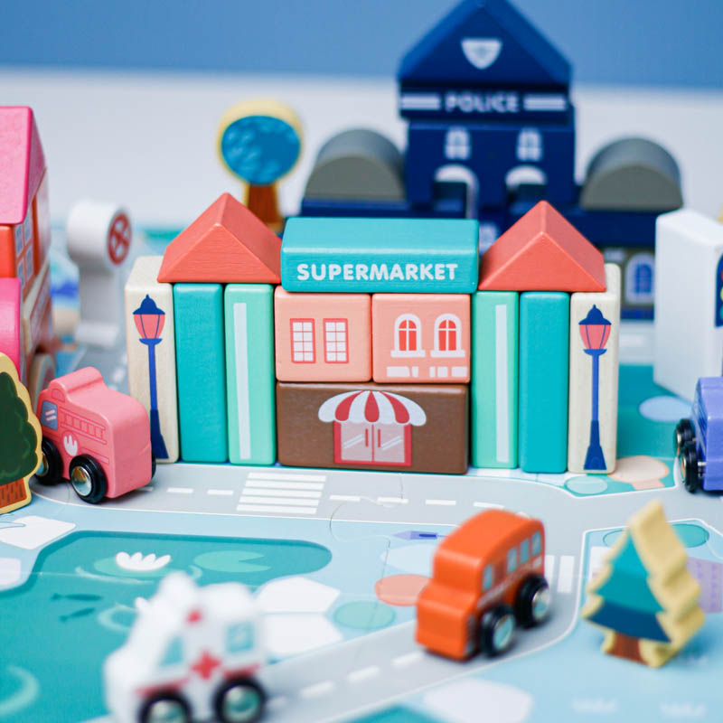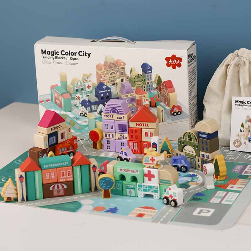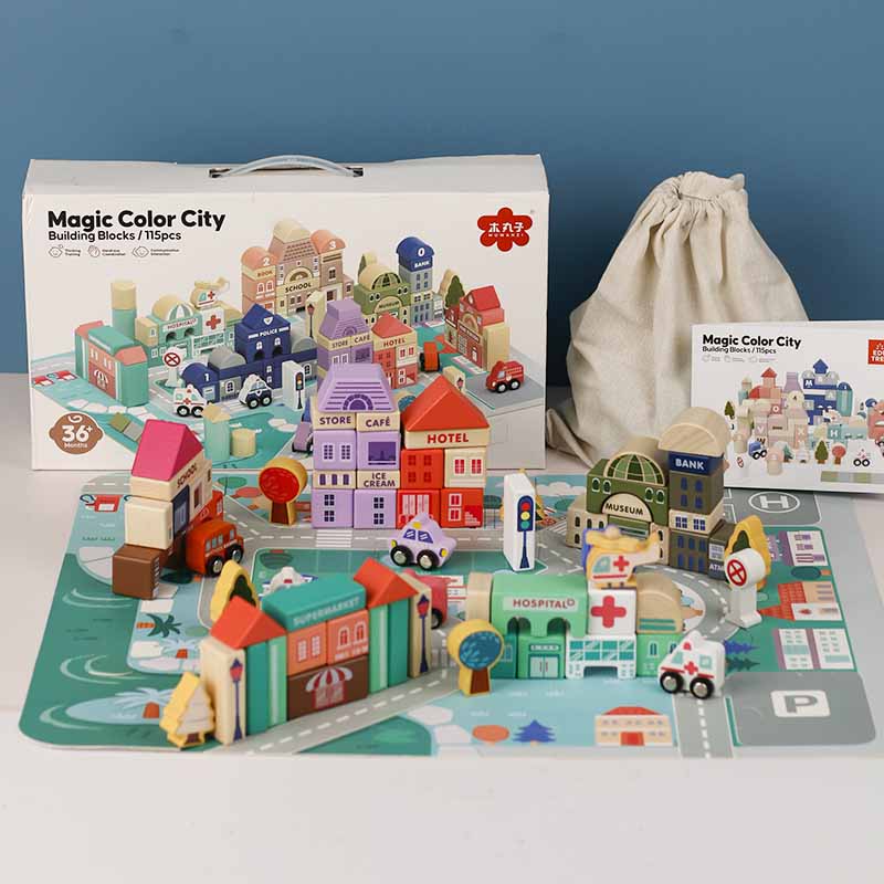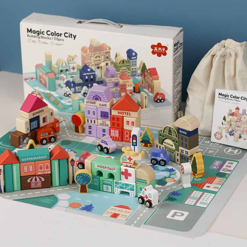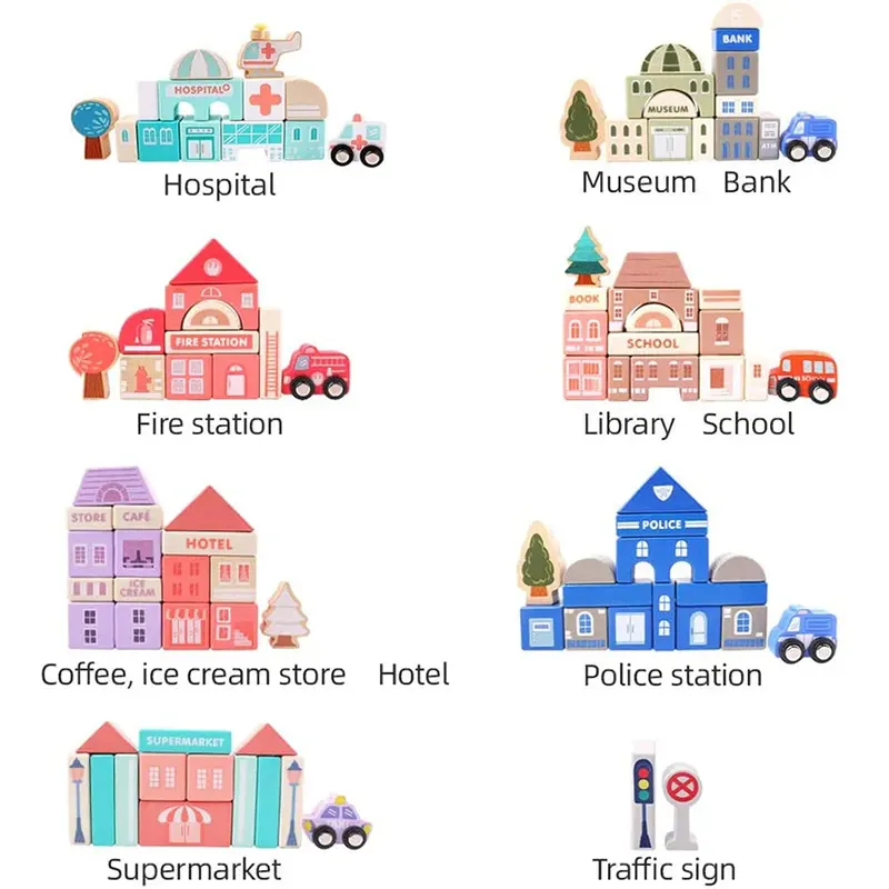 مجموعه بلوک های چوبی ساختنی به کودکان کمک می کند تا یک شهر عالی بسازند. یک صفحه پازلی در این مجموعه وجود دارد که کودک میتواند ساختمان ها را روی آن بسازد و وانمود کند که در یکی از ماشین ها یا وسایل نقلیه برای گردش و تفریح یا برای انجام کار مهم روزانه در شهر رفت و آمد میکند؛ با گذشتن از مدرسه، به بستنی فروشی رسیدید، خودتون رو به یک بستنی مهمان کنید، سپس به سوپرمارکت بروید و برای استراحت به هتل برگردید. یک اسباب بازی عالی برای داستان سرایی، نقش بازی، افزایش خلاقیت، مهارت های دست ورزی، هماهنگی دست و چشم، مهارت های حرکتی ظریف، مهارت های حل مسئله، تشخیص شکل و رنگ کودک است.