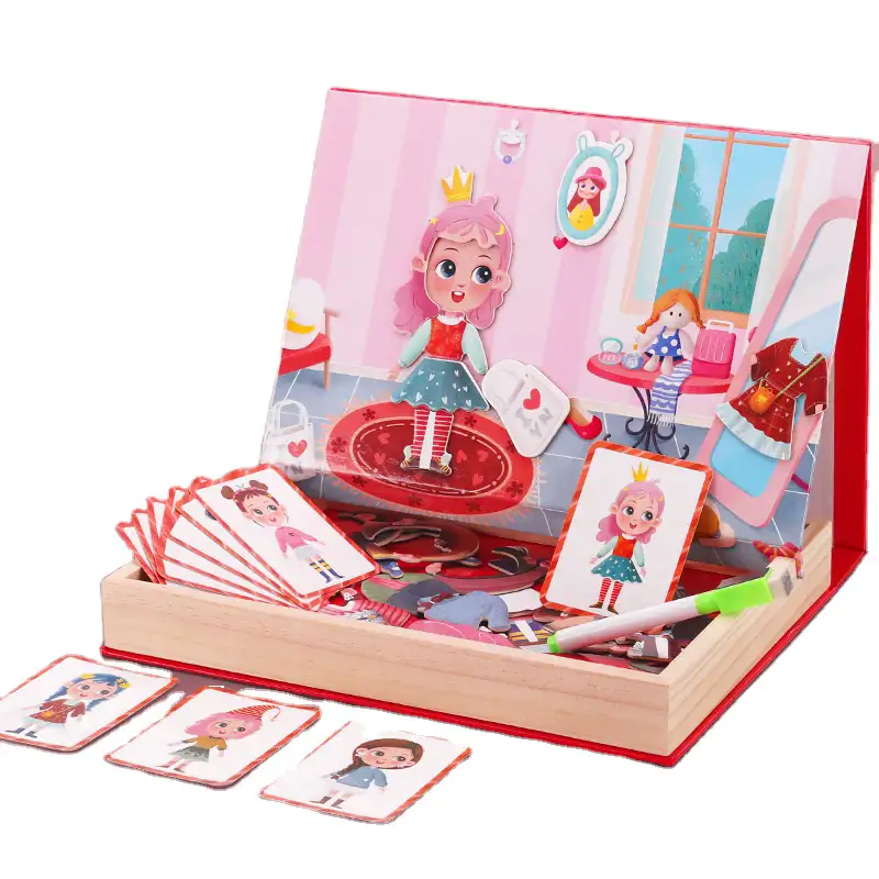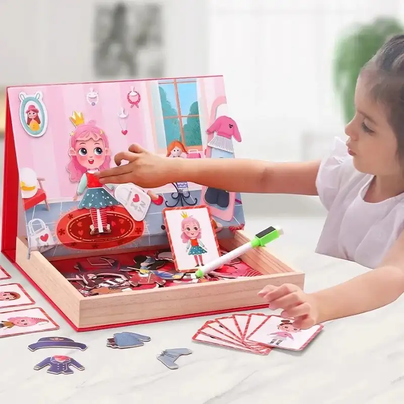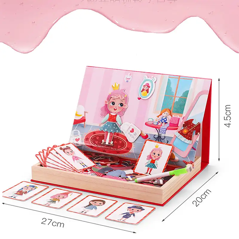 دوست داری به ساراتو لباس پوشیدن کمک کنی؟ دلت میخواد یه خلبان زیبا باشی یا یه پری مهربون؟ یه پرنسس زیبای چینی؟ بازی با قطعات مگنتی یک سرگرمی جذاب برای کوچولوهاست. پازل مگنتی وایت بردی مدل لباس دارای 51 قطعه از لباس های مختلفه که کودک میتونه به کمک 8 عدد از کارت های راهنمای قطعات را جاگذاری کنند و از خلاقیت و تخیلشون در داستان سرایی و نقش بازی کردن استفاده کنند و برای هر لباس داستان و ماجرای مختلف بسازند. این اسباب بازی برای کودکان بالای 3 سال مناسب است. همچنین یک ماژیک وایت برد هم همراه این کتاب هست که بچه ها میتونن روی تخته نقاشی داخل آن نقاشی بکشند و پاکش کنن.