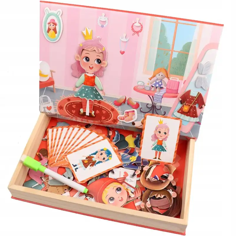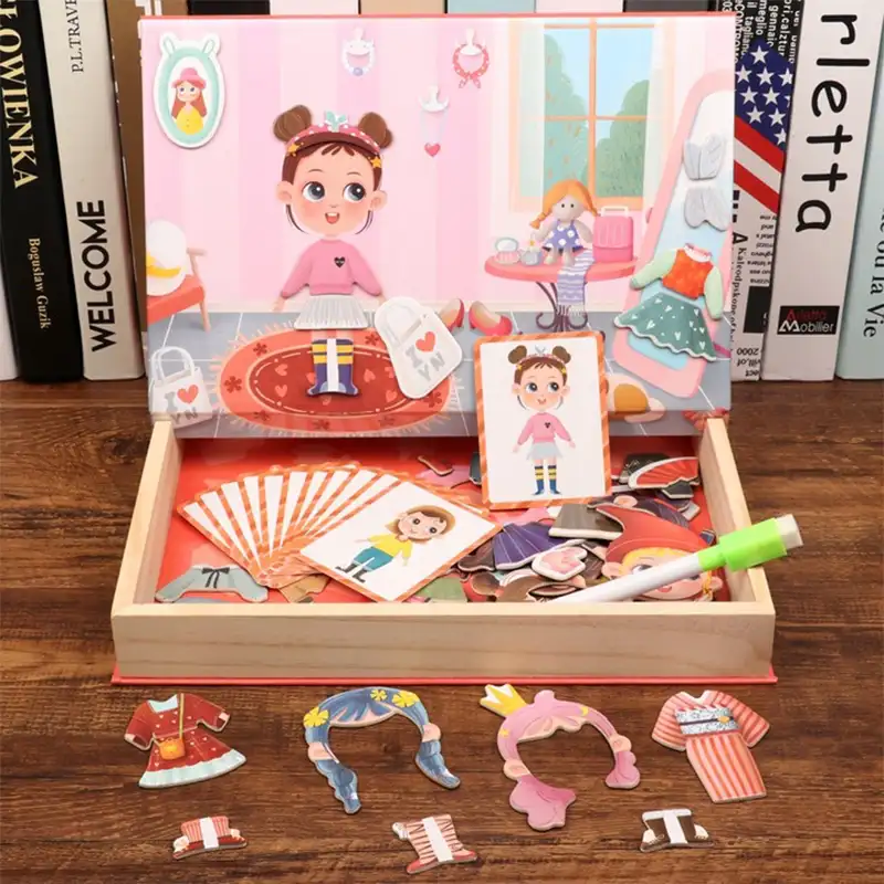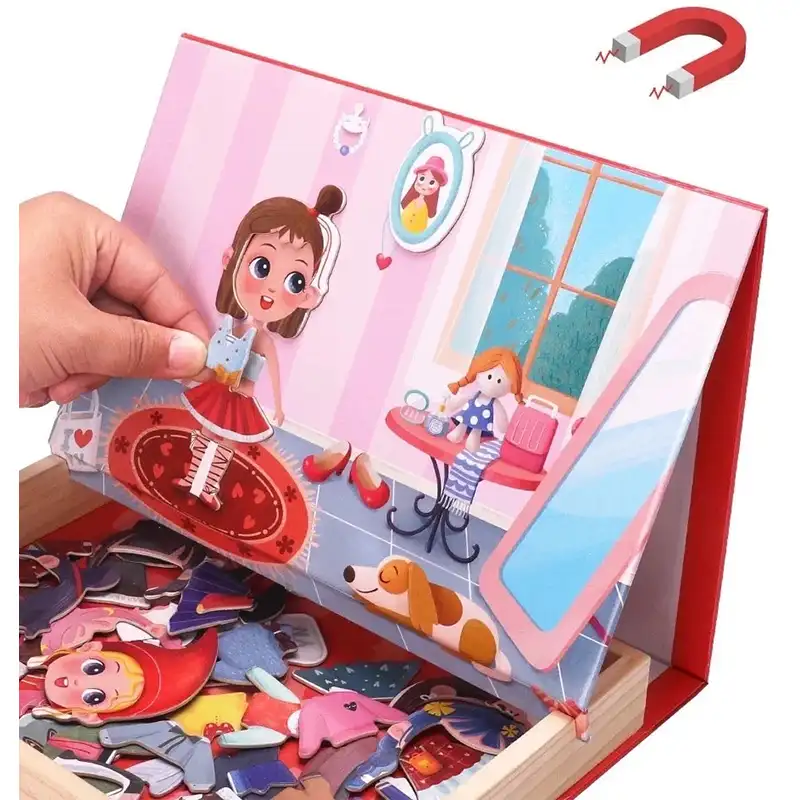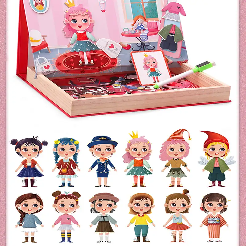با کمک این پازل آموزشی کودکان می تونند الگو برداری از مدل را بیاموزند و با کمک کارت های راهنما لباس بپوشند و یا از تخیل خودشان استفاده کنند. کودکان می توانند با استفاده از خلاقیت و نوآوری خود داستان سرایی کنند و برای هر مدل لباس داستان و اتفاق مختلف تجسم کنند.