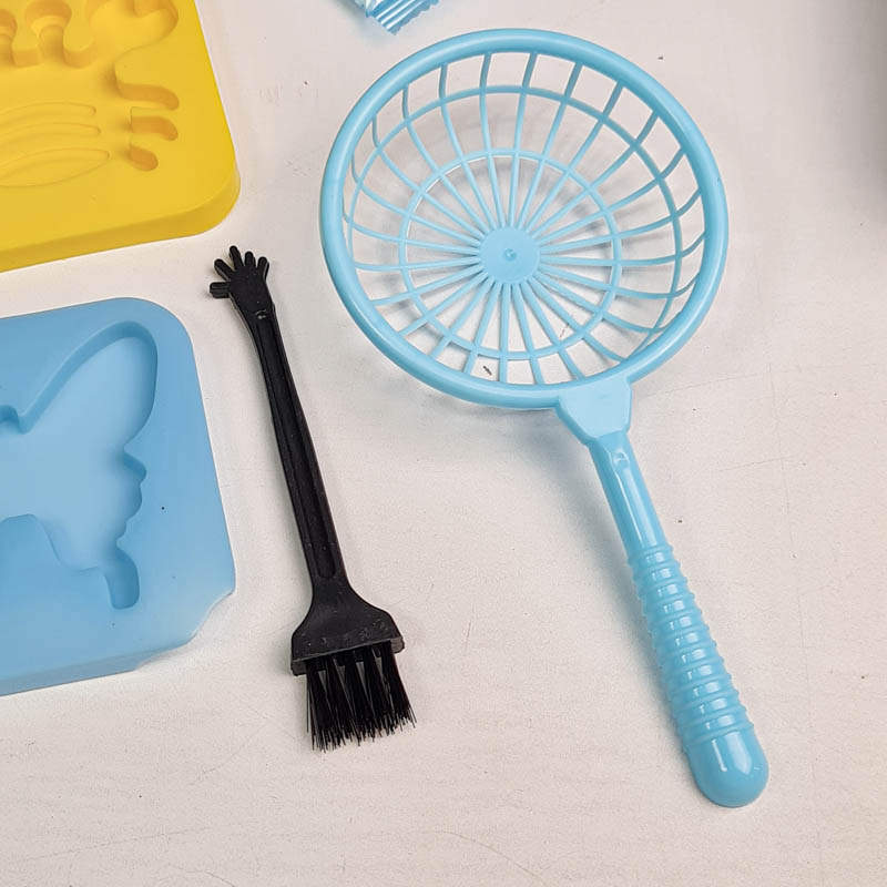 | اقلام همراه | 6 عدد شابلون، 6 قوطی رنگ، قلم مو، تور ماهیگیری، پودر مخصوص |