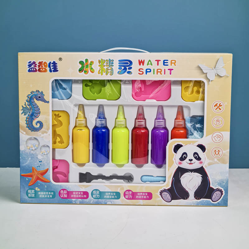 water spirit یک اسباب بازی جدید و سرگرم کننده، که این روزها ترند شده است. این کیت قالب سازی جادویی از رنگ ها اشکال ژله ای درست میکند که برای گروه سنی 3 سال به بالا مناسب است. این کیت شامل 6 عدد شابلون، 6 قوطی رنگ، قلم مو، تور ماهیگیری، پودر مخصوص برای ساخت اشکال بامزه و جذاب است. این اسباب بازی یک سرگرمی هیجان انگیز جادویی است! فقط کافیه رنگ ها را در قالب بریزین و روی آب رهاش کنید. رنگ ها کم کم حالت ژله ای پیدا میکنن و میشه باهاشون بازی کرد.