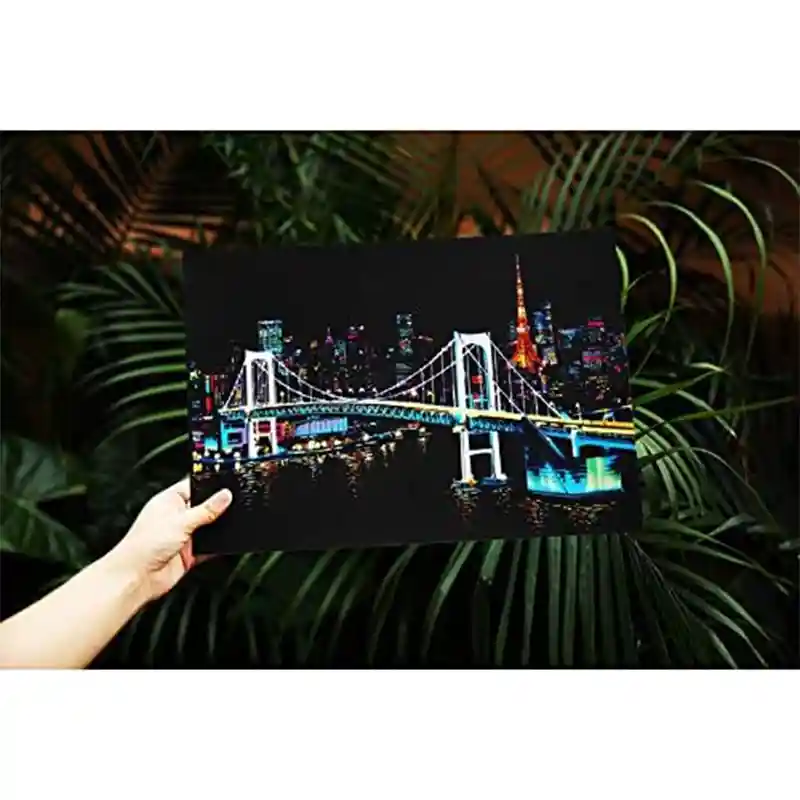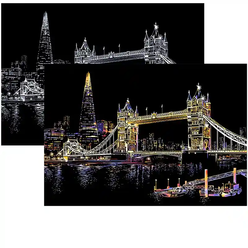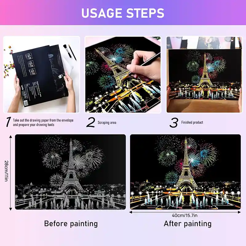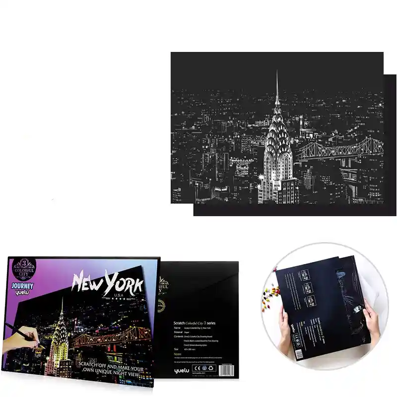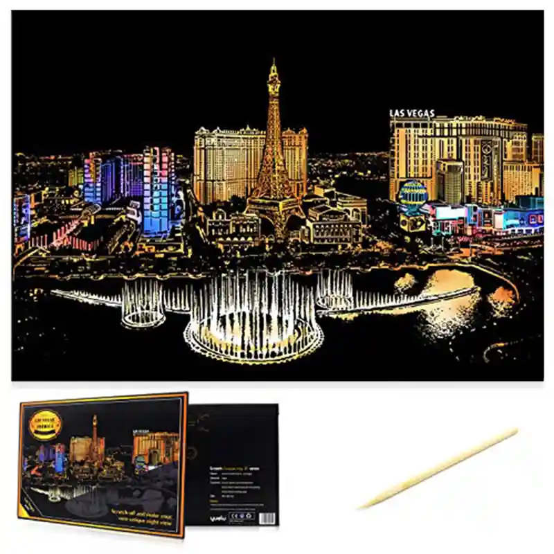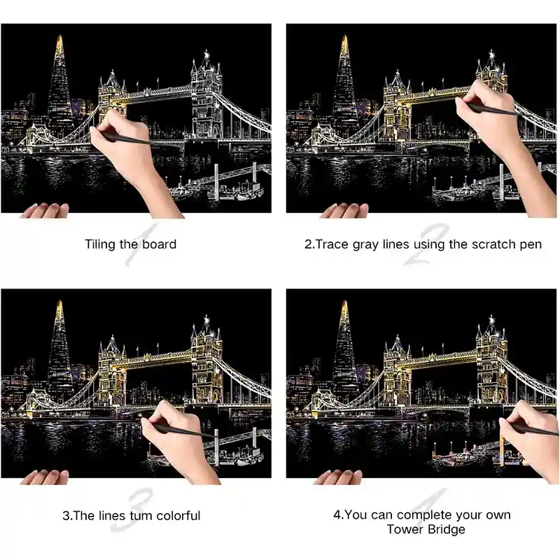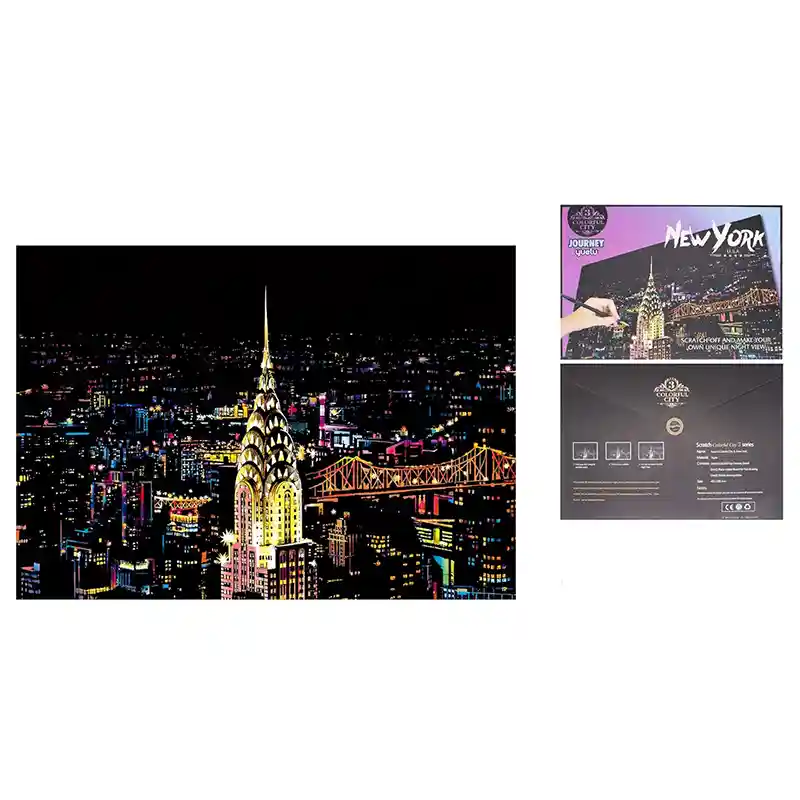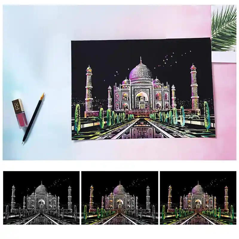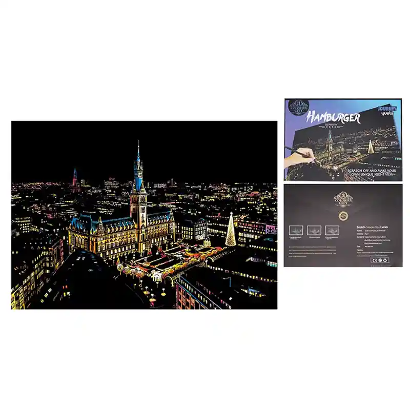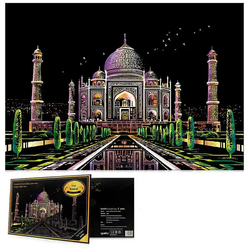 تابلو اسکرچ سایز 405*285 یک سرگرمی جذاب و آرامش بخش برای کودکان و بزرگسالان. این تابلو نه به ماژیک و آب نیاز دارد و نه به مداد رنگی فقط به کمک یک قلم چوبی رنگ های زیر این تابلو را نمایان کن و یک تابلو زیبا برای گوشه اتاق خودت درست کن. این تابلو شامل یک برگ به ابعاد 210*295 میلیمتر است که روی آن یک رنگ سیاه و در زیر آن رنگ های رنگین کمانی وجود دارد که با کمک قلم چوبی که همراه تابلو قرار دارد میتوانید رنگ سیاه روی آن را بتراشد و تصاویر مختلف از بناهای معروف در سرتاسر دنیا را نمایان کنید. تابلو اسکرچ برای گروه سنی 5 سال به بالا مناسب است.