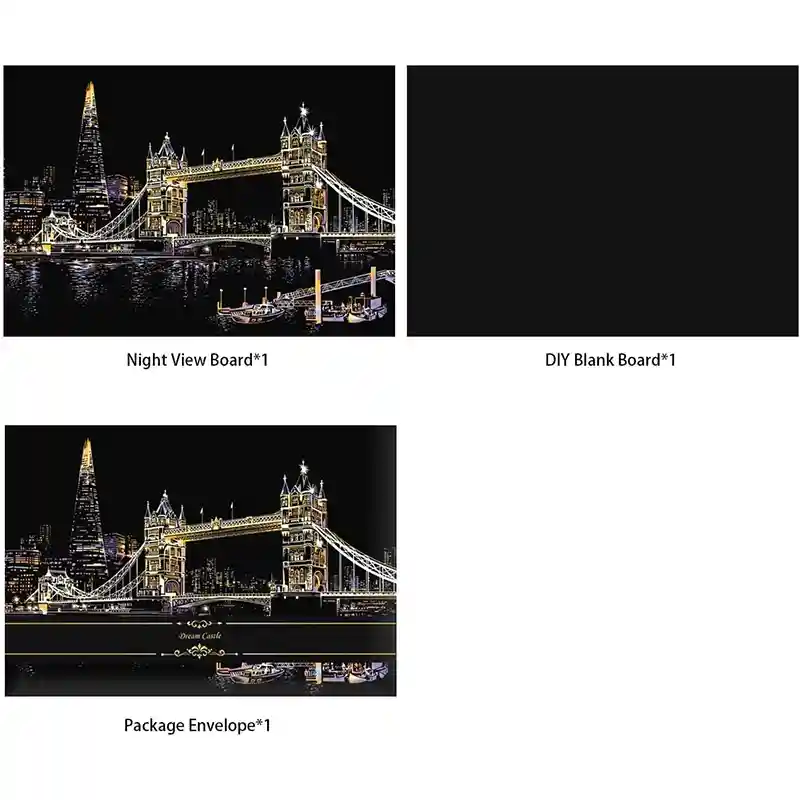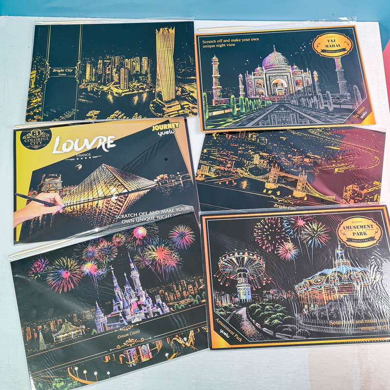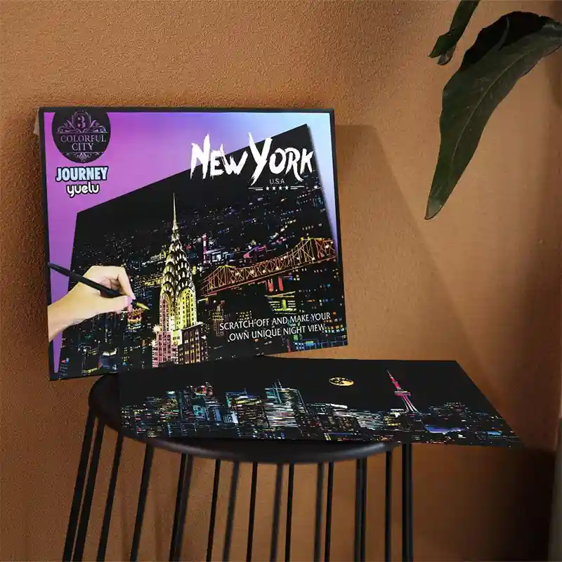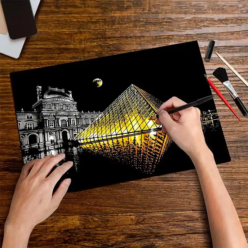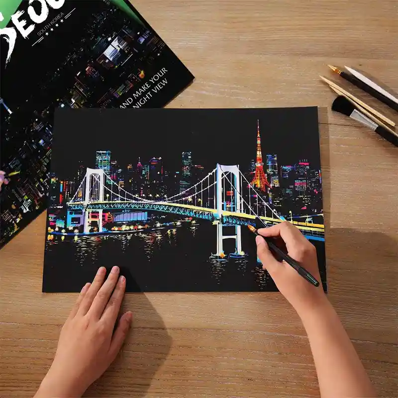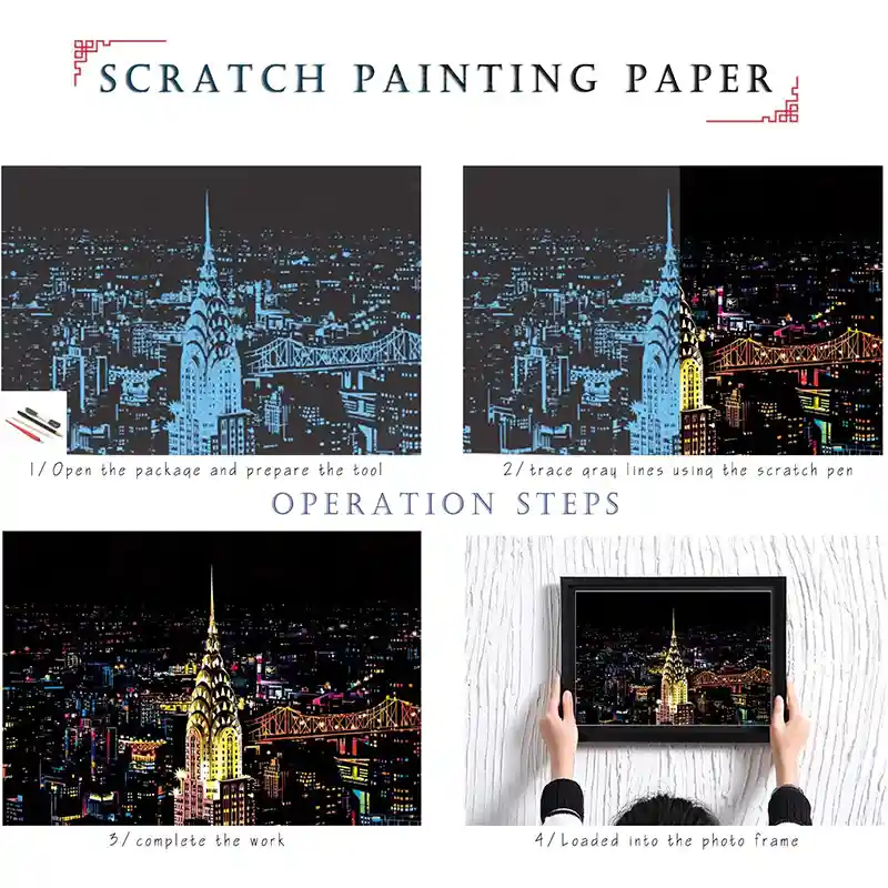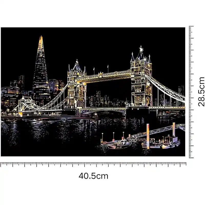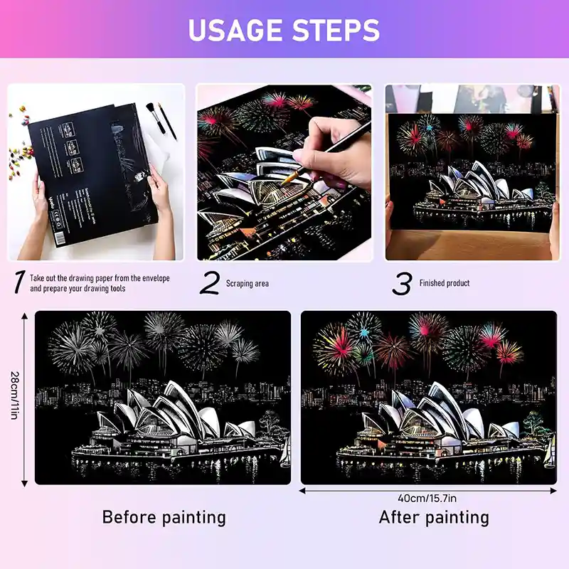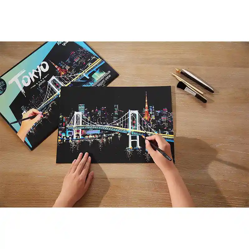 تابلو اسکرچ سایز 405*285 یک سرگرمی جذاب و آرامش بخش برای کودکان و بزرگسالان. این تابلو نه به ماژیک و آب نیاز دارد و نه به مداد رنگی فقط به کمک یک قلم چوبی رنگ های زیر این تابلو را نمایان کن و یک تابلو زیبا برای گوشه اتاق خودت درست کن. این تابلو شامل یک برگ به ابعاد 210*295 میلیمتر است که روی آن یک رنگ سیاه و در زیر آن رنگ های رنگین کمانی وجود دارد که با کمک قلم چوبی که همراه تابلو قرار دارد میتوانید رنگ سیاه روی آن را بتراشد و تصاویر مختلف از بناهای معروف در سرتاسر دنیا را نمایان کنید. تابلو اسکرچ برای گروه سنی 5 سال به بالا مناسب است.