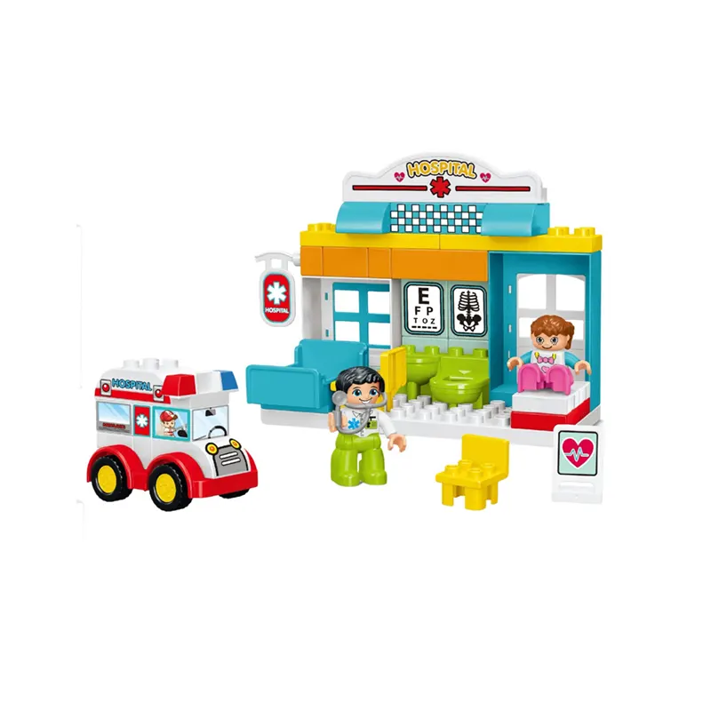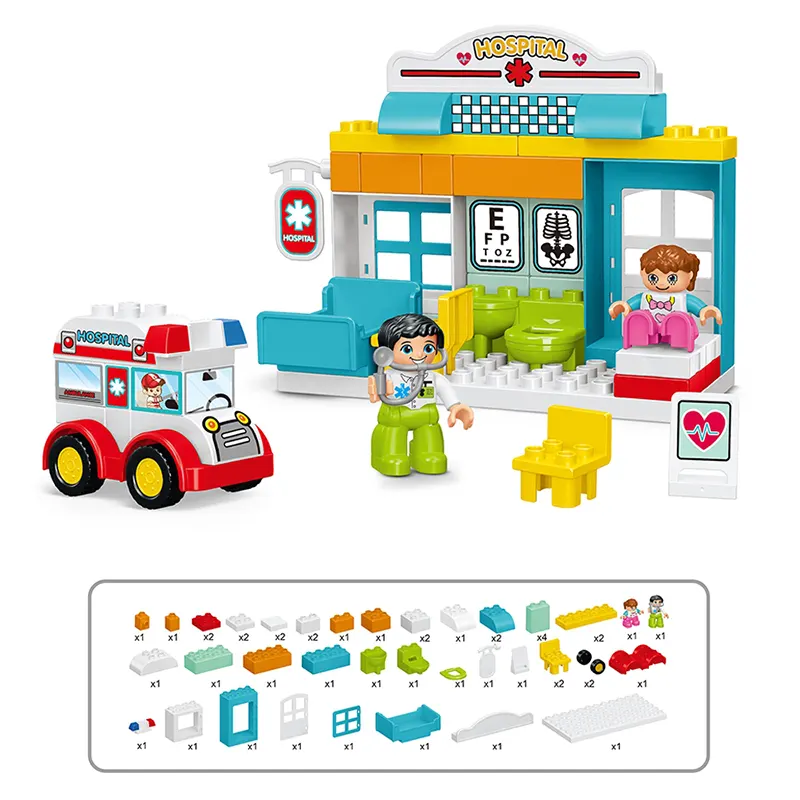 لگو اسباب بازی یک اسباب بازی محبوب برای کودکان و حتی بزرگسالان است. قطعات رنگارنگ لگو یا آجره های لگو را روی هم قرار دهید و با 47 تکه لگو و آجر های رنگارنگ یک بیمارستان به همراه آمبولانس زیبا بسازید. این لگو دوپلو برای بچه های بالای 3 سال مناسبه. همچنین مینی عدد فیگور دختر و پسر در بسته بندی این اسباب بازی قرار داره که قراره همه با هم کلی خوش بگذرونن. فضای سرگرم کننده رویایی رو بسازید و ساعاتی رو با لذت سپری کنید. بازی با این لگو دوپلو علاوه بر اینکه باعث تقویت مهارت های جسمی و ذهنی کودکتون میشه، برای یادگیری رنگ ها، مکان ها و ... هم بسیار کاربردیه. لگو اسباب بازی از رنگ های غیر سمی و از جنس ABS ساخته شده.فیگورهای کوچک دارای دستها، پاها و سر هستند که میتوان آنها را حرکت داد و در موقعیتهایی متناسب با ژست های متناسب قرار داد. با کمک دستشان می توان اجسام را نگه دارند.