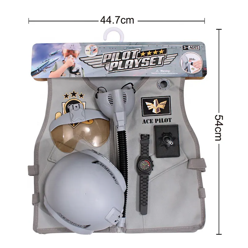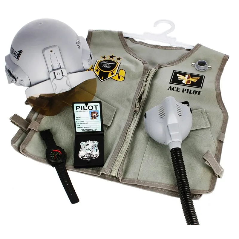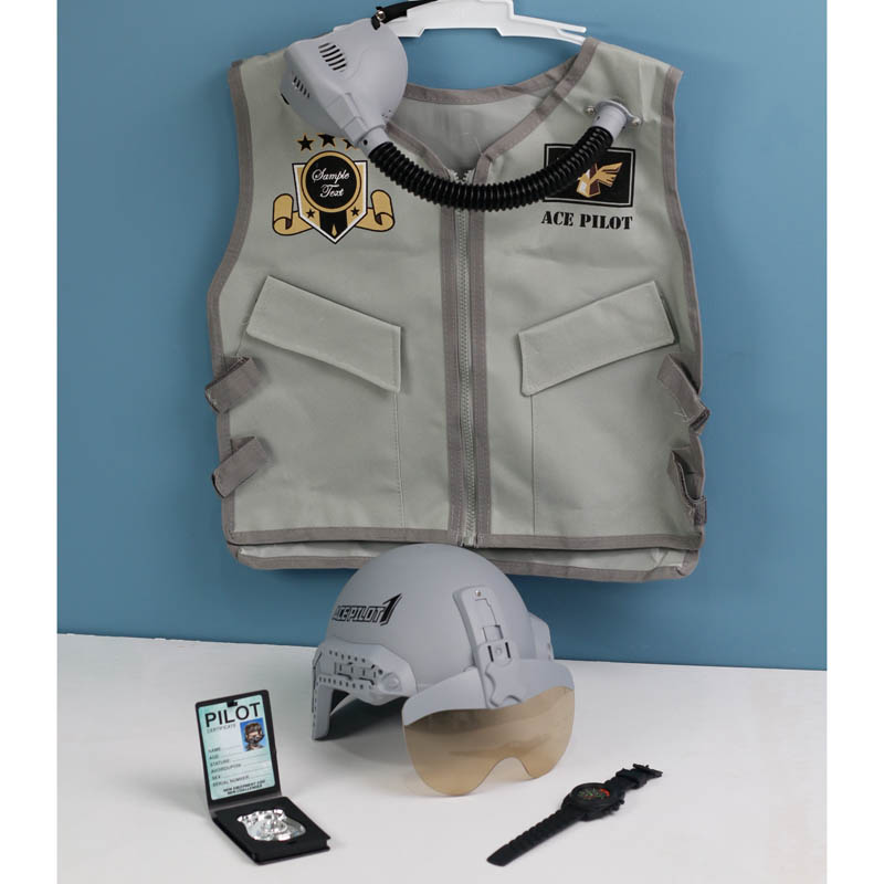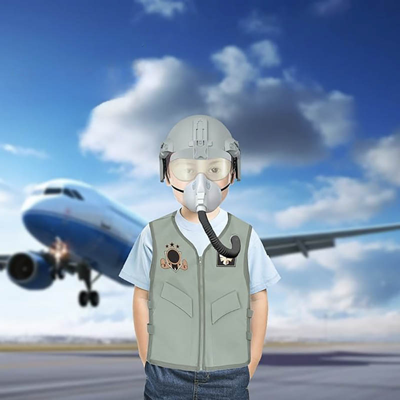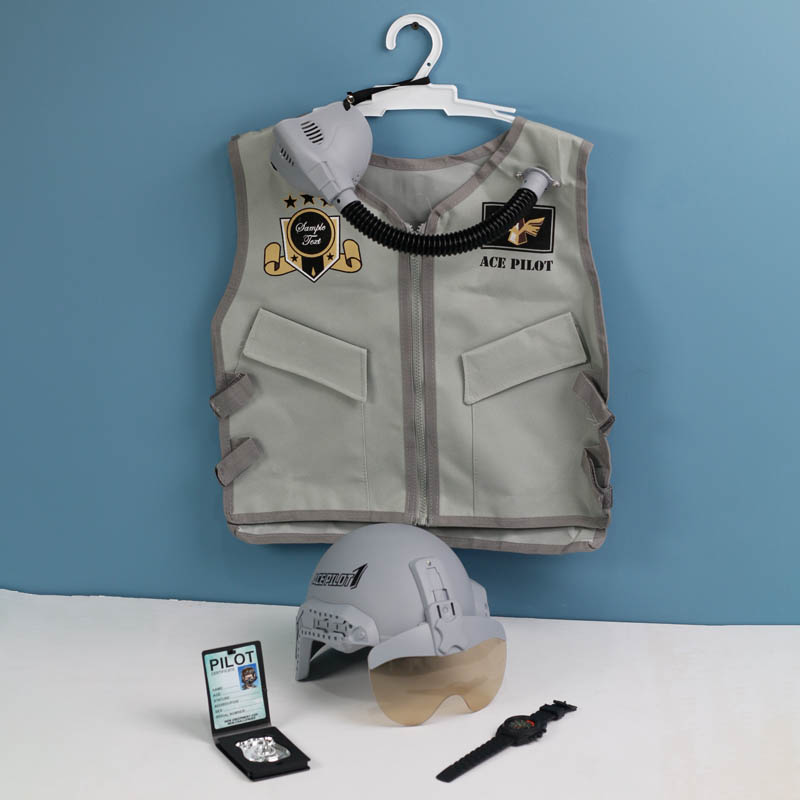 - لباس مشاغل کودک خلبان با لوازم شاملجلیقه، کلاه، ساعت، کارت شناسایی، ماسک اکسیژن می باشد
