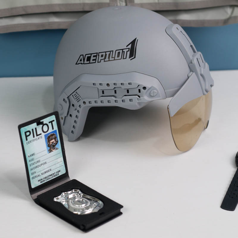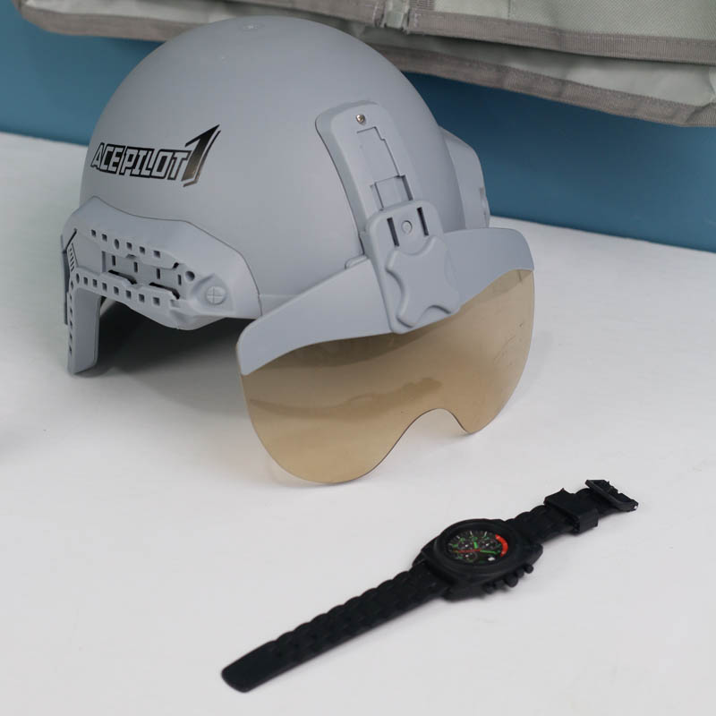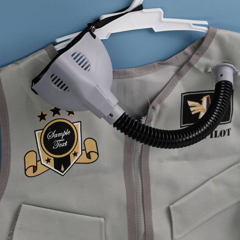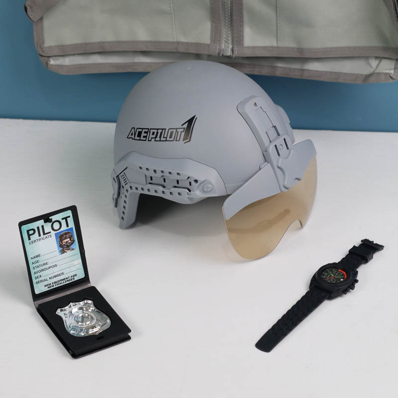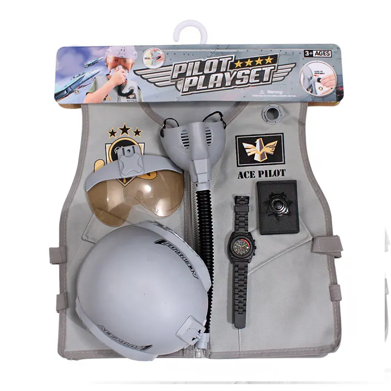 - لباس مشاغل کودک خلبان با لوازم شاملجلیقه، کلاه، ساعت، کارت شناسایی، ماسک اکسیژن می باشد