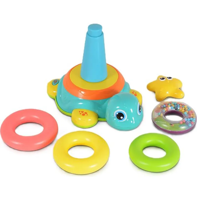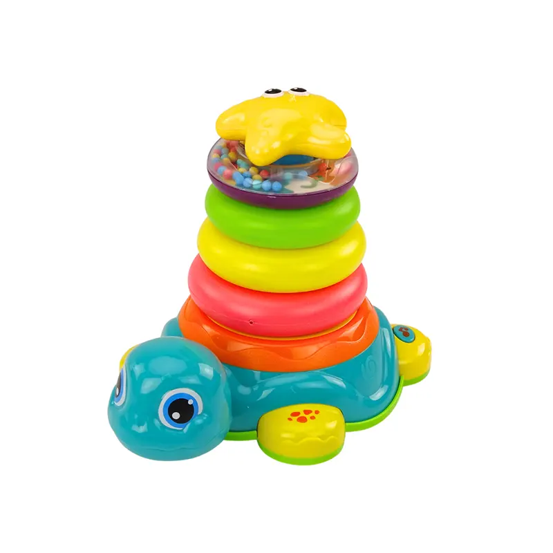 حلقه هوش موزیکال و جورچین لاکپشت، یک اسباب بازی موزیکال زیبا و بامزه است که به کودک در شناختن رنگها و اعداد، ابعاد کوچک و بزرگ و... کمک میکند. این اسباب بازی با رنگ زیبا و شادش باعث جلب توجه کودک میشود و هماهنگی میان چشم و دستهای آنها را افزایش میدهد. یکی از قابلیتهای این اسباب بازی، قابلیت پخش صدا و نور است دکمه روی پای لاکپشت رو فشار بدید تا موزیک های بامزه پخش بشه. این اسباب بازی از مواد اولیه مرغوب، پلاستیک با کیفیت درجه یک ABS فاقد مواد شیمیایی و بدون BPA تولید شده که باعث ماندگاری آن میشود، لبه های نرم و بدون بریدگی این اسباب بازی از پوست کودک محافظت کرده و آسیبی در حین بازی به او نمیزند. این اسباب بازی موزیکال دارای 4 حلقه رنگی متنوع است.