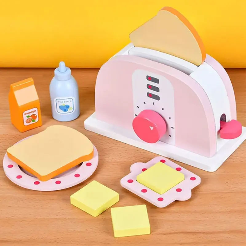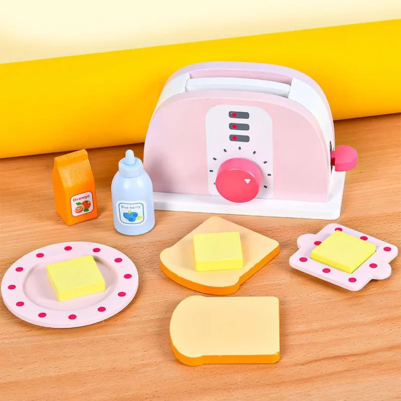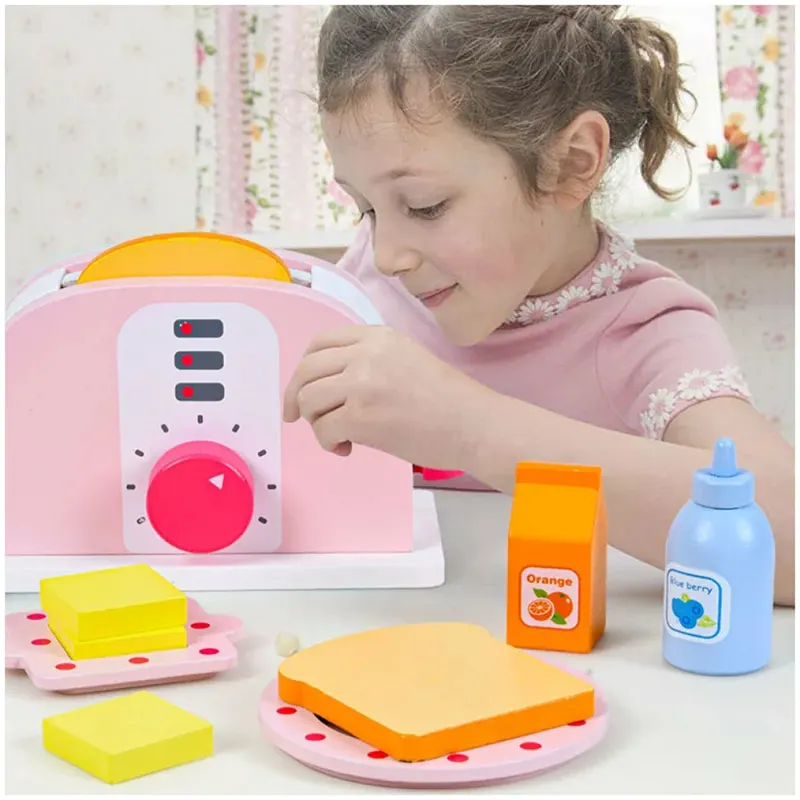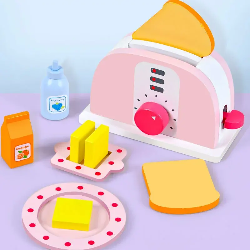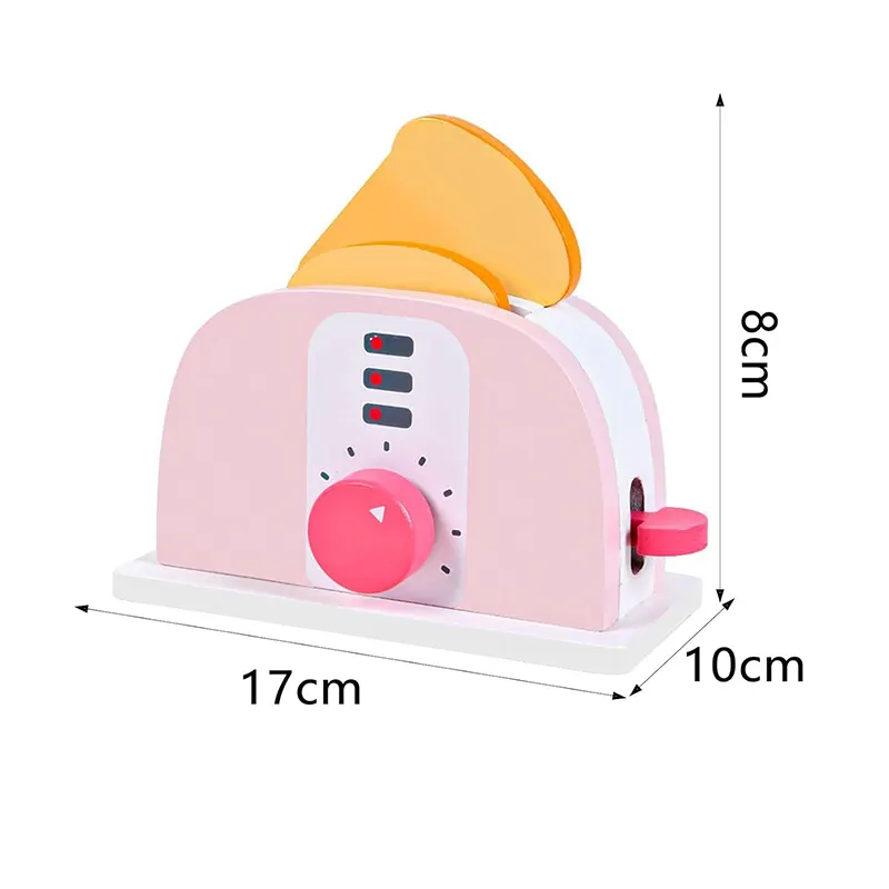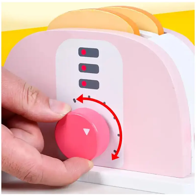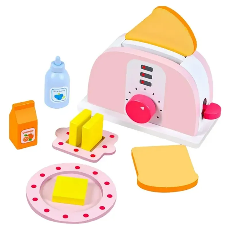 با این اسباب بازی توستر چوبی جذاب شما می تونید فرزند خودتون رو به تمرین برای آماده کردن یک صبحانه و یا میان وعده ی غذایی تشویق و سرگرم كنین. اسباب بازی توستر چوبی کودک دارای 12 قطعه شامل توستر، 2 عدد نان تست، کره، پیش دست، آب پرتقال، شیر، سس بلوبری، سس گوجه هست. رنگ های اون غیر سمی می باشد و مناسب رده سنی بالای 3 سال است. این اسباب بازی دارای اهرم است که کودک میتوان نان های تست را بدون نیاز به باتری بالا و پایین ببرد.