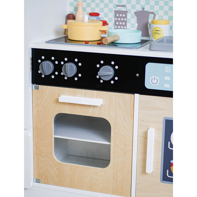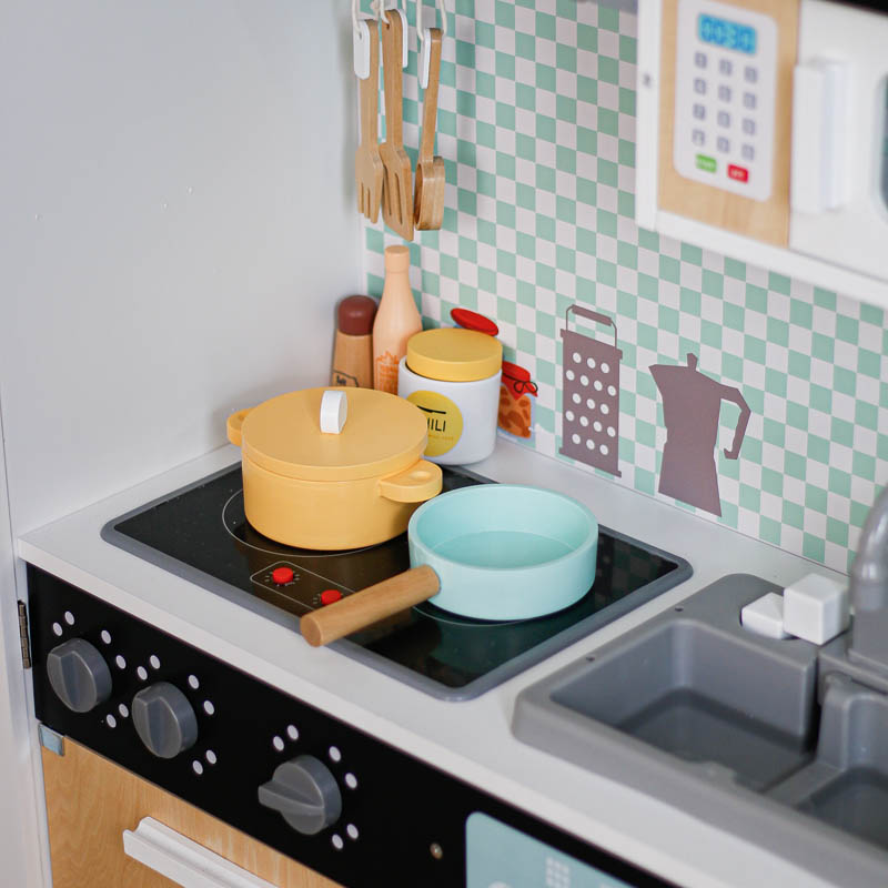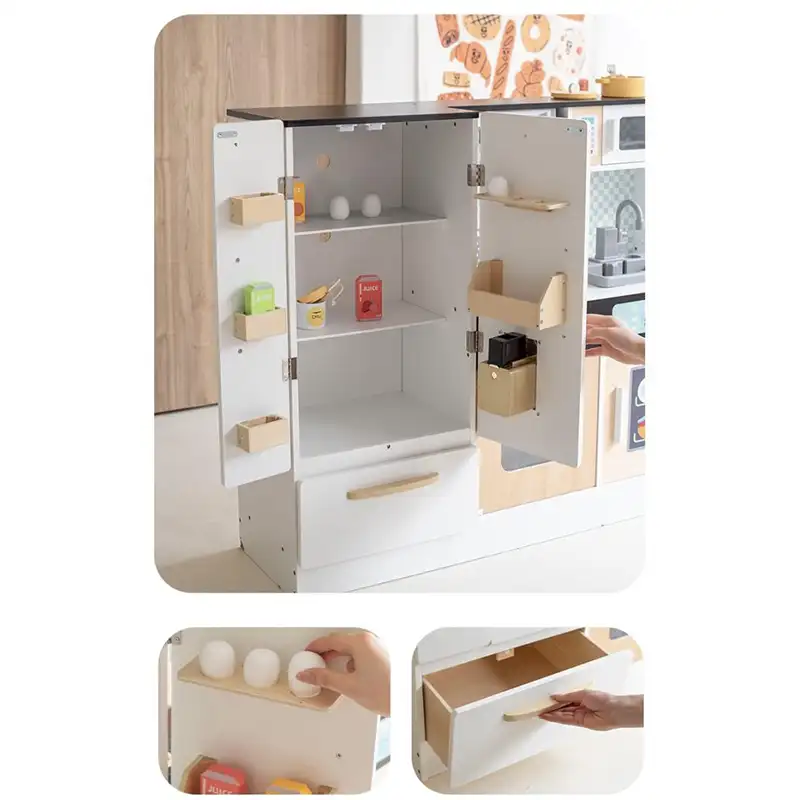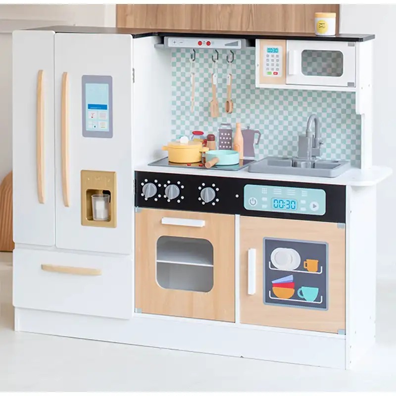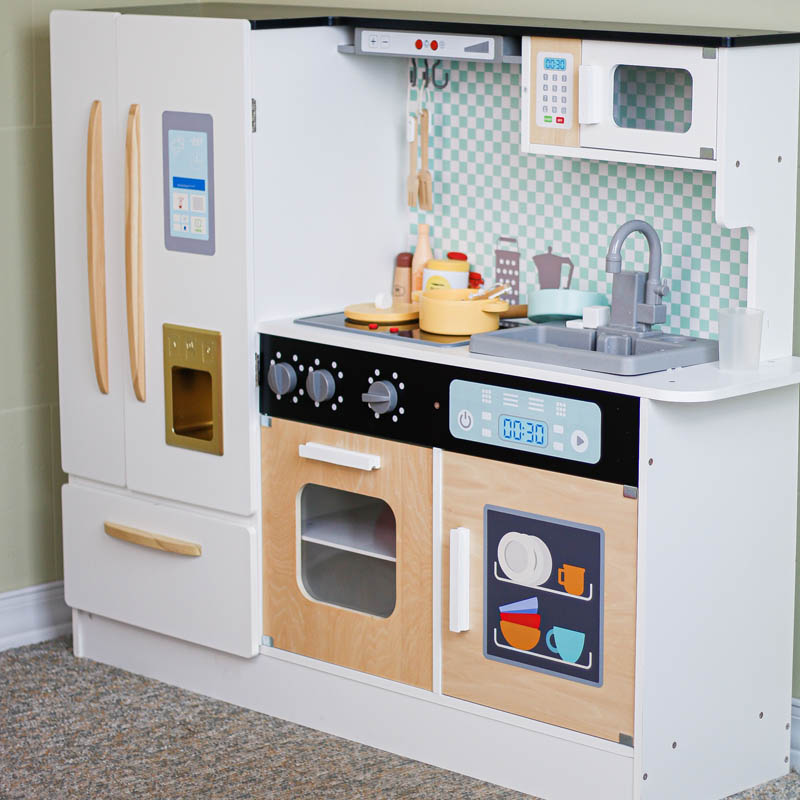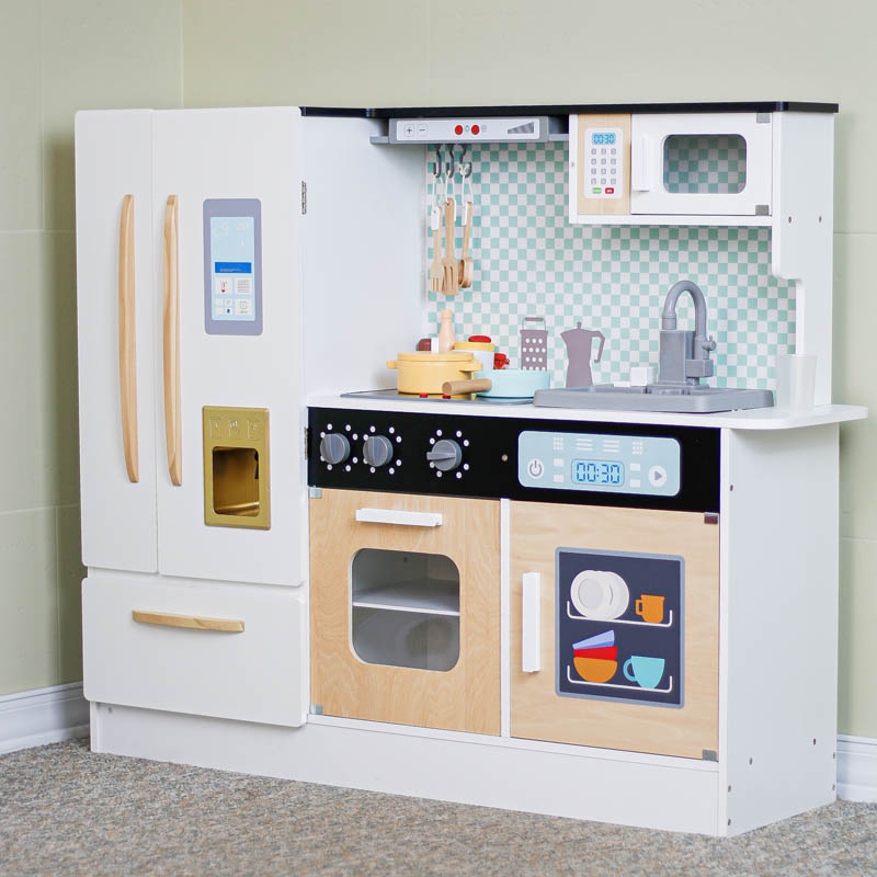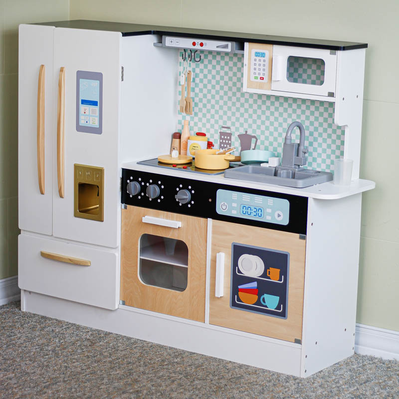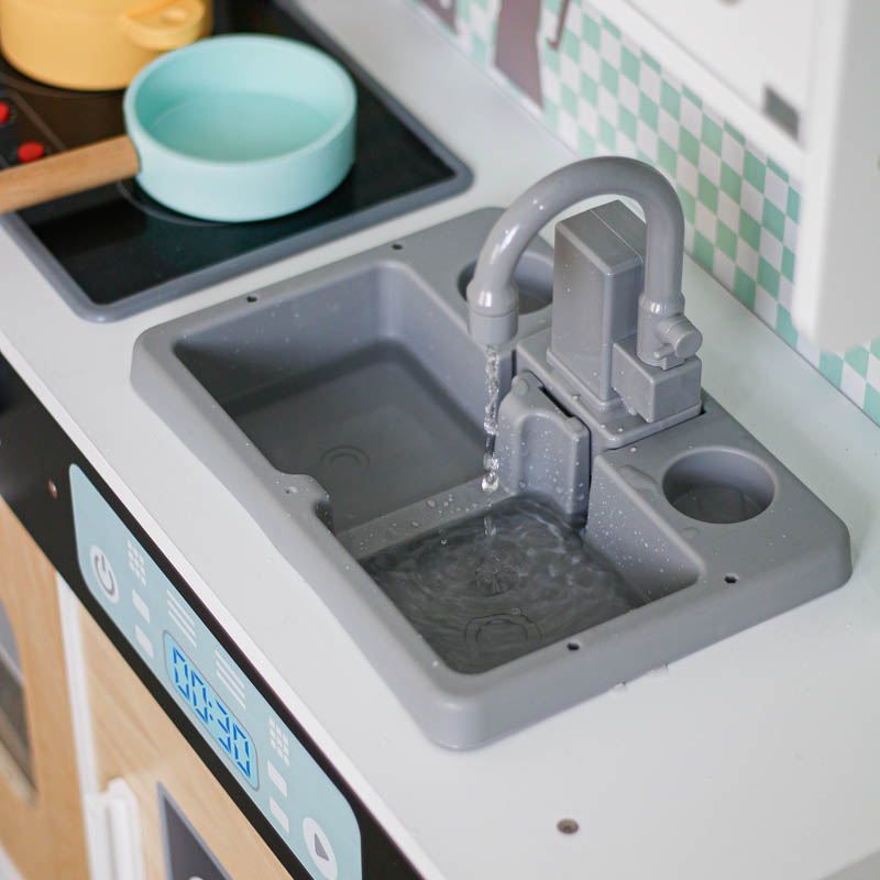 یک آشپزخانه مدرن شیک با نقاط بازی متعدد که به کودکان اجازه میدهد تا به کشف و تجربه طیف وسیعی از عملکردهای مدرن آشپزخانه بپردازند. کودکان میتوانند در سینک میوهها و سبزیجات را بشویند و سپس از اجاقگاز برای پختن مواد اولیه استفاده کنند. آشپزخانه فوقالعاده به بچهها تجربه کامل بودن یک سرآشپز کوچک را میدهد. برای افزایش تجربه حس واقعی از آشپزی در یک آشپزخانه مجهز، کودکان میتوانند با این آشپزخانه بازی کنند. این آشپزخانه مهارتهای حرکتی را توسعه میدهد.