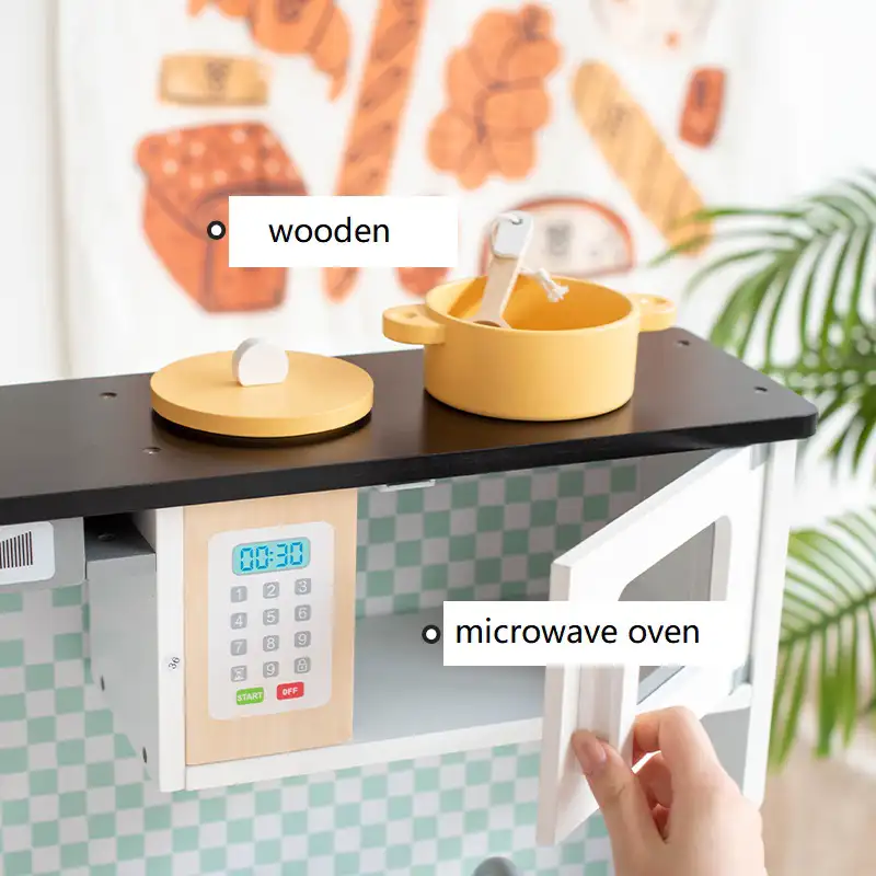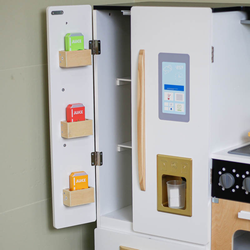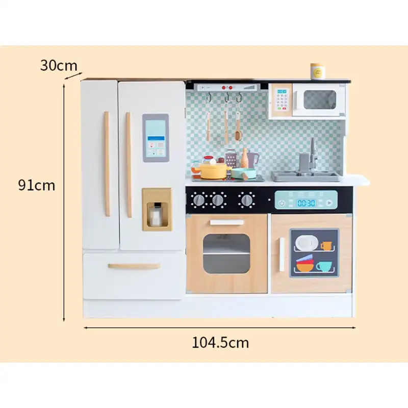 آشپزهای کوچولو میتوانند مهارتهای آشپزی خود را در این آشپزخانه اسباب بازی مدرن و زیبا تقویت کنند! این آشپزخانه از جنس چوب با کیفیت و مرغوب می باشد و به راحتی قابل مونتاژ است و شامل یخچال/فریزر با قابلیت ریزش یخ، سینک با قابلیت ریزش آب است. همچنین این آشپزخانه دارای مایکروفر با قابلیت باز شدن در، اجاق گاز با قابلیت روشن شدن و سینک با شیر آب و دسته متحرک با قابلیت ریزش آب و فضای کافی برای کابینت و ذخیرهسازی برای آسانی در تمیز کردن است. این آشپزخانه پس از مونتاژ تقریبا طول 104.5 عمق 30 ارتفاع 91 سانتیمتر دارد و فضای کافی برای بازی همزمان چندین کودک را فراهم میکند. آشپزخانه بازی چوبی دارای اقلامی مانند تخم مرغ، 3 پاکت آبمیوه، قوطی، قابلمه، ماهیتابه، کفگیر، نمک، شیشه سس و... است که بازی و نقش پذیری را برای کودکان واقعی میکند. این آشپزخانه چوبی هدیهای عالی برای کودکان 3 سال و بالاتر است.