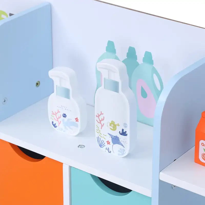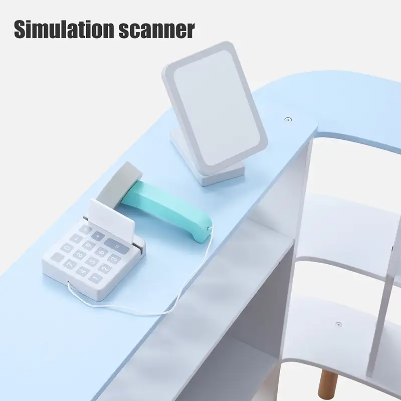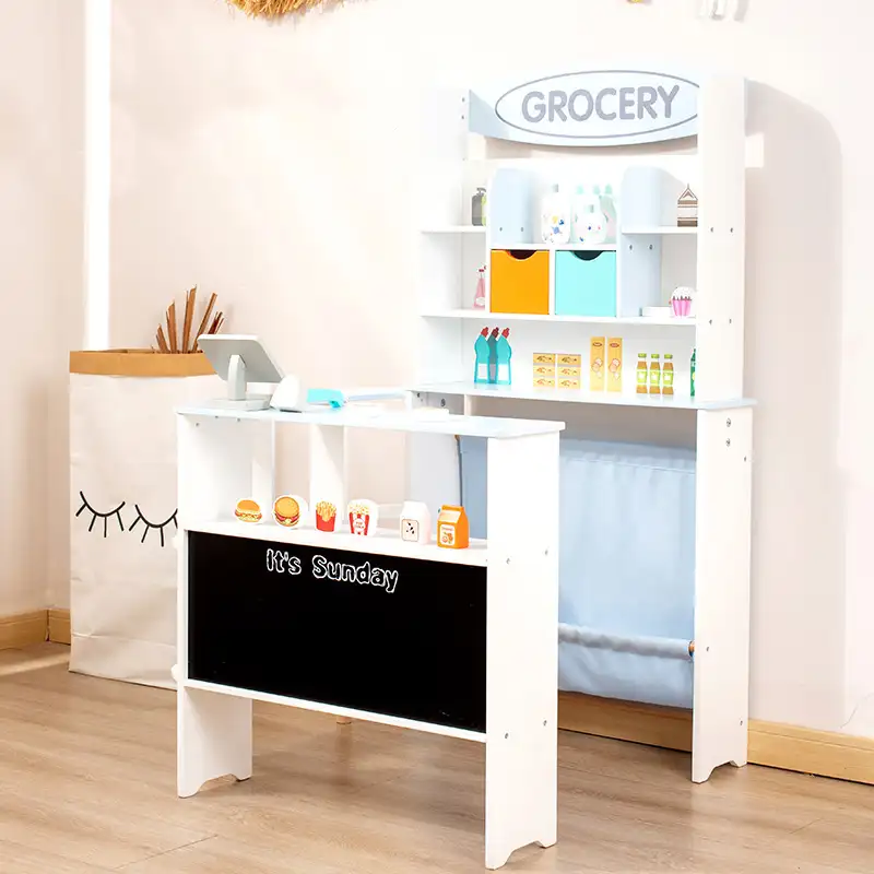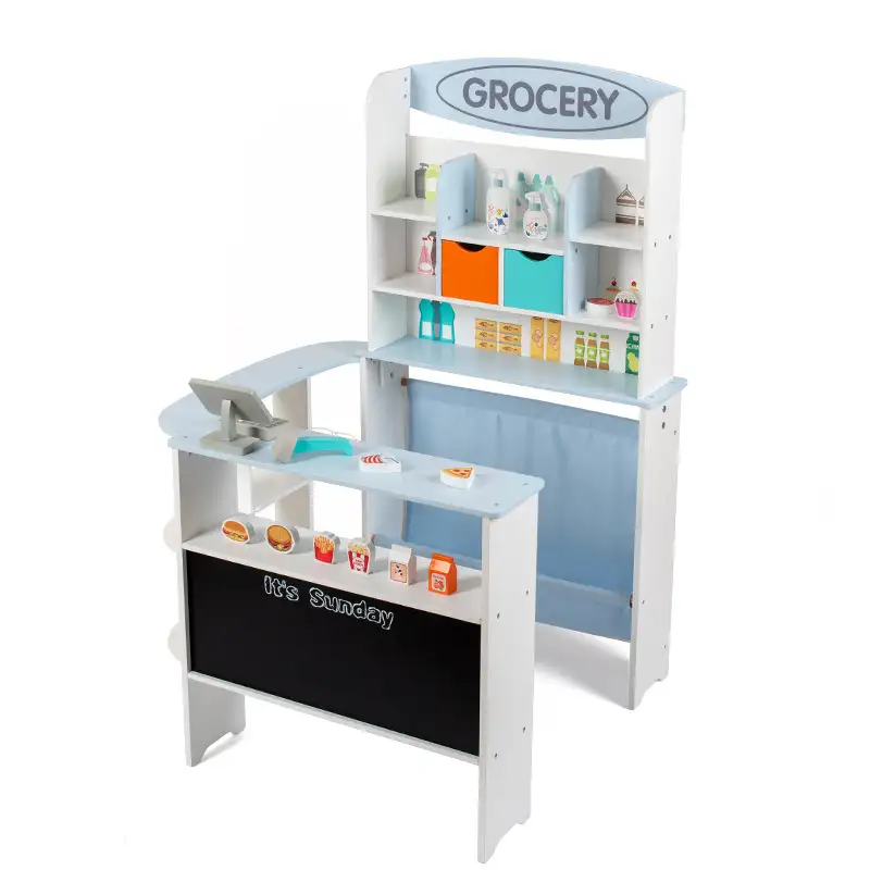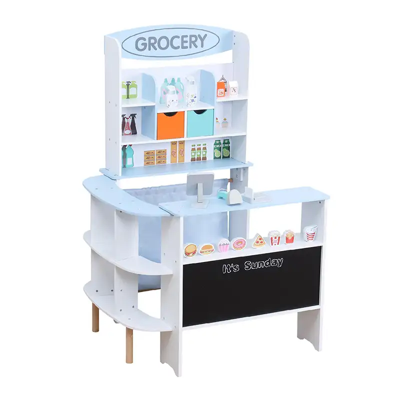 بازی خرید و فروش هرگز به اندازه فروشگاه مواد غذایی چوبی سرگرمکننده نخواهد بود! این استند فروشگاهی دارای گوشهها و لبههای نرم و گرد به مشتریان 3 سال به بالا اجازه میدهد که به قفسههای مختلف این فروشگاه رفته و خریدهای خود را از یک سمت پرداخت کنند و به فروشنده این امکان را میدهد در پشت صندوق قرار گرفته و خرید های مشتریان را ثبت و حساب کنند و یک بازی گروهی جذاب و هیجان انگیز بسازد. ویژگیهای واقعی شامل «اسکنر»، مانیتور، دستگاه کارتخوان و کارت اعتباری است. قفسههای فراوان برای نمایش و قرار دادن مواد غذایی وجود دارد (این سوپرمارکت دارای افلامی مانند خوشبو کننده، مایع دستشویی، دونات، کاپ کیک، هات داگ، همبرگر،پیتزا، سیب زمینی، نوشابه، پاپ کورن و....) می باشد. کودکان همه چیزهایی را که در لیست خریدشان دارند، در این فروشگاه خانواده پیدا خواهند کرد.