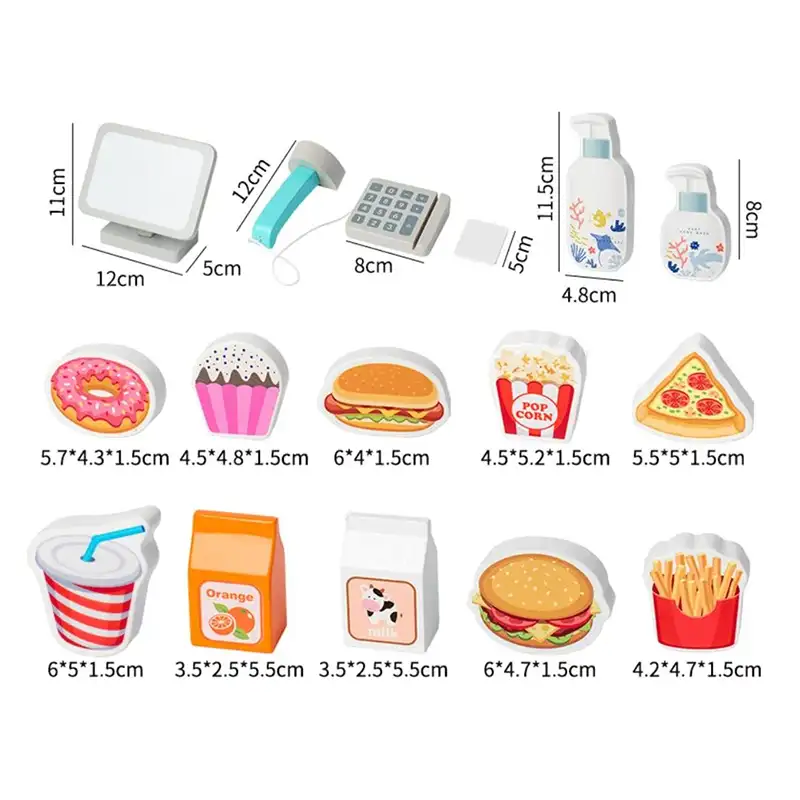 - دارای اقلامی مانند خوشبو کننده، مایع دستشویی، دونات، کاپ کیک، هات داگ، همبرگر،پیتزا، سیب زمینی، نوشابه، پاپ کورن و....