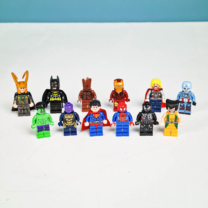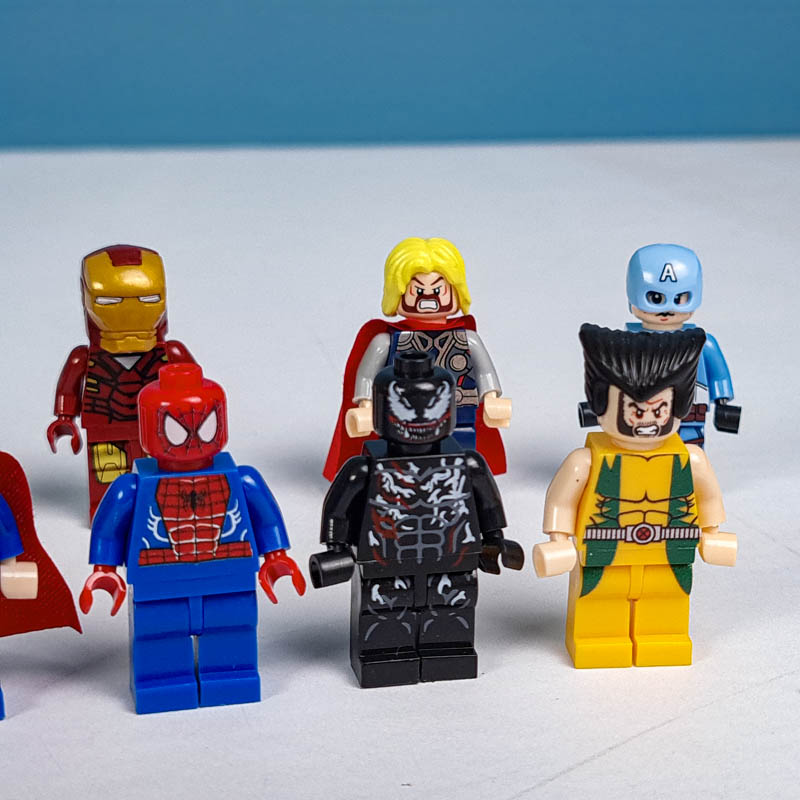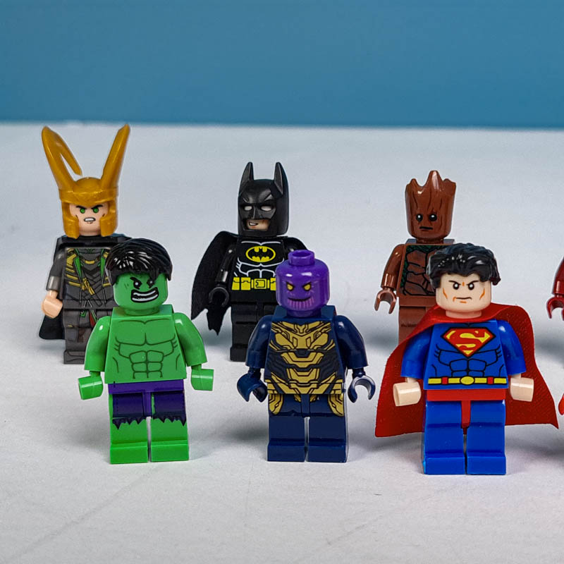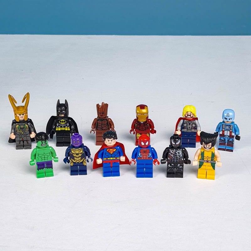 مینی فیگور لگو طرح قهرمانان شامل 12 مینی فیگور لگویی جذاب از شخصیت های مارول و اونجرز برای بازی کودکان بالای 3 سال! شما این مینی فیگور ها را می توانید بر روی صفحه لگو کلاسیک نیز قرار دهید تا بتوانید بازی های بیشتری را با این مینی فیگور های لگویی انجام دهید. راستی شما از طرفداران فیلم های مارول و اونجرز هستید؟ دست و پا و سر این مینی فیگور ها قابلیت حرکت دارند و یک بسته بندی اکسسوری مثل سلاح های این قهرمانان نیز به همراه دارد.