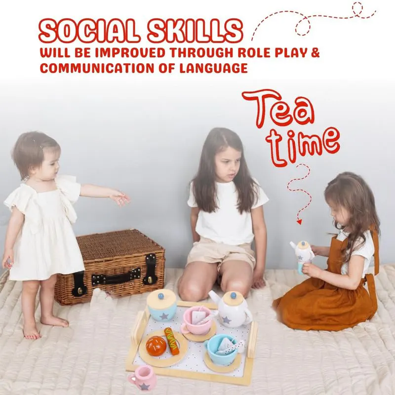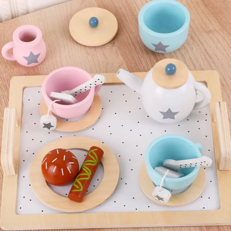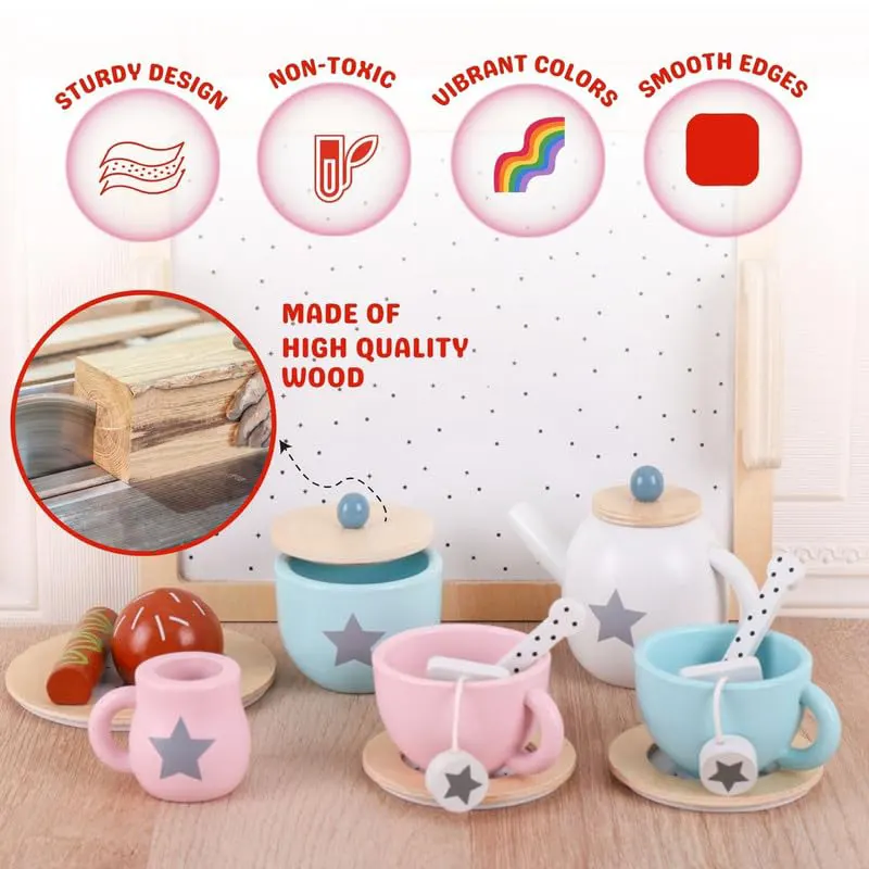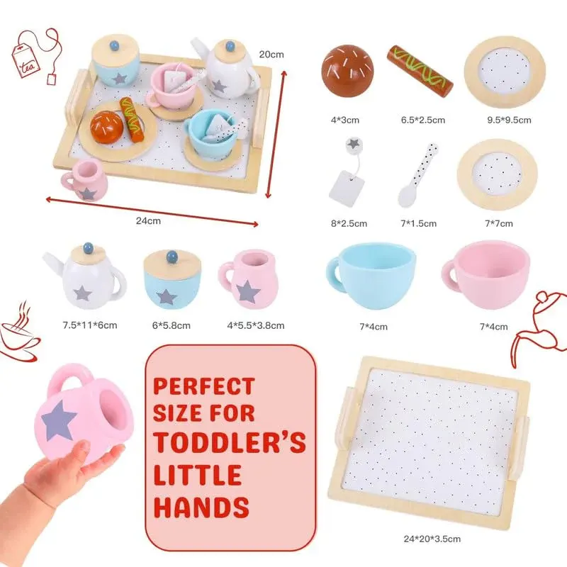 ست چای خوری یک اسباب بازی چوبی مخصوص کوچولوهای مهمان نوازی است که عاشق پذیرایی کردن و خاله بازی با دوستانشون هستند و میتوانند به عنوان میزبانان نقش بازی کنند. این ست اسباب بازی از چوب ساخته شده است که برای دست ظریف کودکان شما ایمن و نرم است. کوچولوها عاشق نقش آفرینی و بازی با غذاها و وسایل آشپزخانه هستند. آیا کودک شما از مهمانی ها لذت می برد؟ دوست دارید تا کاری کنید که او همیشه برای خود مهمانی و جشنی مهیج برگزار کند؟ ست چوبی چای خوری این امکان را به شما می دهد تا کودکان عزیزتان را شاد و شگفت زده کنید. اسباب بازی چوبی ست چای خوری برای کوچولوهایی که عاشق پذیرایی و مهمانی هستند یک اسباب بازی فوق العاده است. همچنین این سباب بازی دارای قطعات مختلف برای برگزاری یک دوره می دوستانه می باشد و با کمک لوازم چای خوری آن, کوچولوی شما می تواند دوستانش را برای یک عصرانه لذیذ دعوت کند. ست چای خوری چوبی دارای تکه های متنوع چوبی از جمله سینی، قوری، قندان، شکرپاش، 2 عدد فنجان، 3 عدد پیش دستی، 2 عدد قاشق، 2 عدد دمنوش، 2 عدد شکلات بار و سایر لوازم جانبی می باشد و دارای باکسی جذاب برای قرار دادن کل ست در آن است