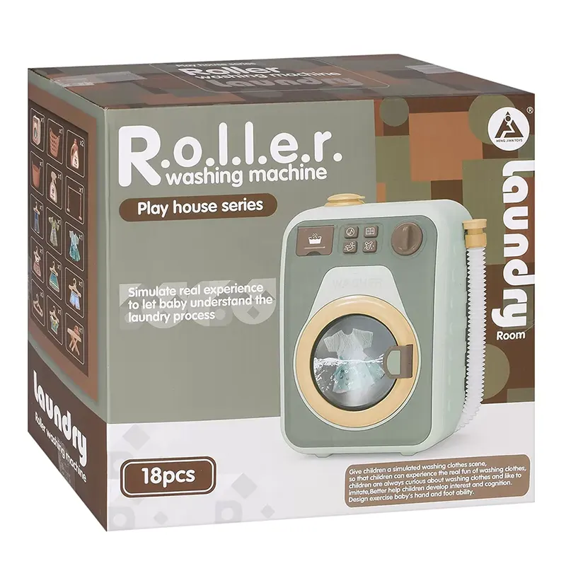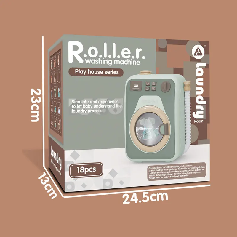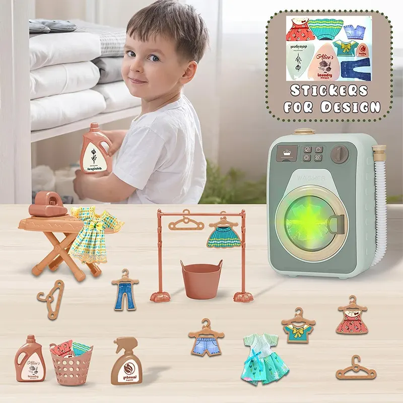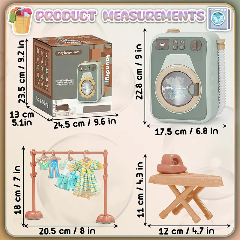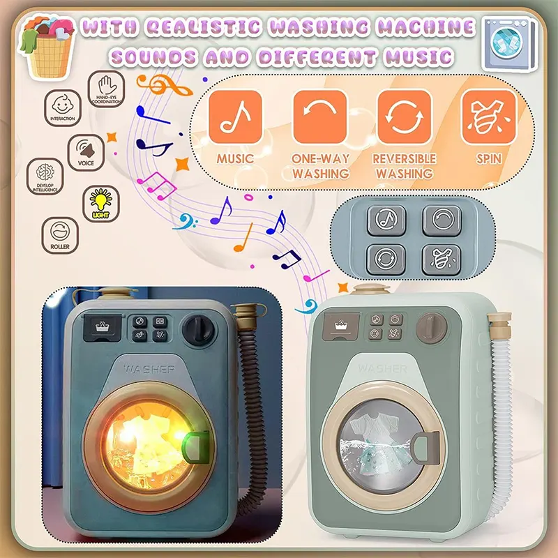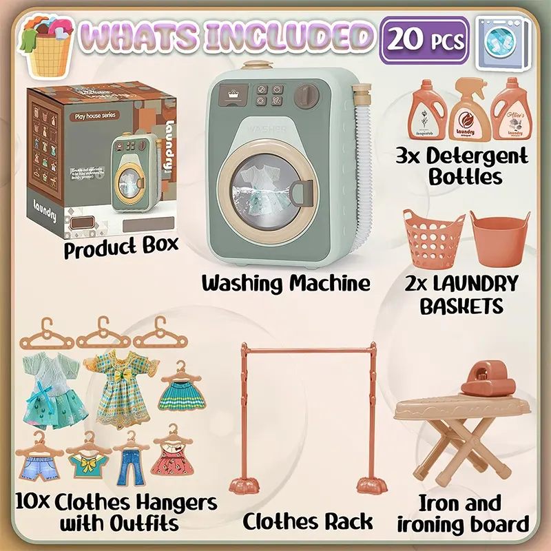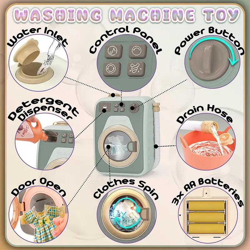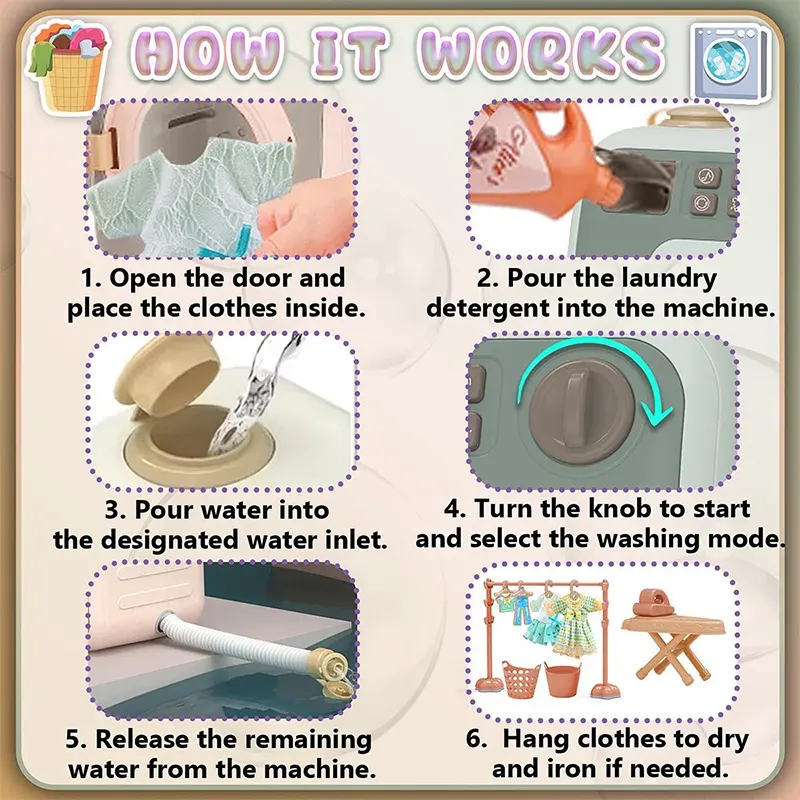اسباب بازی لباسشویی کودک با قابلیت باز شدن در، مخزن مایع و داشتن دکمه حس بازی با وسایل واقعی را به کودک شما منتقل می کند. این ماشین لباسشویی اسباب بازی موزیکال دارای قابلیت چرخش و جلوه های نوری و صوتی است. کودک میتونه در دنیای خیالی خودش، لباس ها لکه دار را درون اسباب بازی ماشین لباسشویی بندازه تا حسابی تمیز بشه. کافیه در ماشین لباس شویی رو باز کنند، لباس های کثیف رو درون آن گذاشته آب درون ماشین لباسشویی بریزید مایع شوینده را در مخزن ماشین لباس شویی ریخته و دکمه مورد نظر را فشار دهند. بعد از شستن لباس با شلنگ متصل به ماشین لباسشویی آب درون ماشین لباسشو یی را خارج کنید. بازی با ماشین لباسشویی کودک برای به ها به خصوص دختر کوچولو ها خیلی لذت بخشه بنابراین، خرید ماشین لباسشویی بچگانه به عنوان اسباب بازی دخترانه میتونه یک هدیه منحصر به فرد و سرگرم کننده باشه. این ست شامل ماشین لباسشویی، سبد لباس، مواد شوینده، سطل، خوشبو کننده لباس، رگال، 7 عدد لباس، اتو، میز اتو، آویز لباس است.