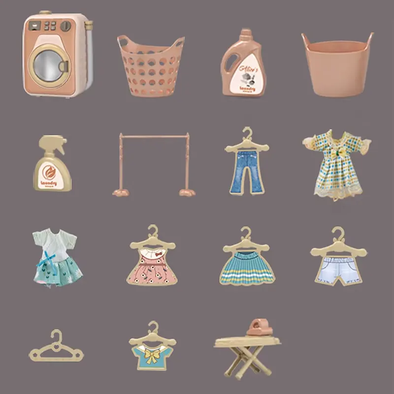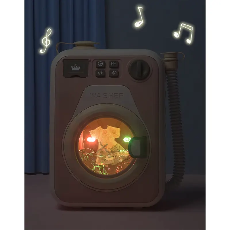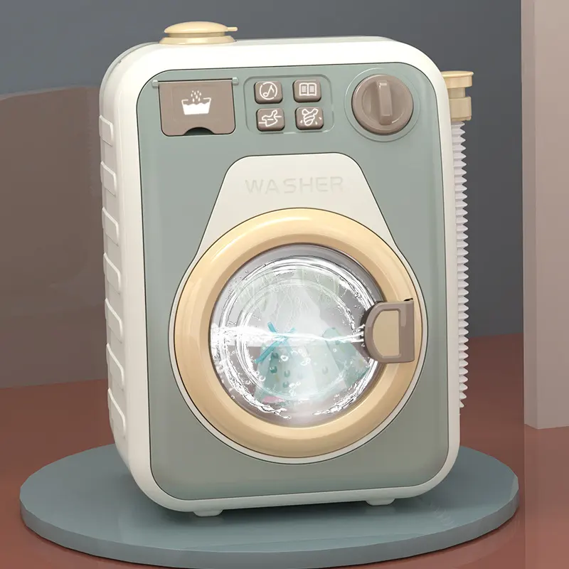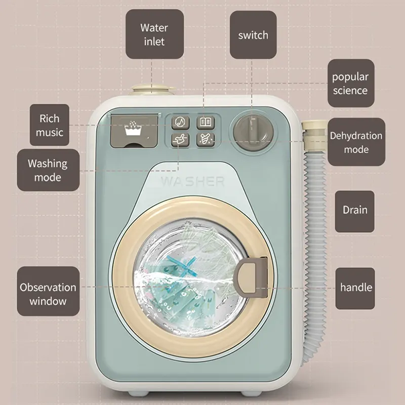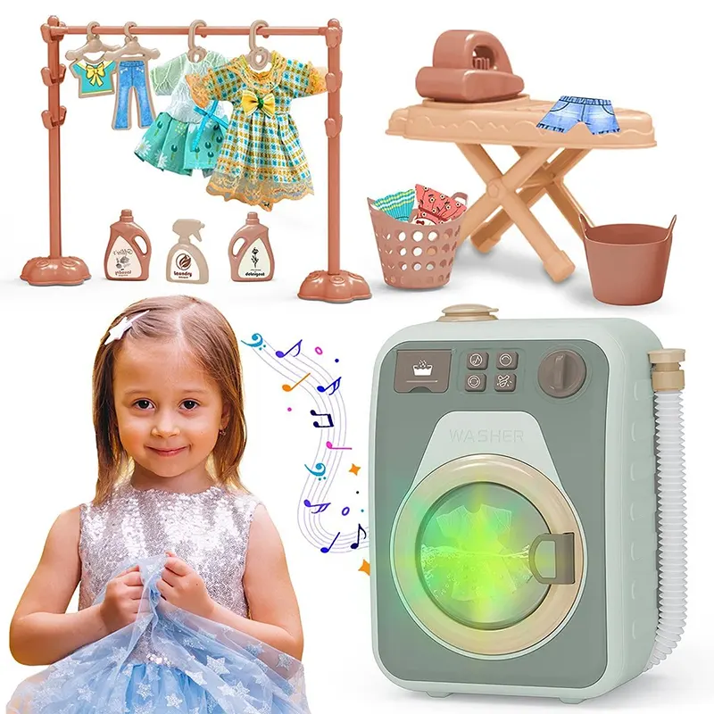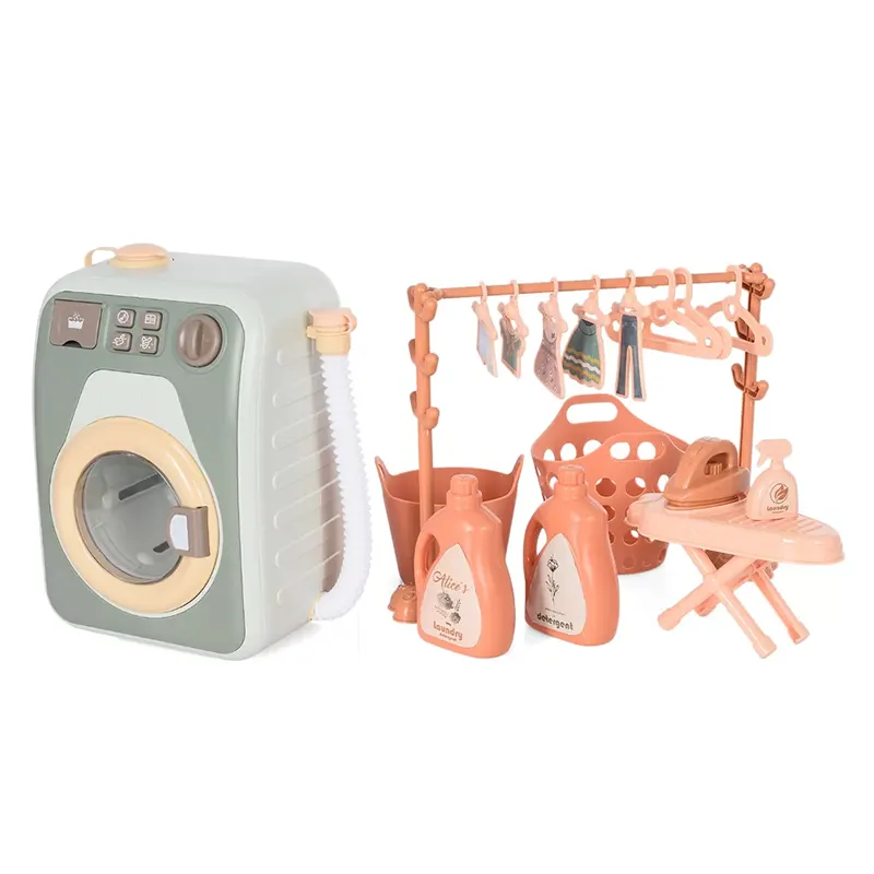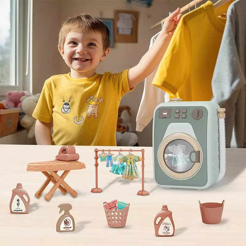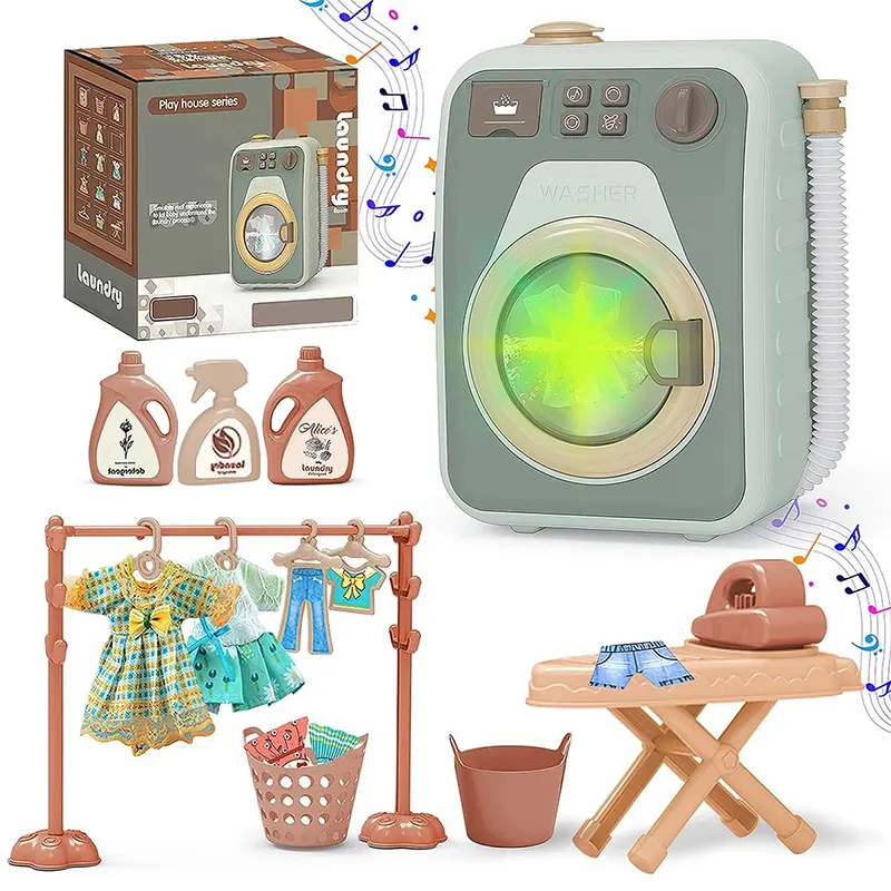 اسباب بازی لباسشویی کودک با قابلیت باز شدن در، مخزن مایع و داشتن دکمه حس بازی با وسایل واقعی را به کودک شما منتقل می کند. این ماشین لباسشویی اسباب بازی موزیکال دارای قابلیت چرخش و جلوه های نوری و صوتی است. کودک میتونه در دنیای خیالی خودش، لباس ها لکه دار را درون اسباب بازی ماشین لباسشویی بندازه تا حسابی تمیز بشه. کافیه در ماشین لباس شویی رو باز کنند، لباس های کثیف رو درون آن گذاشته آب درون ماشین لباسشویی بریزید مایع شوینده را در مخزن ماشین لباس شویی ریخته و دکمه مورد نظر را فشار دهند. بعد از شستن لباس با شلنگ متصل به ماشین لباسشویی آب درون ماشین لباسشو یی را خارج کنید. بازی با ماشین لباسشویی کودک برای به ها به خصوص دختر کوچولو ها خیلی لذت بخشه بنابراین، خرید ماشین لباسشویی بچگانه به عنوان اسباب بازی دخترانه میتونه یک هدیه منحصر به فرد و سرگرم کننده باشه. این ست شامل ماشین لباسشویی، سبد لباس، مواد شوینده، سطل، خوشبو کننده لباس، رگال، 7 عدد لباس، اتو، میز اتو، آویز لباس است.