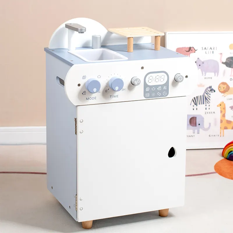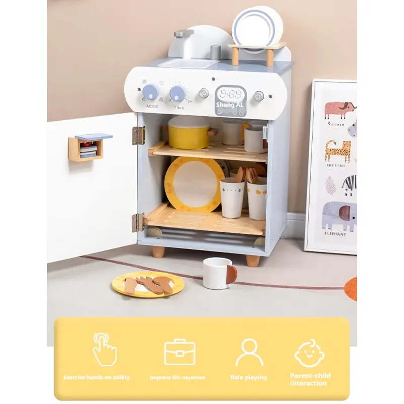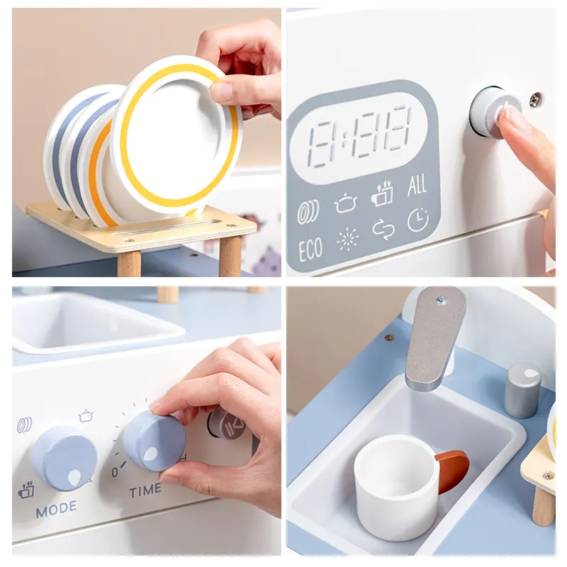 اسباب بازی ماشین ظرف شویی اسباب بازی با قابلیت باز شدن در ماشین ظرفشویی و لوازم چوبی مانند 4 عدد بشقاب، 4 عدد پیشدست، قابلمه، 4 عدد لیوان، 4 عدد و... (که در پکیج موجود است) مشابه ماشین ظرفشویی حس بازی با وسایل واقعی، نقش پذیری و خلاقیت را در کودکان 3 سال به بالا تقویت می کند و برای نقش بازی و داستان سرایی کودکان 3 سال به بالا مخصوصا دختر کوچولوها به عنوان اسباب بازی دخترانه انتخابی عالیست و موجبات سرگرمی کودک شما را فراهم می آورد. در این ماشین ظرفشویی باز میشود و با کمک دکمه هایی که روی آن دارد مثل تایمر و نوع شست و شو و روشن خموش کردن کودک میتواند وانمود به شستن ظرف ها کند.