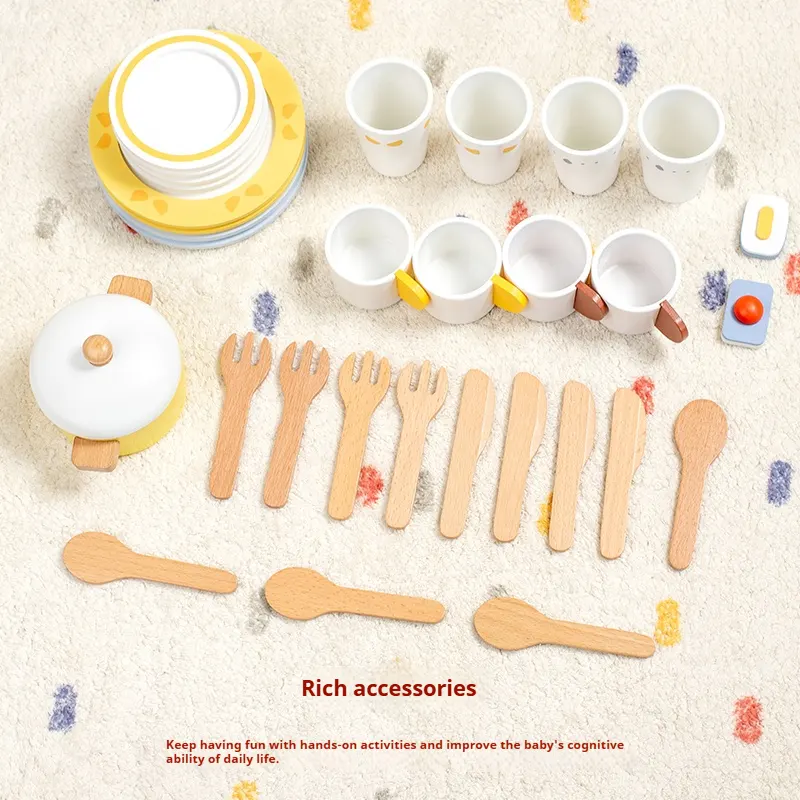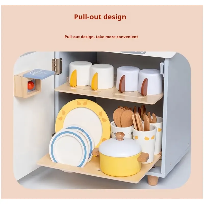 ماشین ظرف شویی اسباب بازی با قابلیت باز شدن در ماشین ظرفشویی و لوازم چوبی مانند 4 عدد بشقاب، 4 عدد پیشدست، قابلمه، 4 عدد لیوان، 4 عدد و... برای نقش بازی و داستان سرایی کودکان 3 سال به بالا مخصوصا دختر کوچولوها به عنوان اسباب بازی دخترانه انتخابی عالیست.