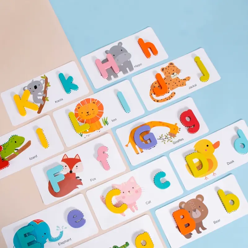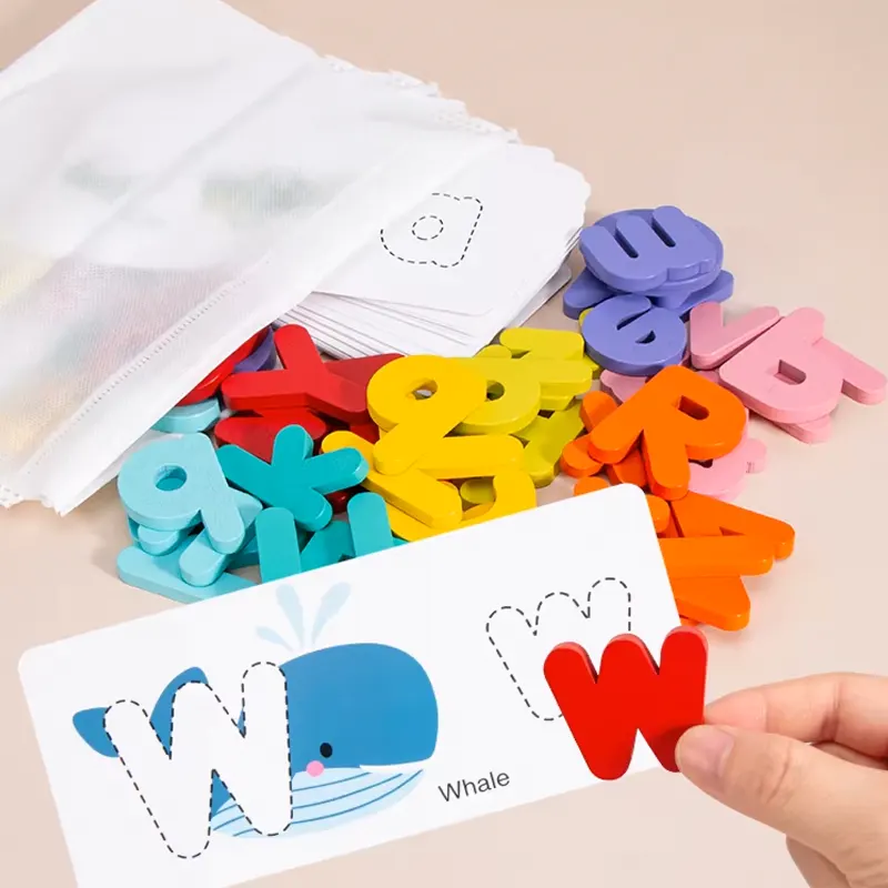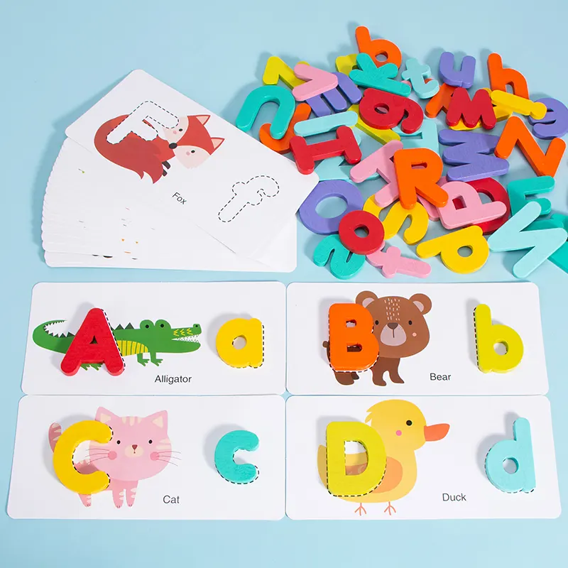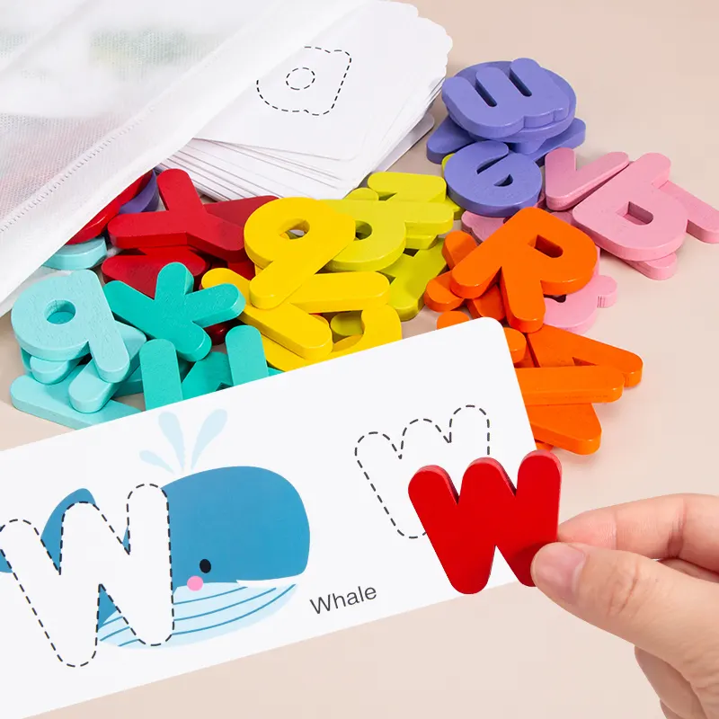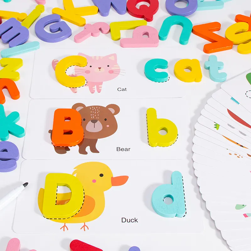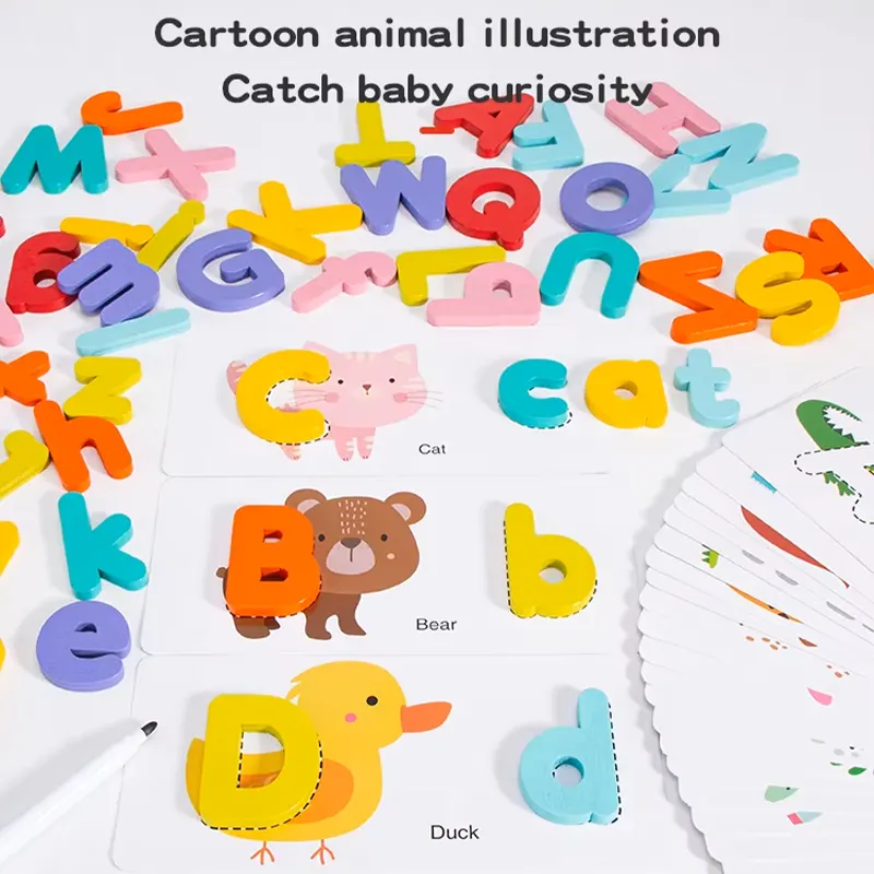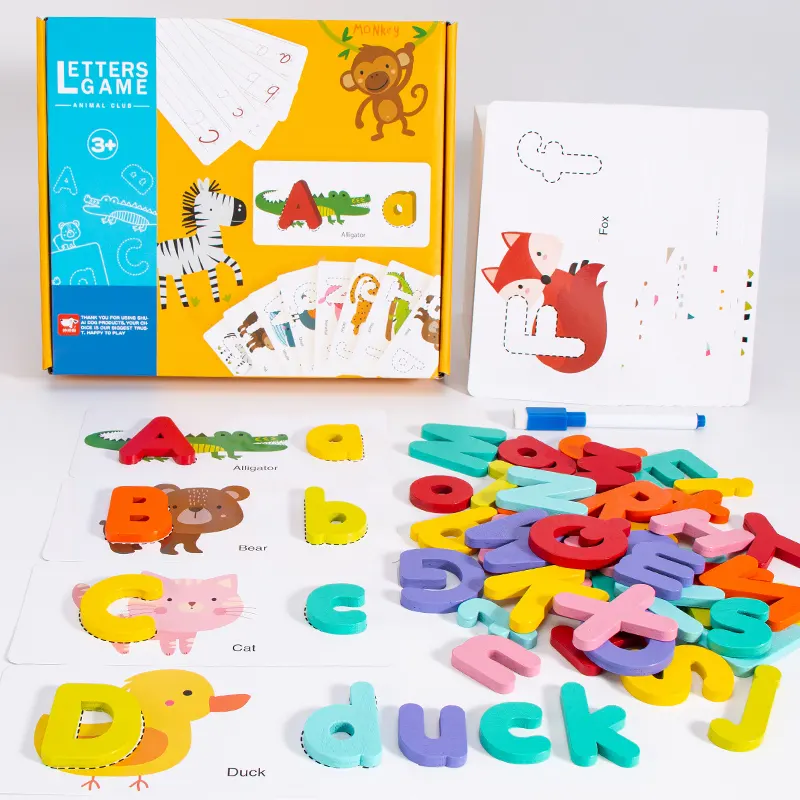 این پازل چوبی دارای 52 قطعه حروف الفبای انگلیسی چوبی جذاب و رنگی رنگی هست و در کنار اون 26 عدد فلش کارت های دو رو هست که توی اون تم های مختلفی مثل: حیوانات چاپ شده. این پازل چوبی آموزشی مناسب رده سنی بالای 3 ساله.