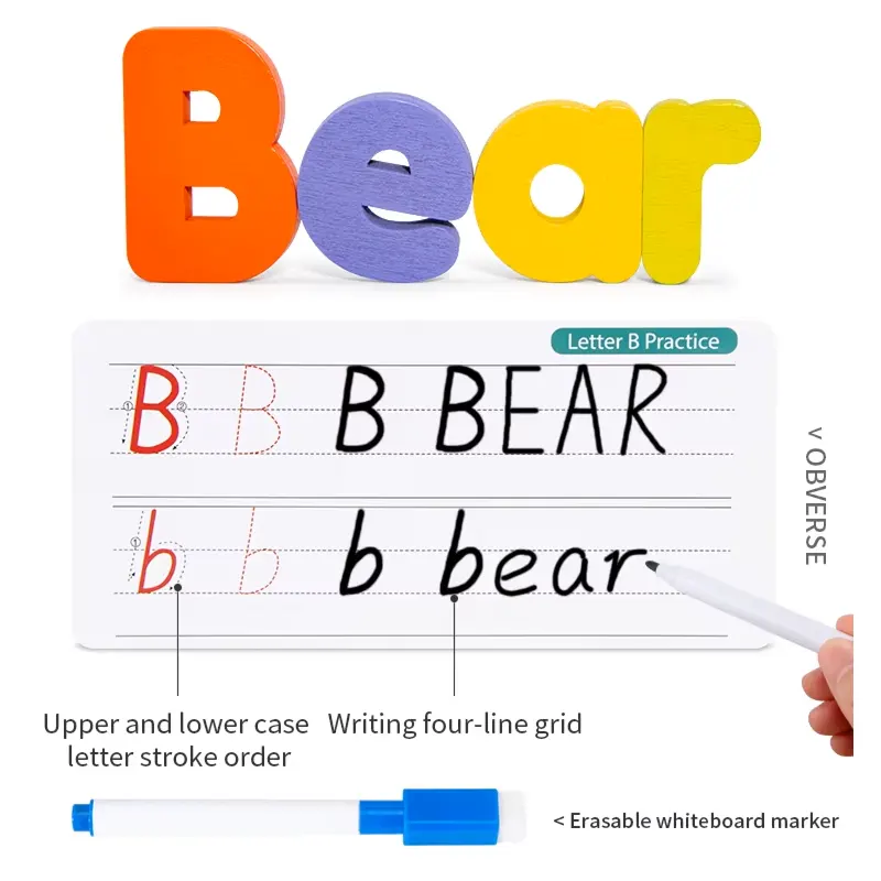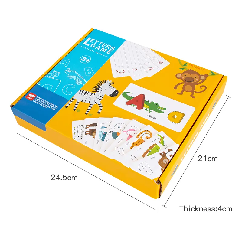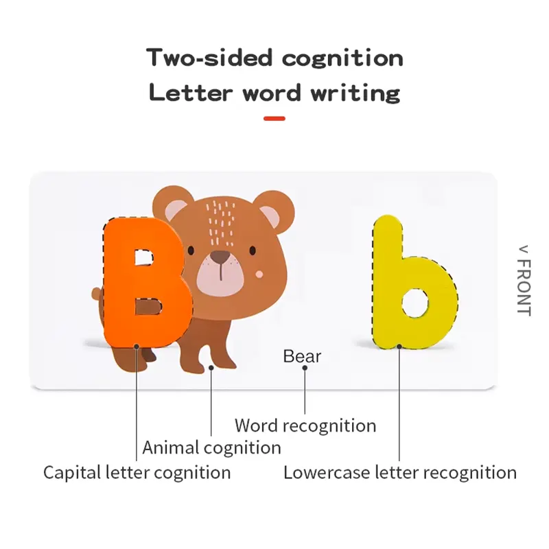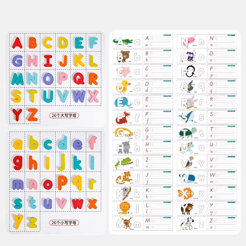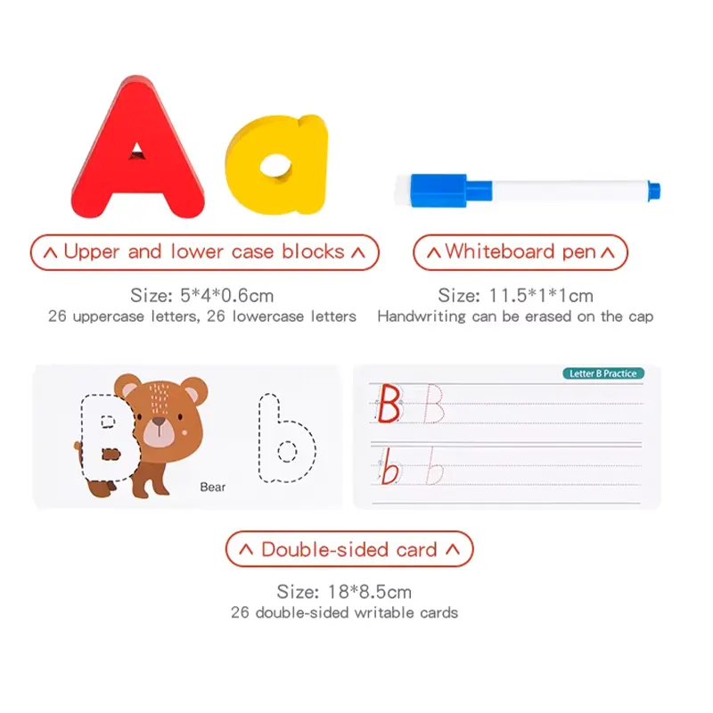 این پازل چوبی دارای 52 قطعه حروف الفبای انگلیسی چوبی بزرگ و کوچک جذاب و رنگی رنگی هست و در کنار اون 26 عدد فلش کارت های دو رو طرح حیوانات است که توی اون چاپ شده که کودک نسبت به هوش و خلاقیت خودش میتونه حروف الفبای انگلیسی چوبی رو مثل شکل های داخل کارت کنار هم بذاره و ساعت ها مشغول بازی و یادگیری زبان انگلیسی با این پازل جذاب باشه در پشت این کارت کودکان میتوانند به کمک ماژیک وایت برد تمرین کنند و الفبا را تکرار کنند. حتی میتونه سرگرمی مناسبی هم برای پدر و مادر ها باشه که کنار کودکشون از چیدن این پازل چوبی کودک لذت ببرن. بعد از تموم شدن بازی میتونید قطعات چوبی رو داخل کیسه مخصوص قرار بدید تا هر وقت خواستید از این پازل استفاده کنین.