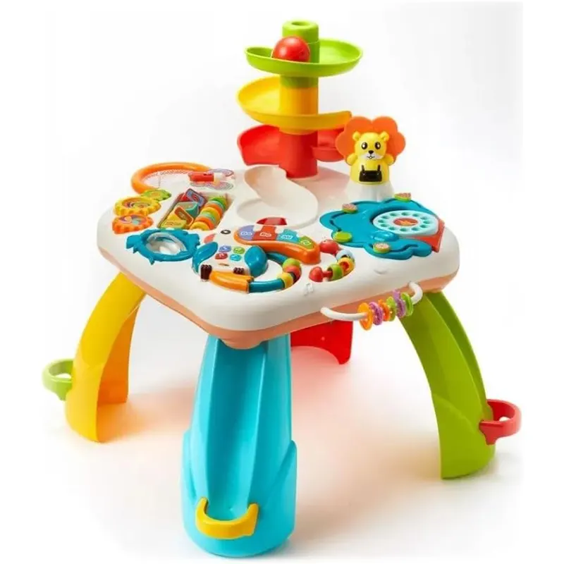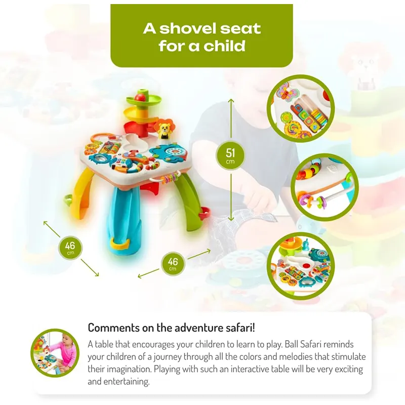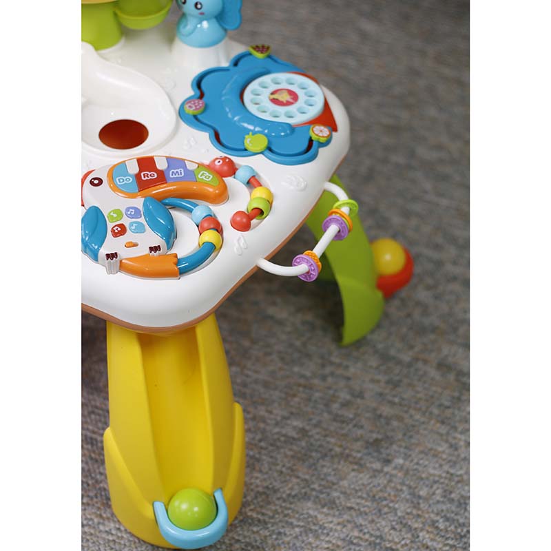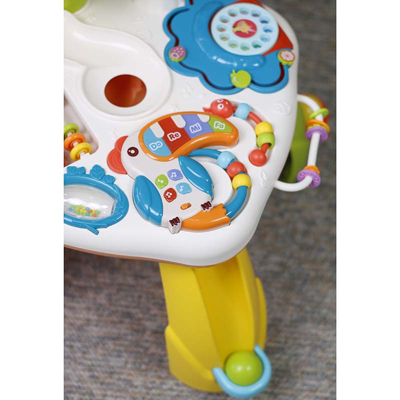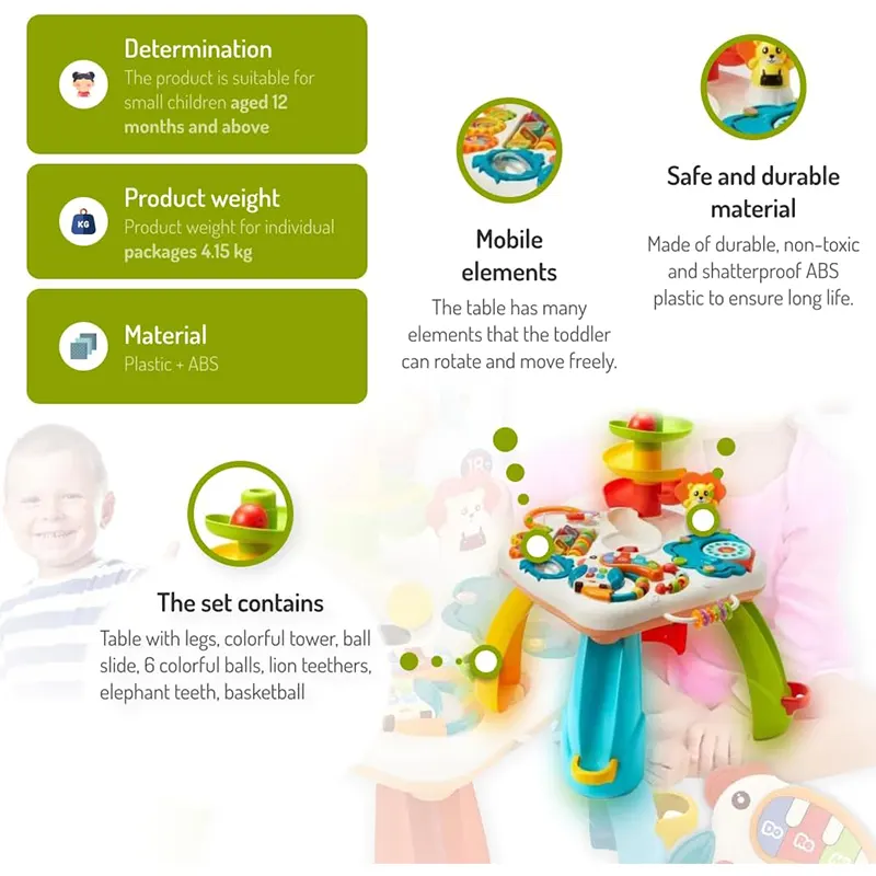 این میز بازی کودک موزیکال دارای رنگ های متنوع و جذاب است آهنگ های شاد و چراغ های چشمک زن آن سبب شناخت رنگ کودک میشود کمک میکند تا کودک بازی کند، سرگرم شود و همچنین حرکاتش را بهتر هماهنگ کند. این اسباب بازی برای سن بالای 18 ماه مناسب است و متناسب با کودک طراحی شده است تا بتواند به هر قسمت از آن که می خواهد برسد. این اسباب بازی با رنگ های شادی که در آن به کار رفته می تواند در جلب توجه کودک به صدا و رنگ مفید بوده و به بهبود کارایی دیداری و شنیداری کودک کمک کند. این میز آموزشی باعث تحریک خلاقیت و هوش خواهد شد.