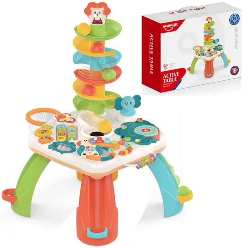 این میز بازی موزیکال مخصوص کودک با رنگ های شادی که در آن به کار رفته می تواند در جلب توجه کودک به اشکال و رنگ ها مفید بوده و به بهبود مهارت های دیداری کودک کمک کند و ساعت ها سرگرمی برای کودک به همراه آورد. این اسباب بازی برای کودکان بالاتر از 18 ماه مناسب است. میز بازی کودک موزیکال هوانگر یک عروسک شیر بامزه دارد که از جنس سیلیکون بهداشتی است و شامل چندین بازی مختلف مانند سرسره توپ 6 طبقه، پرتاب توپ توی حلقه، توکا پیانو موزیکال با 4 کلید است. علاوه بر این میز بازی تلفن بازی، چرخ دنده و حلقههای رنگی نیز دارد که باعث جلب توجه کودک میشود.