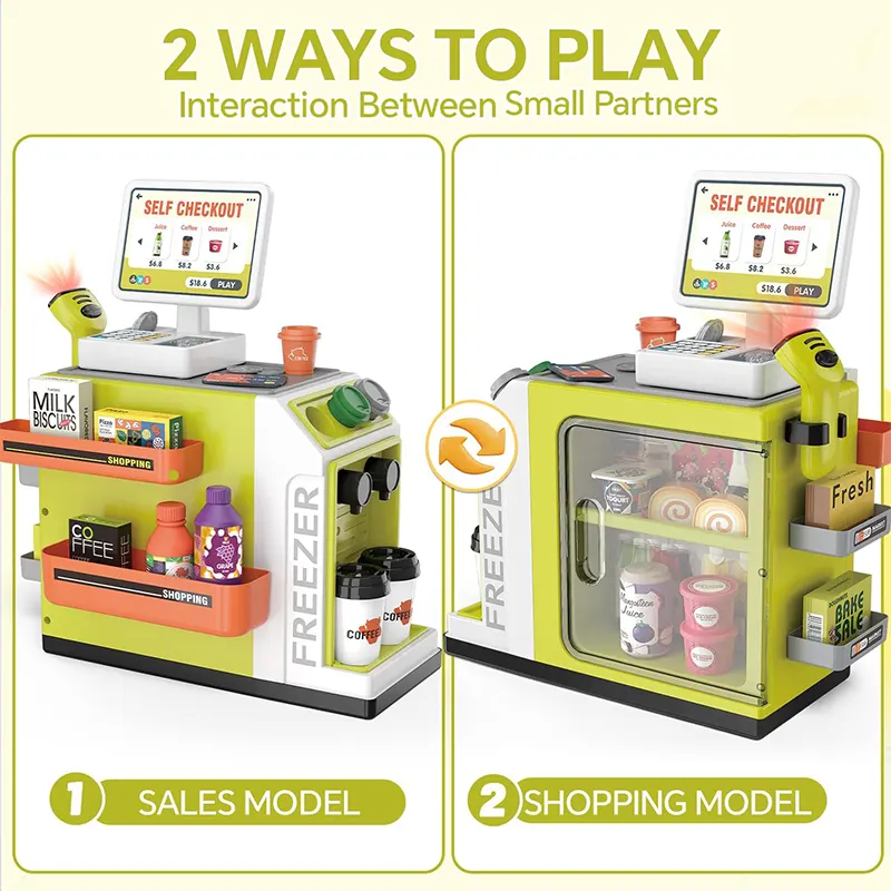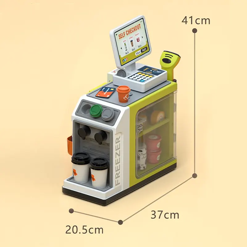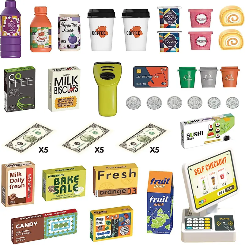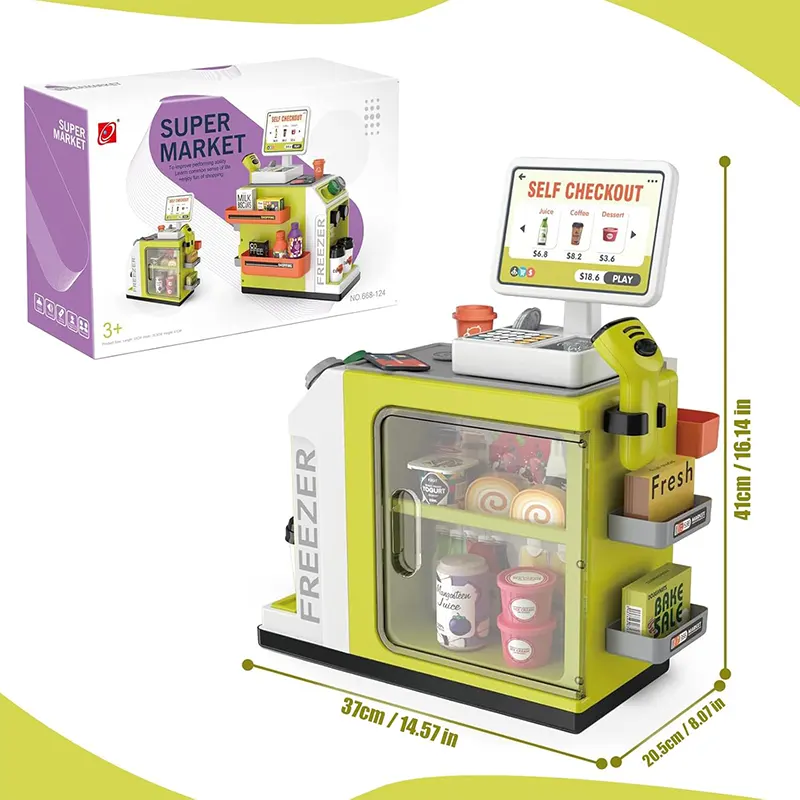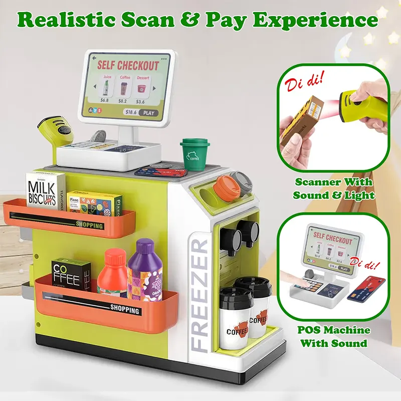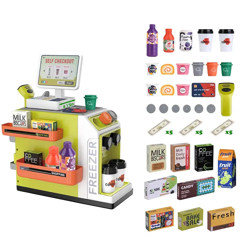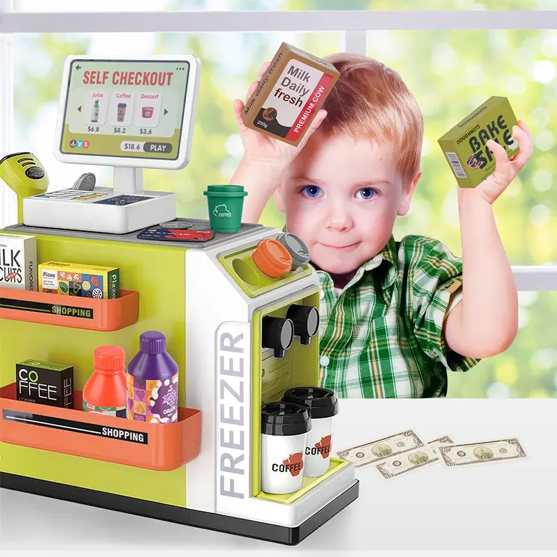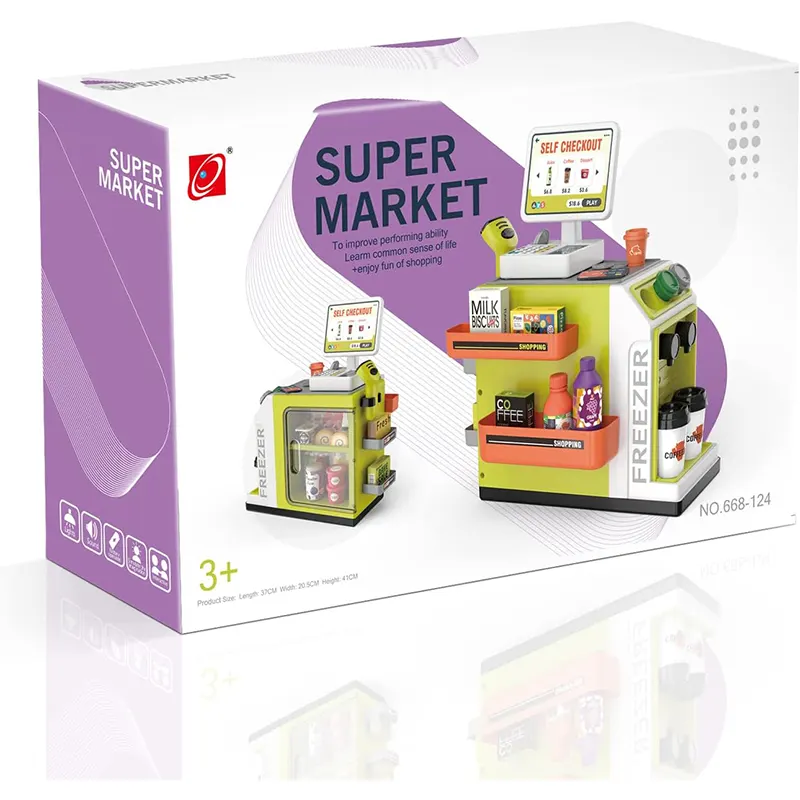 سوپر مارکت اسباب بازی دارای اسکنر (بارکد خوان) و دستگاه پوز است. کودک مواد غذایی خود را انتخاب میکند و سپس در صندق با بارکد خوان قیمت را به صورت خیالی وارد میکند و میتواند با کمک دستگاه پوز یا پول نقد خرید خود را حساب کند. این اسباب بازی دارای قهوه و اسپرسو ست که 3 طعم در بالا قرار میگیرد و لیوان ها در پایین و زیر نازل و هنگام بازی حس ریختن یک هوه گرم و خوشمزه به کودک دست میدهد. درهای قفسه این سوپر مارکت بزرگ باز و بسته میشود. بازی با این استند فروشگاه موجب تقویت خلاقیت، مهارت های حرکتی از جمله دست ورزی، تقویت بینایی، افزایش هماهنگی چشم و دست می شود همچنین این اسباب بازی برای بازی های تعاملی و گروهی ایده آل است. این اسباب بازی سوپرمارکت با بسته بندی زیبا و قابل توجه خود یک هدیه فوق العاده برای کودکان بالای 3 سال است.