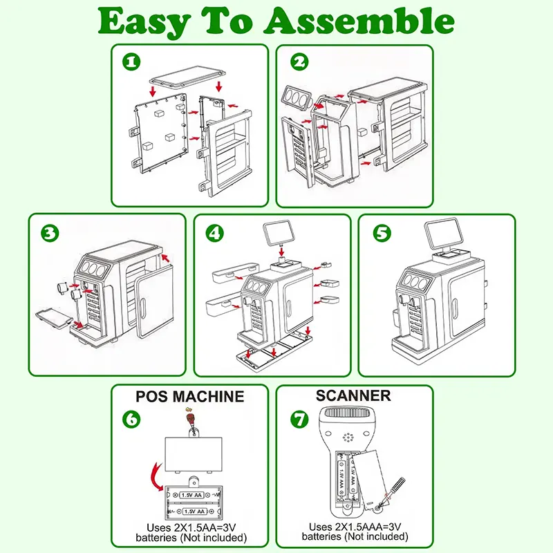 بارکد خوان و دستگاه پوز این سوپر مارکت دارای جلوه های نوری و صوتی است فقط کافیه 2 عدد باتری نیم قلمی به اسکنر و 2 عدد باتری قلمی به دستگاه پوز وصل کنید و خرید و فروش انجام دهید. توجه کنید نوع باتری حتما باتری قلمی و نیم قلمی GP مدل Ultra alkaline. این اسباب بازی سوپر مارکت برای نقش بازی و خیال پردازی کودک بسیار مناسب است. اگر دوست دارین کوچولوتون توی دنیایی نقش بازی خودش خرید و فروش رو تجربه کنه و در عین حال مهارت های ذهنیش مثل یادگیری خوراکی ها، شمارش اعداد و ... و همچنین مهارت های فیزیکیش مثل هماهنگی چشم و دست تقویت بشه، بهتون خرید اسباب بازی سوپر مارکت با صندوق فروش رو پیشنهاد میکنیم.