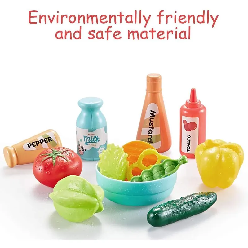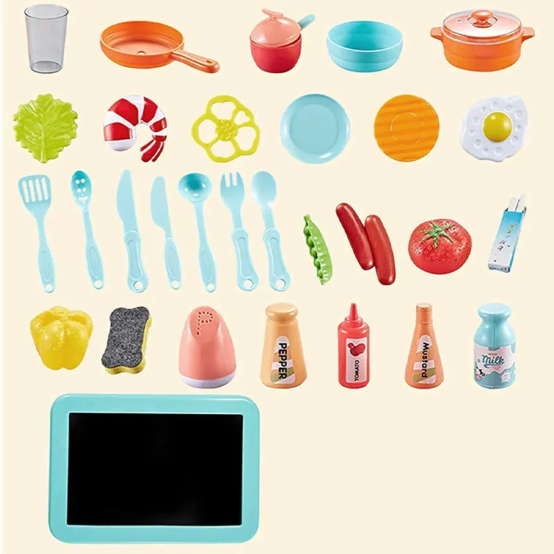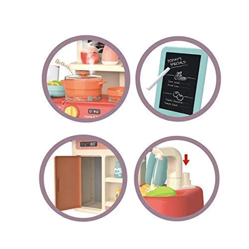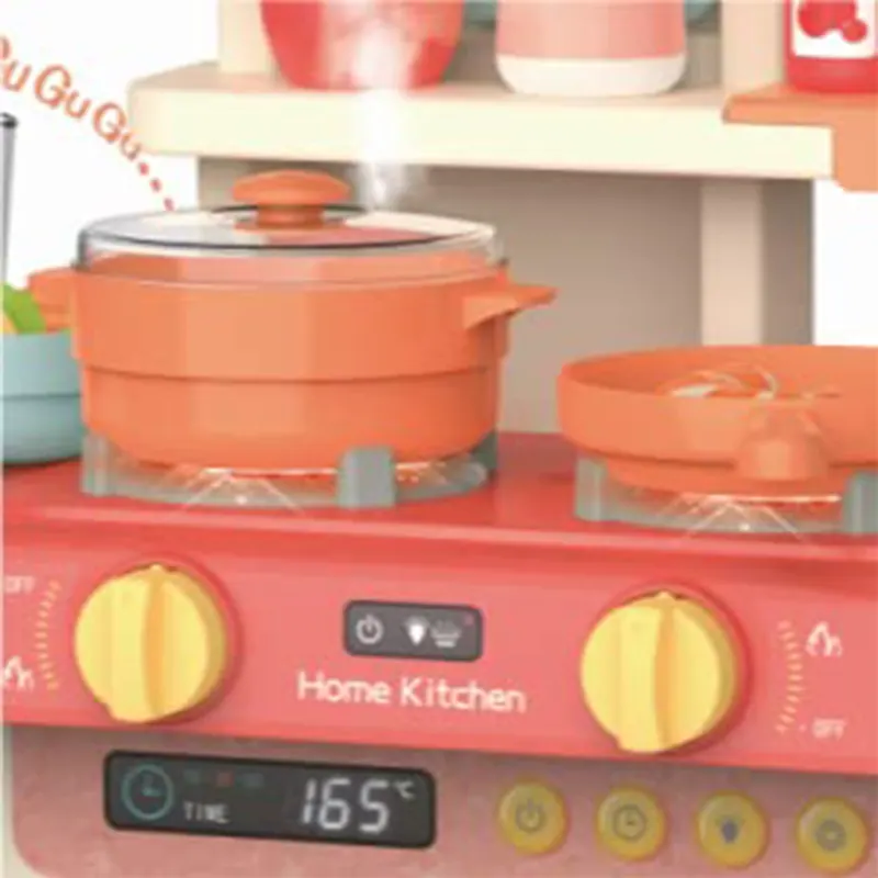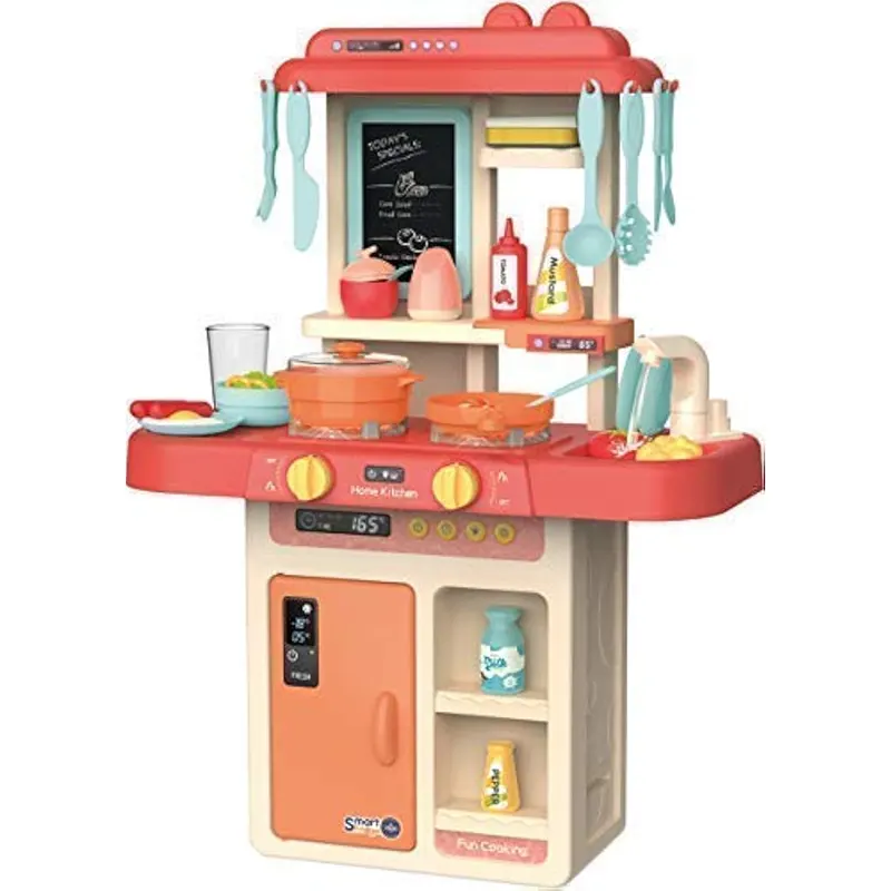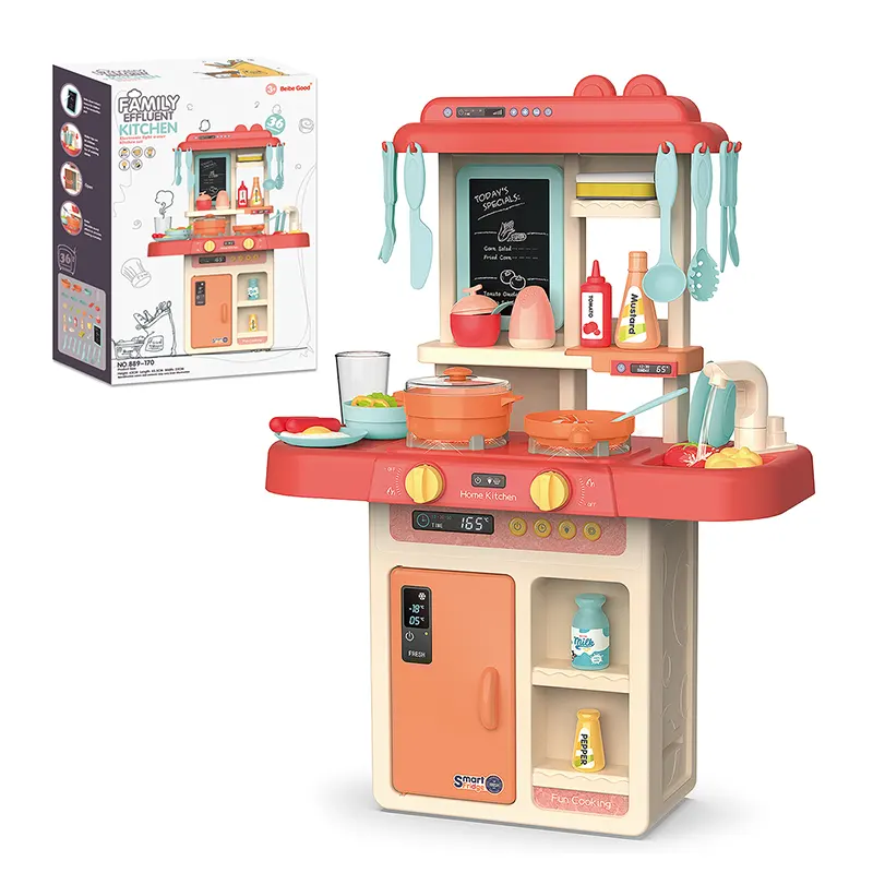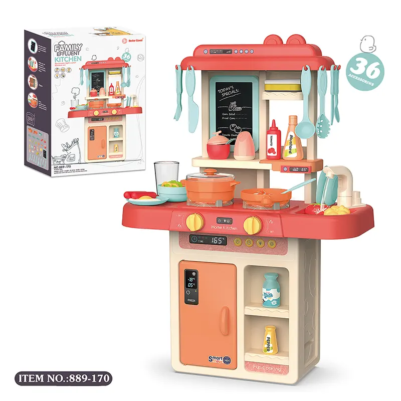 آشپزخانه کودک یک اسباب بازی سرگرم کننده برای نقش بازی دختران و پسران کوچولو می باشد که عاشق آشپزی و خاله بازی هستند. این آشپزخانه اسباب بازی موزیکال دارای لوازم مختلف مانند قابلمه، ماهیتابه، لیوان، چنگال، چاقو، قاشق، میوه، سبزیجات، شیر آب ، سینک ظرفشویی، بطری سس، کابینت، ظرف ادویه، نیمرو، تخته سیاه، یخچال و... می باشد. در این ست آشپزی درهای یخچال باز و بسته می شوند و گاز دارای جلوه های نوری و صوتی می باشد و با چرخاندن آنها چراغ زیر شعله گاز روشن میشود. با روشن شدن چراغ صدا نیز به گوش میرسد که حس خوب آشپزی را به کودک میدهد. شیر آب آشپزخانه اسباب بازی کودک به صورت پمپاژی است. به اجاق آن 3 عدد باتری قلمی میخورد که دارای صدای آشپزی و نور قرمز برای واقعی جلوه دادن آشپزی کودکان است.