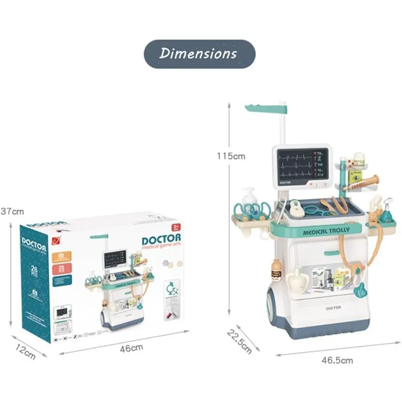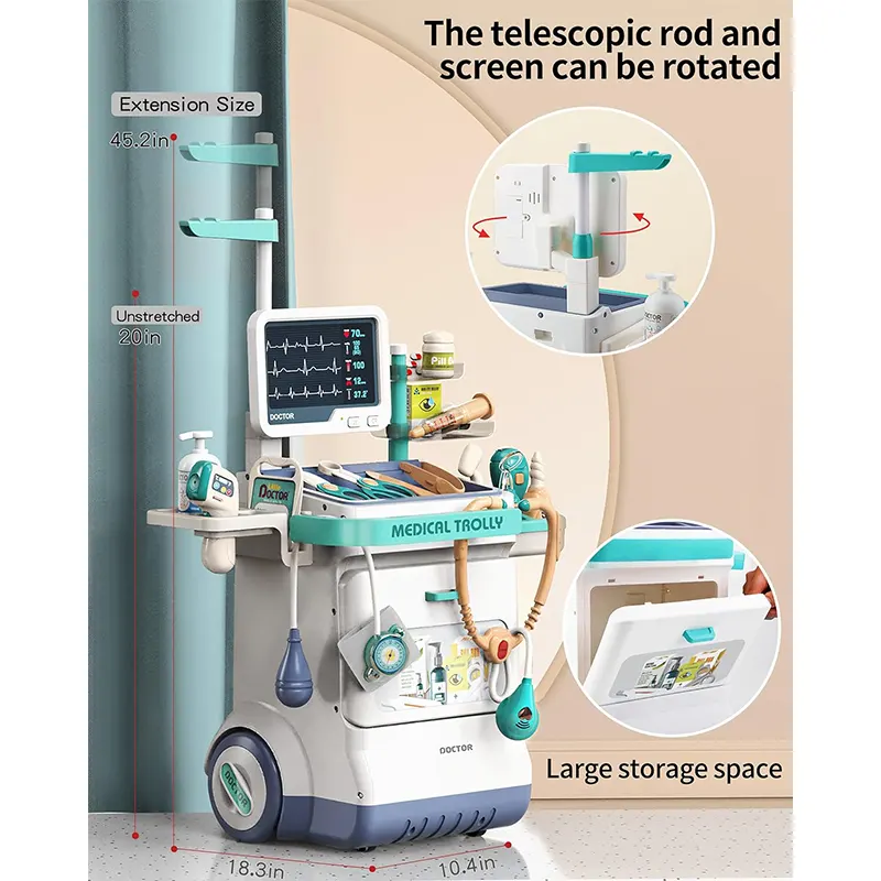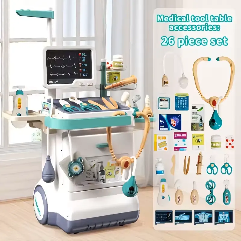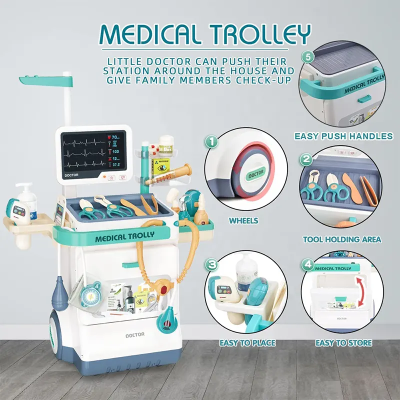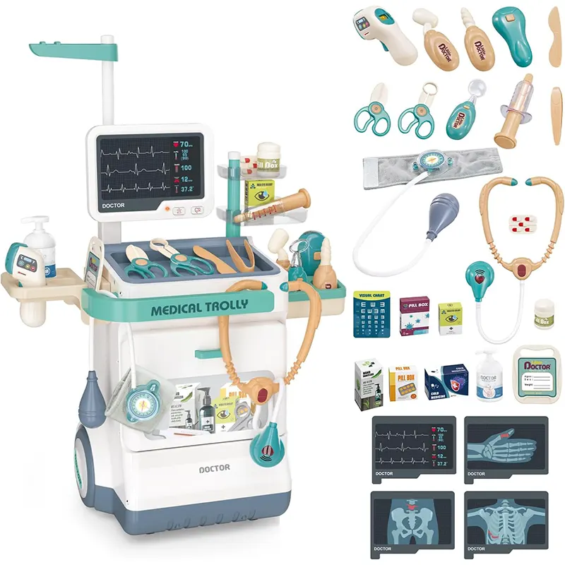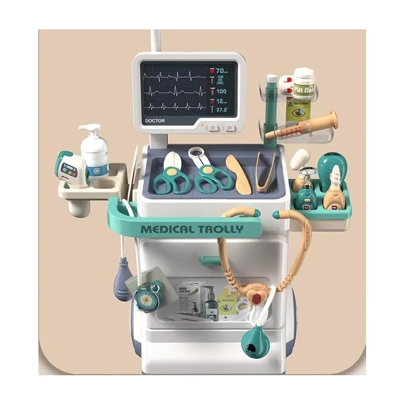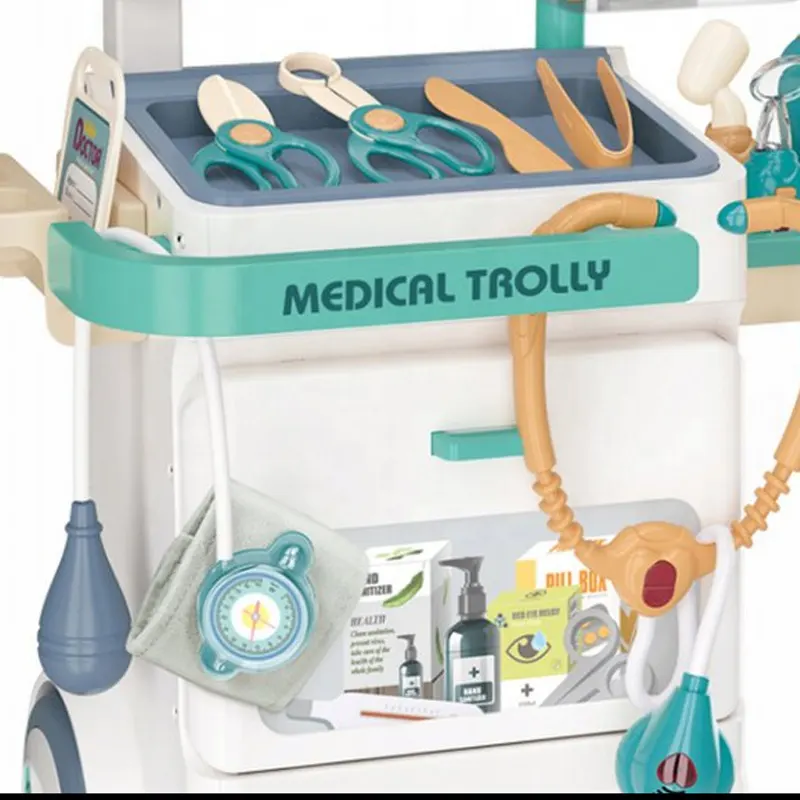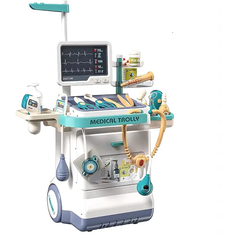 این میز چرخدار جذاب پزشکی یک اسباب بازی آموزشی و بسیار سرگرم کننده برای کودکانی است که دوست دارند در خانه بتوانند نقش آفرینی کنند. کیت پزشکی اسباب بازی کوچولو شامل 26 قطعه پلاستیکی برای ساخت ترولی و همچنین تجهیزات پزشکی مثل عکس MRI، قیچی، قیچی مخصوص جراحی، دستگاه فشار، گوشی پزشکی، آمپول، قرص، تب سنج و... است. این ترولی پزشکی برای گروه سنی 3 سال به بالا مناسب است. همچنین جنس پلاستیک با کیفیت ABS که فاقد مواد شیمیایی و سمی مثل BPA است و لبه های نرم و بدون تیزی و برندگی آن سلامت و ایمنی این محصول را بالا می برد.