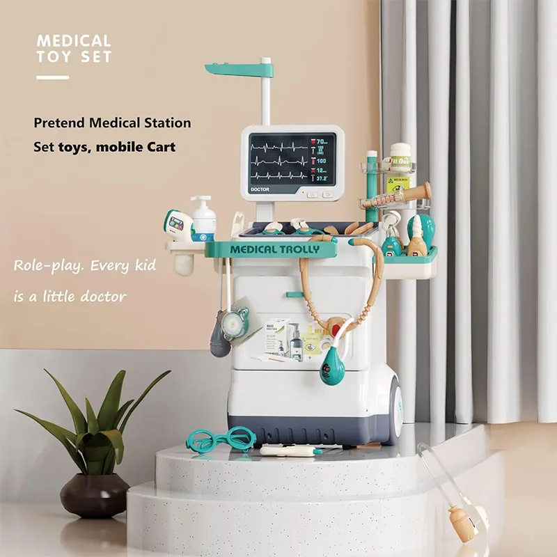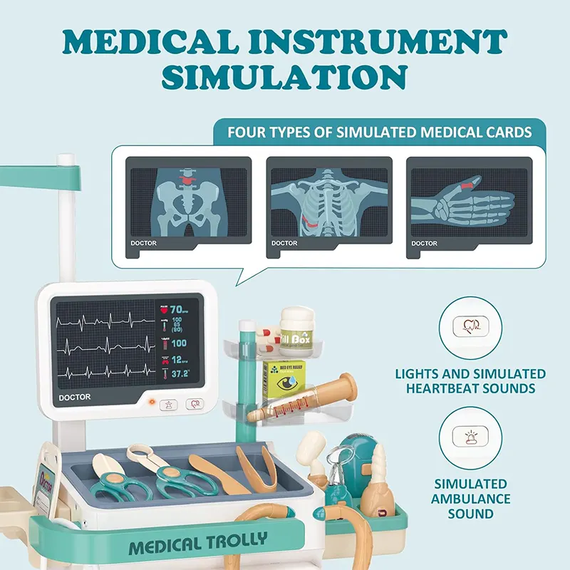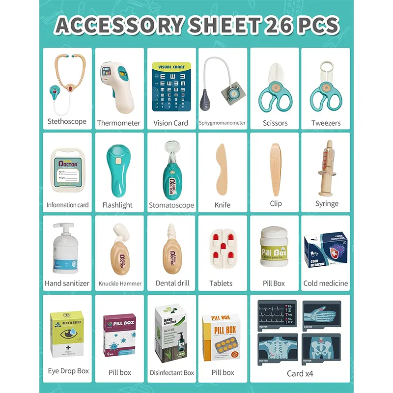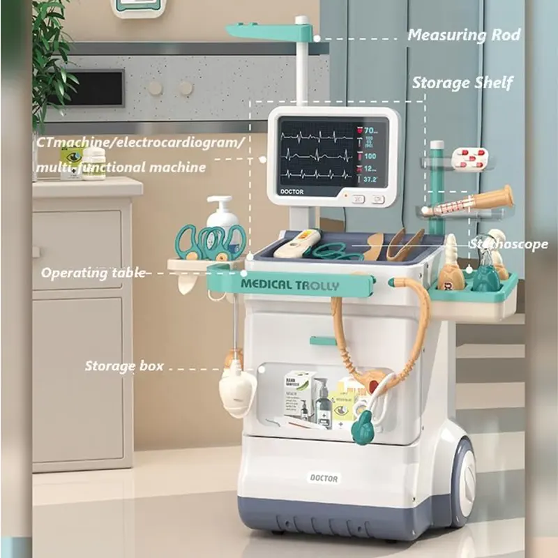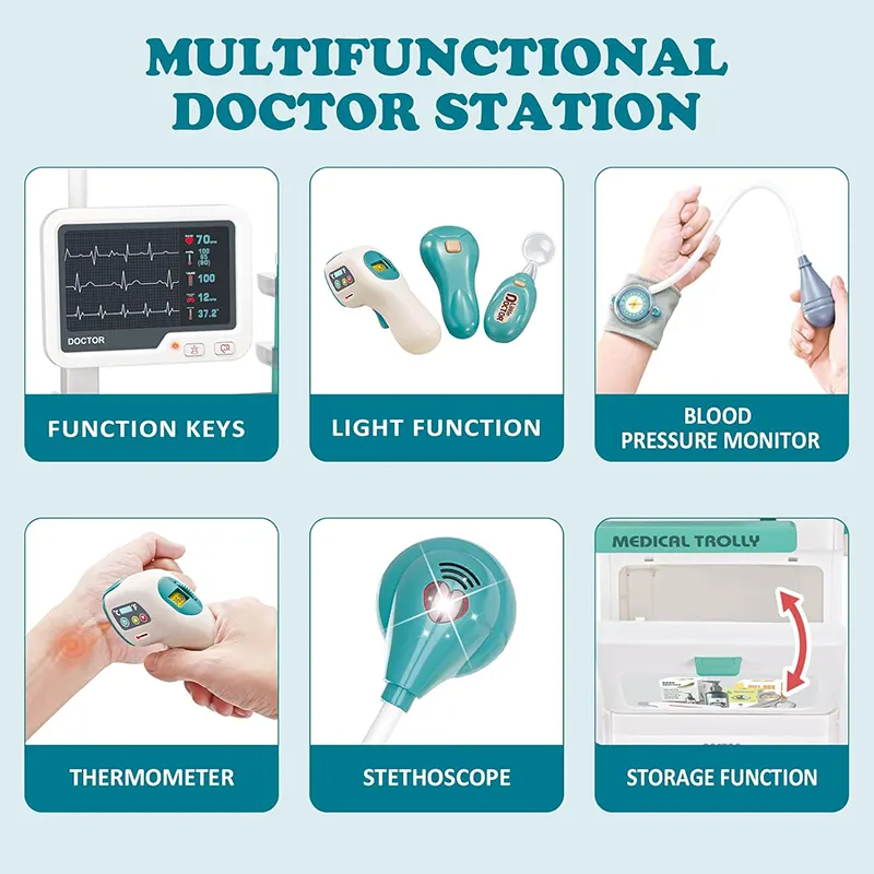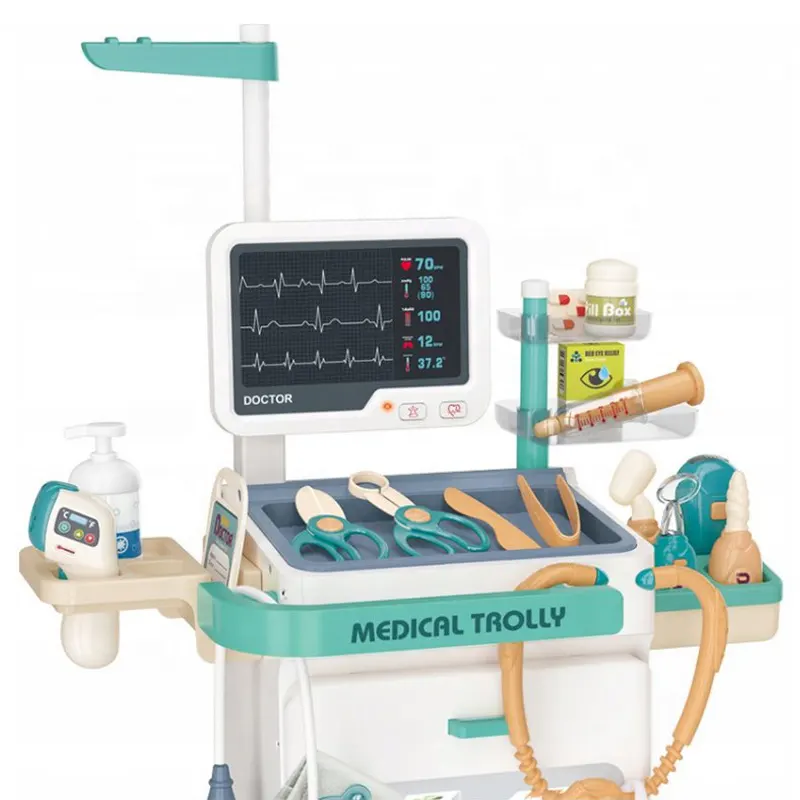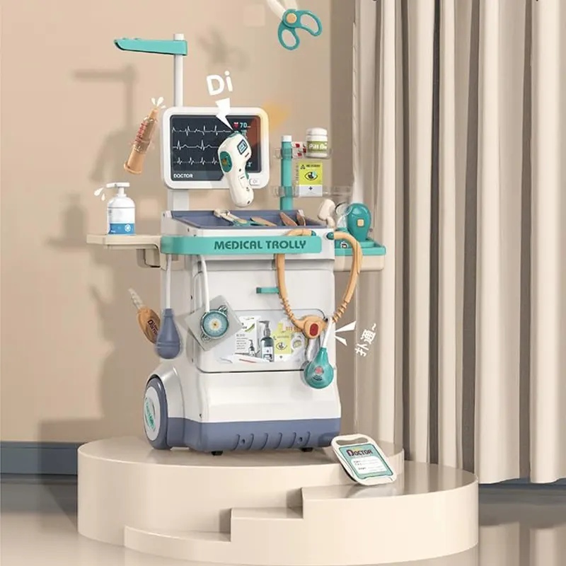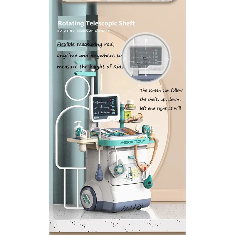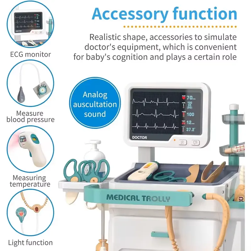 این میز چرخدار جذاب پزشکی یک اسباب بازی آموزشی و بسیار سرگرم کننده برای کودکانی است که دوست دارند در خانه بتوانند نقش آفرینی کنند. کیت پزشکی اسباب بازی کوچولو شامل 26 قطعه پلاستیکی برای ساخت ترولی و همچنین تجهیزات پزشکی مثل عکس MRI، قیچی، قیچی مخصوص جراحی، دستگاه فشار، گوشی پزشکی، آمپول، قرص، تب سنج و... است. این ترولی پزشکی برای گروه سنی 3 سال به بالا مناسب است. همچنین جنس پلاستیک با کیفیت ABS که فاقد مواد شیمیایی و سمی مثل BPA است و لبه های نرم و بدون تیزی و برندگی آن سلامت و ایمنی این محصول را بالا می برد.