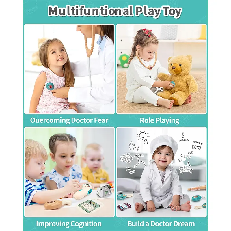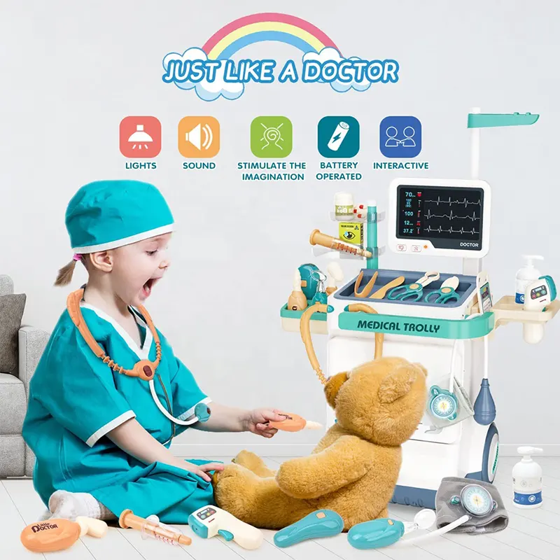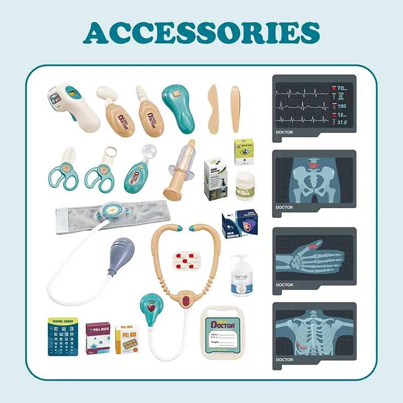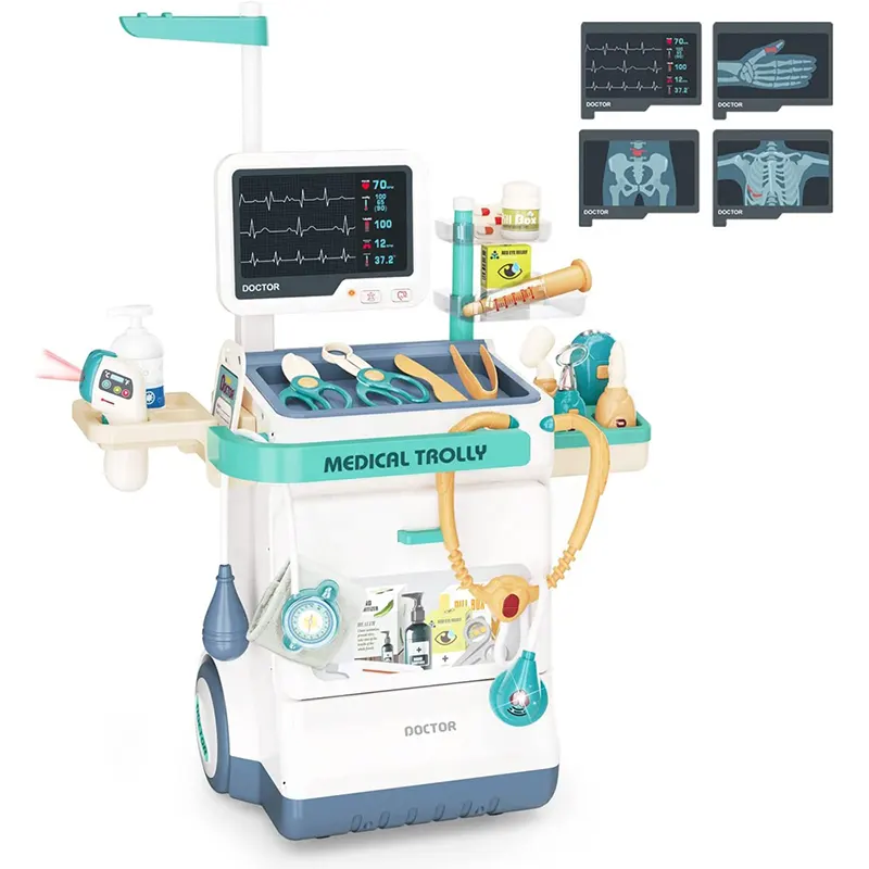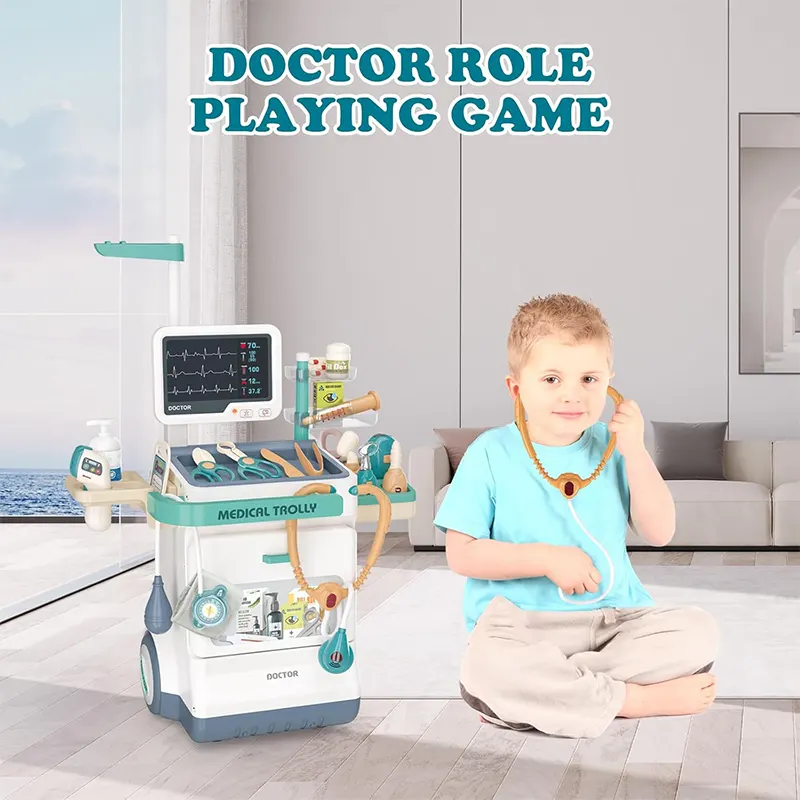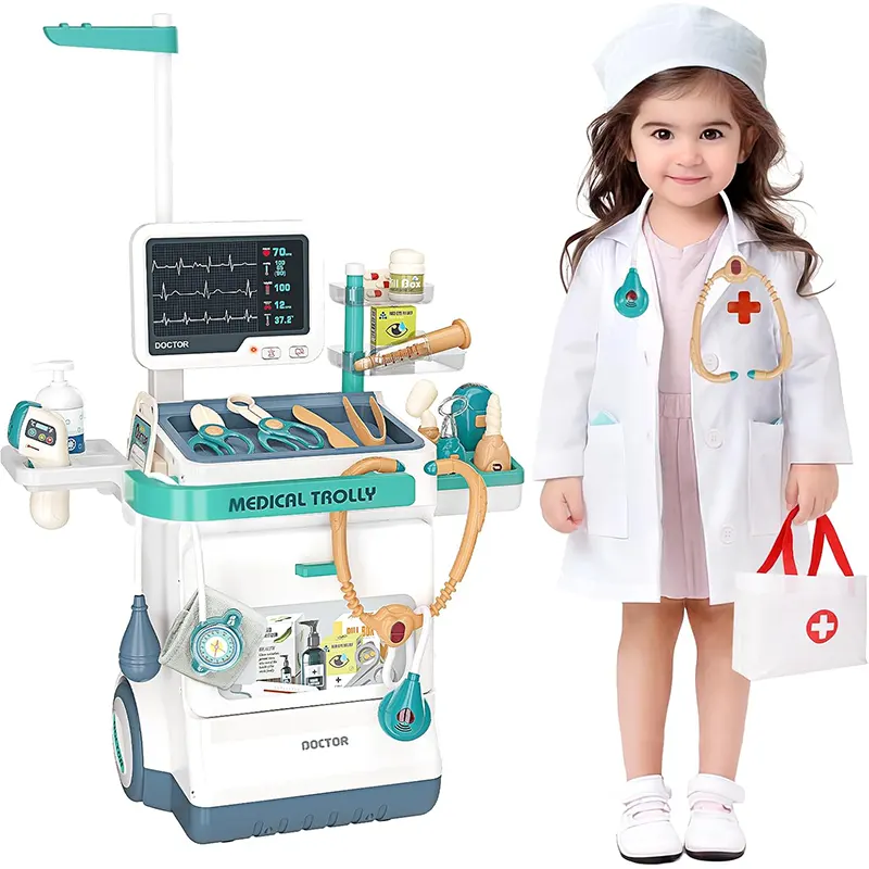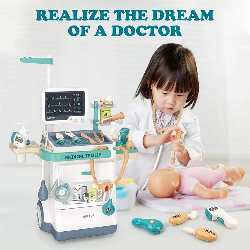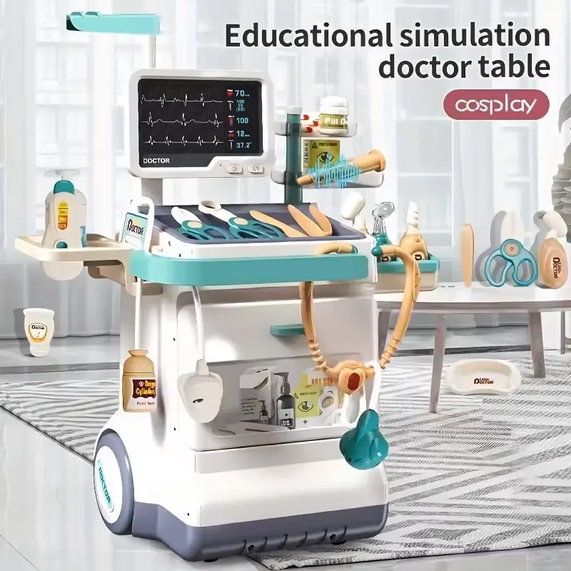 این میز چرخدار جذاب پزشکی یک اسباب بازی آموزشی و بسیار سرگرم کننده برای کودکانی است که دوست دارند در خانه بتوانند نقش آفرینی کنند. کیت پزشکی اسباب بازی کوچولو شامل 26 قطعه پلاستیکی برای ساخت ترولی و همچنین تجهیزات پزشکی مثل عکس MRI، قیچی، قیچی مخصوص جراحی، دستگاه فشار، گوشی پزشکی، آمپول، قرص، تب سنج و... است. این ترولی پزشکی برای گروه سنی 3 سال به بالا مناسب است. همچنین جنس پلاستیک با کیفیت ABS که فاقد مواد شیمیایی و سمی مثل BPA است و لبه های نرم و بدون تیزی و برندگی آن سلامت و ایمنی این محصول را بالا می برد.