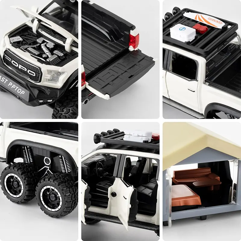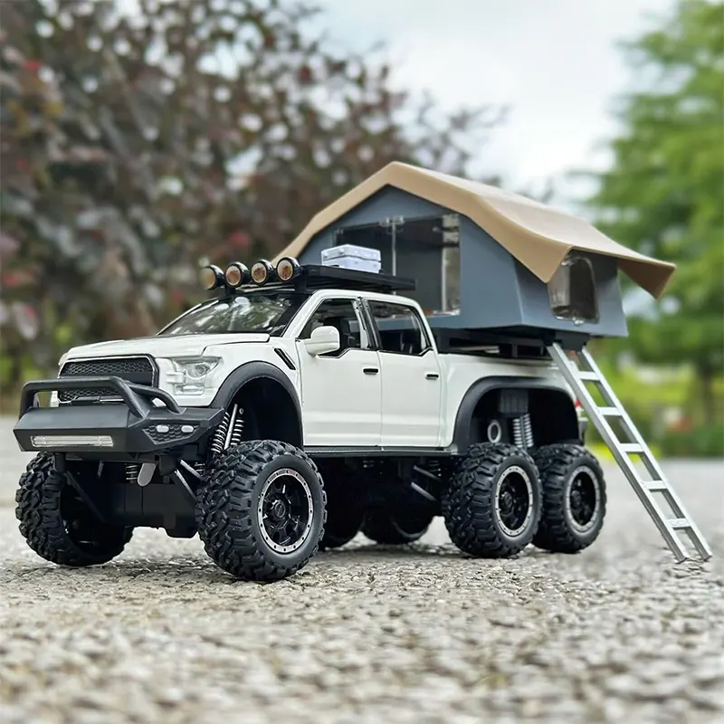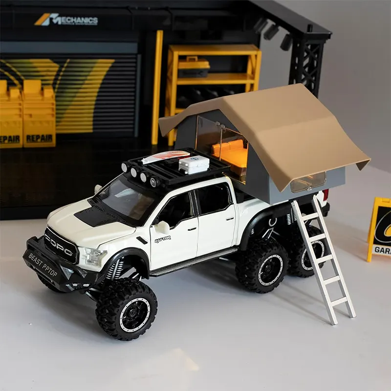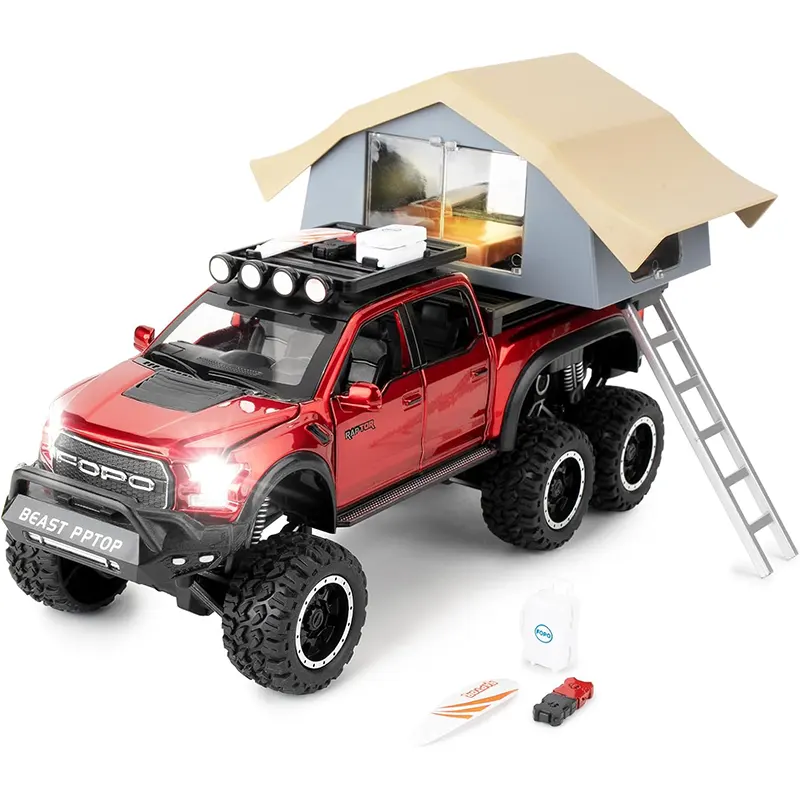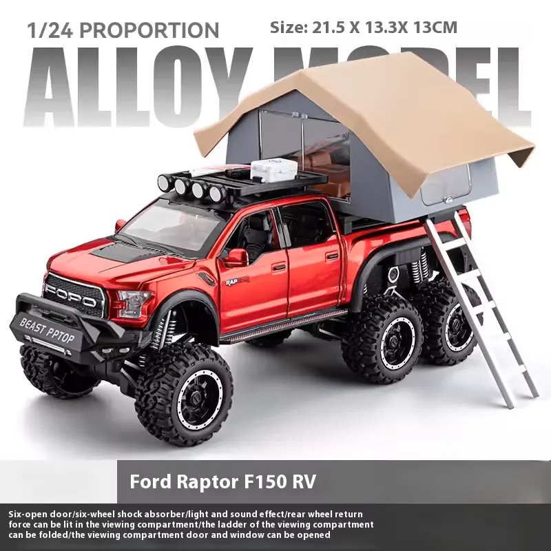 ماکت ماشین عقب کش مدل Ford raptop با کمپر دارای کمکفنر واقعی برای تجربهای نزدیک به واقعیت. مجهز به چراغهای جلو و عقب که روشن میشوند و دارای سیستم صوتی برای تجربهای واقعیتر بادرهای جلو و عقب بازشو و اتاق کمپر چراغدار برای حس واقعی یک کمپینگ.