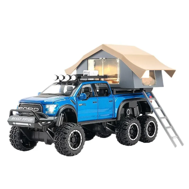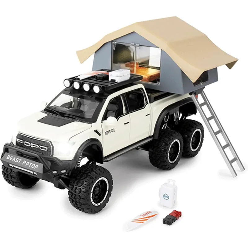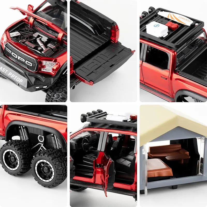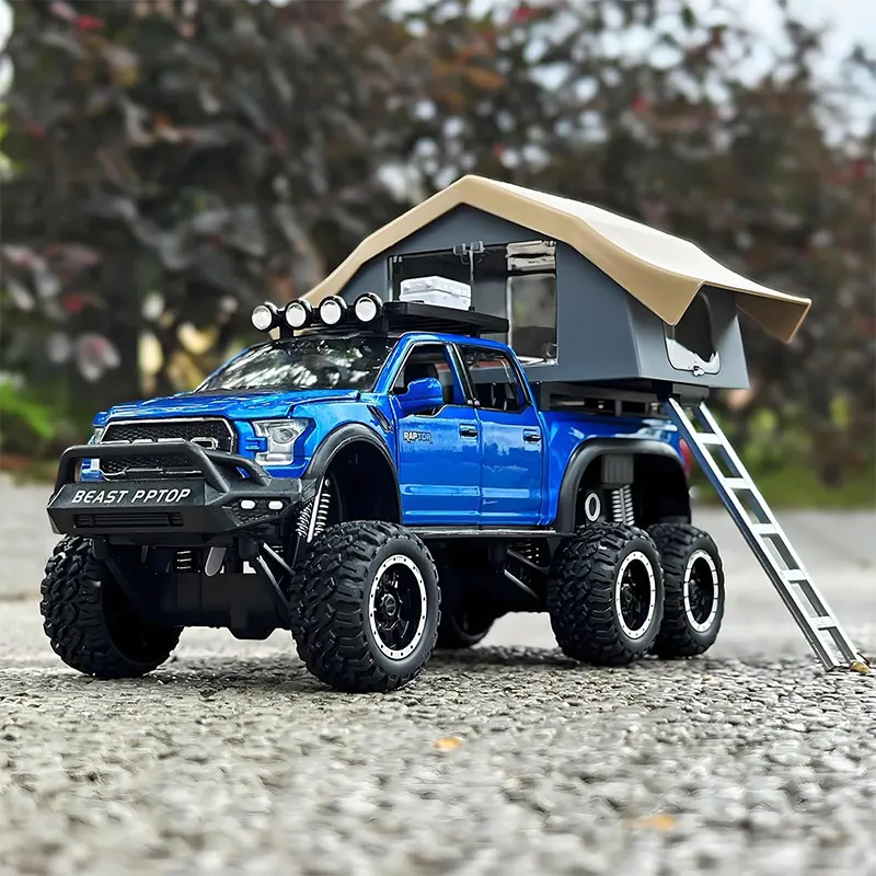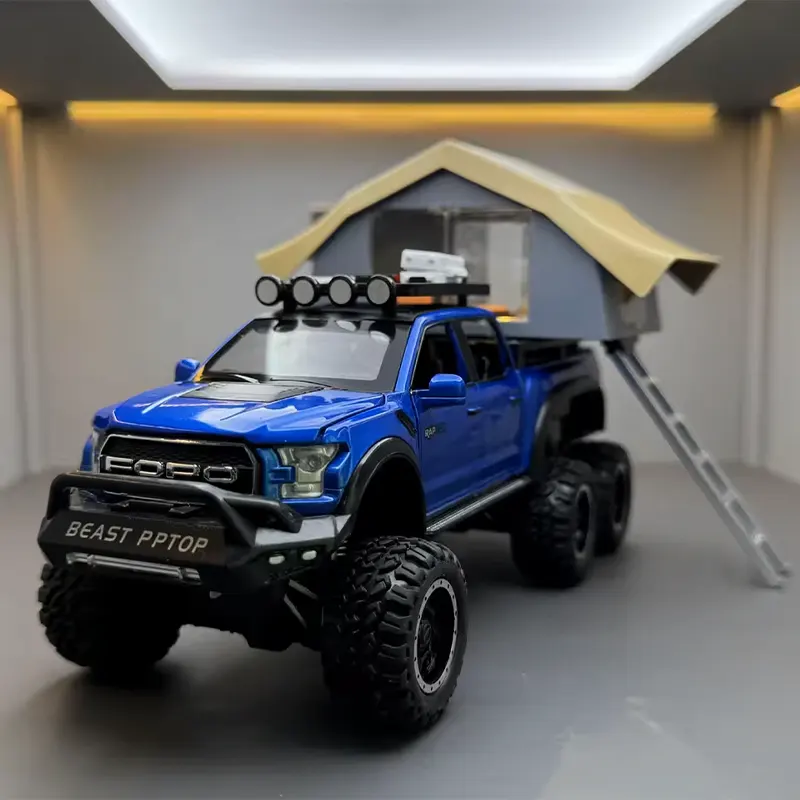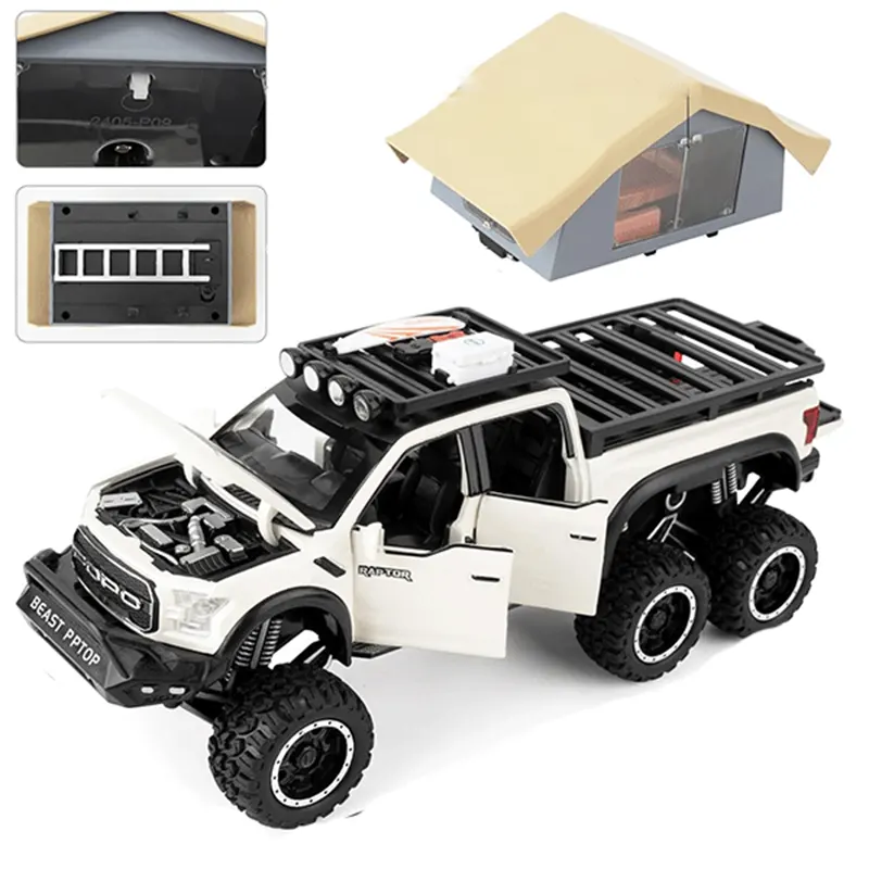 ماکت ماشین عقب کش مدل Ford raptop با کمپر دارای کمکفنر واقعی برای تجربهای نزدیک به واقعیت. مجهز به چراغهای جلو و عقب که روشن میشوند و دارای سیستم صوتی برای تجربهای واقعیتر بادرهای جلو و عقب بازشو و اتاق کمپر چراغدار برای حس واقعی یک کمپینگ.