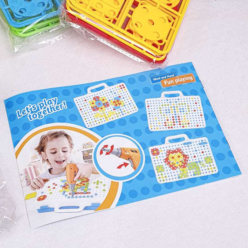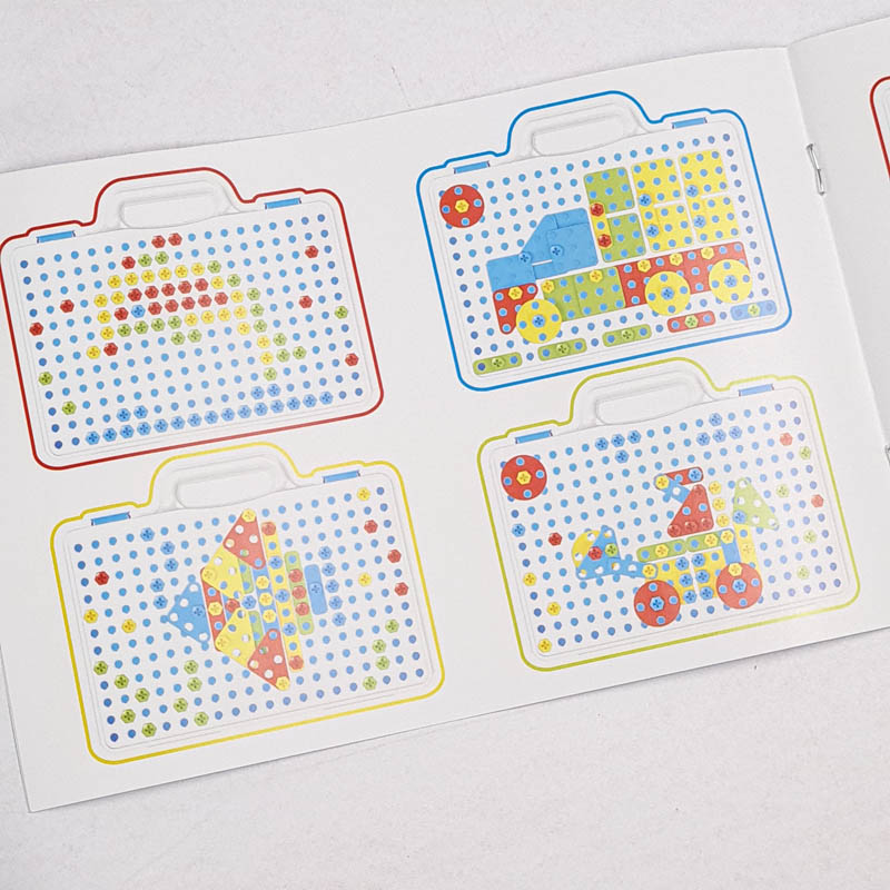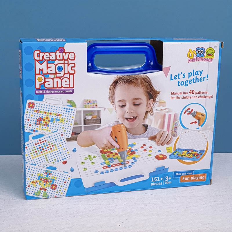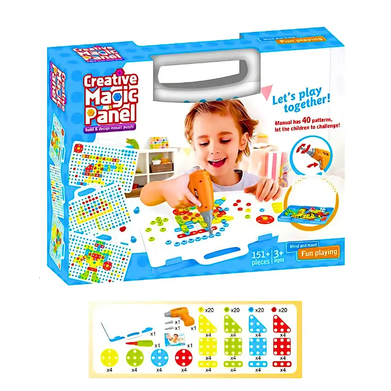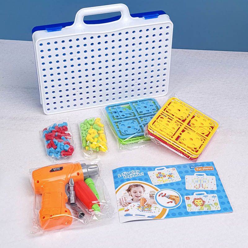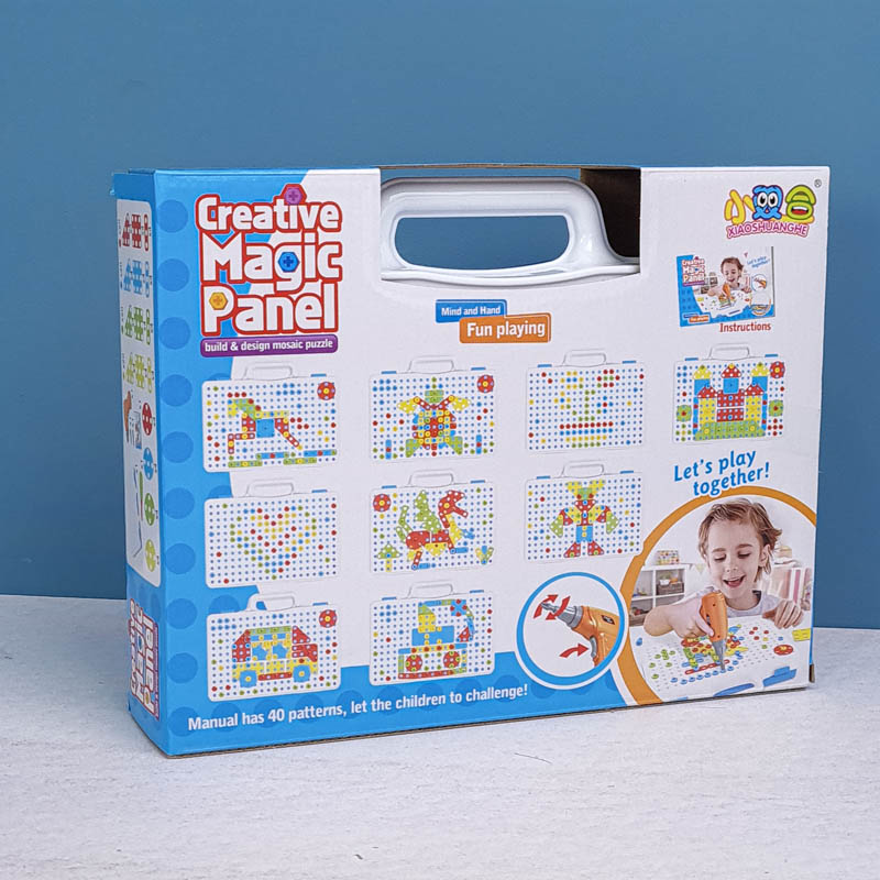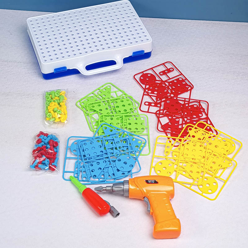 | اقلام همراه | 80 عدد پیچ رنگی، 16 عدد پترن مثلث، 16 عدد پترن مربع، 16 عدد پترن مستطیل، 16 عدد پترن دایره، دریل، پیچ گوشتی، دفترچه راهنما، صفحه بازی |